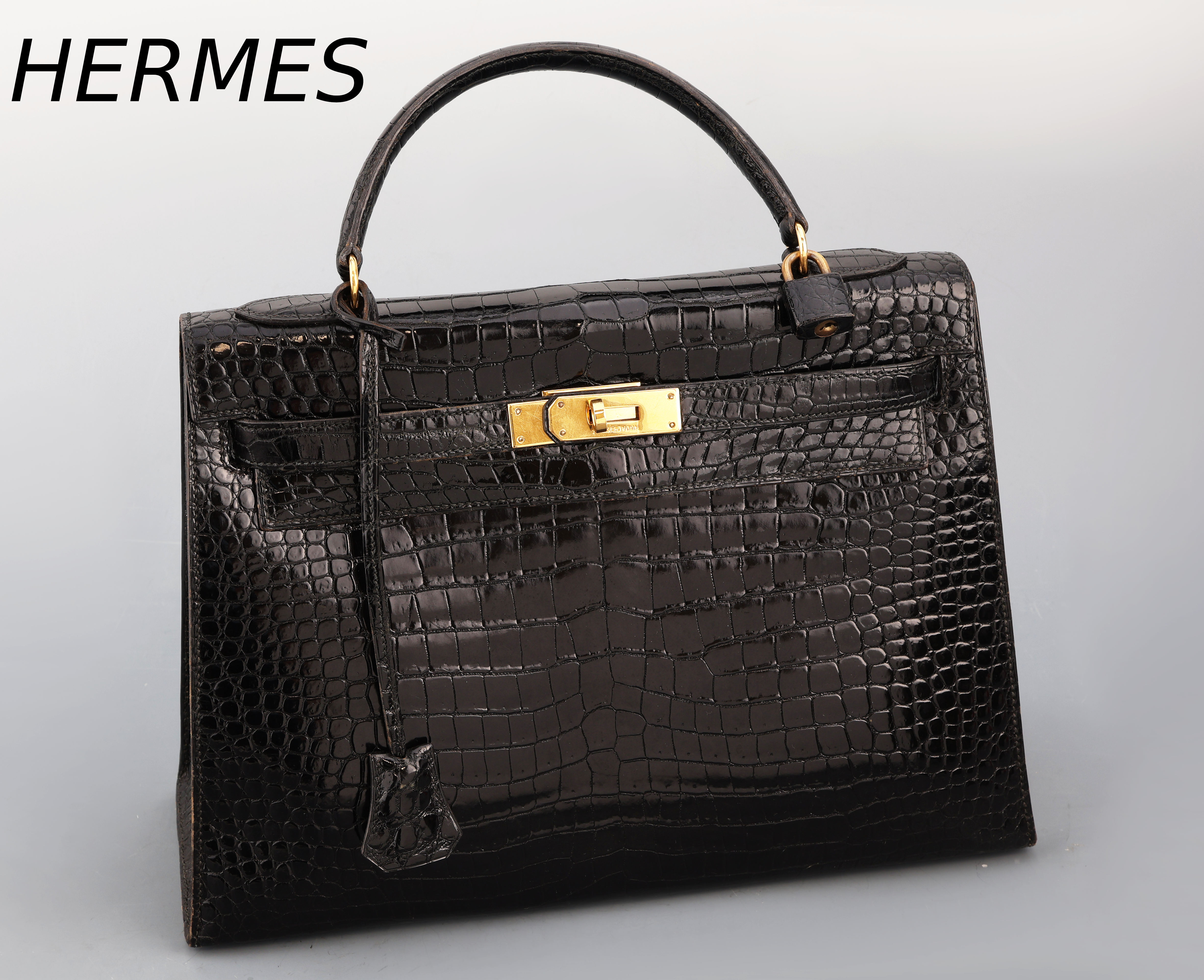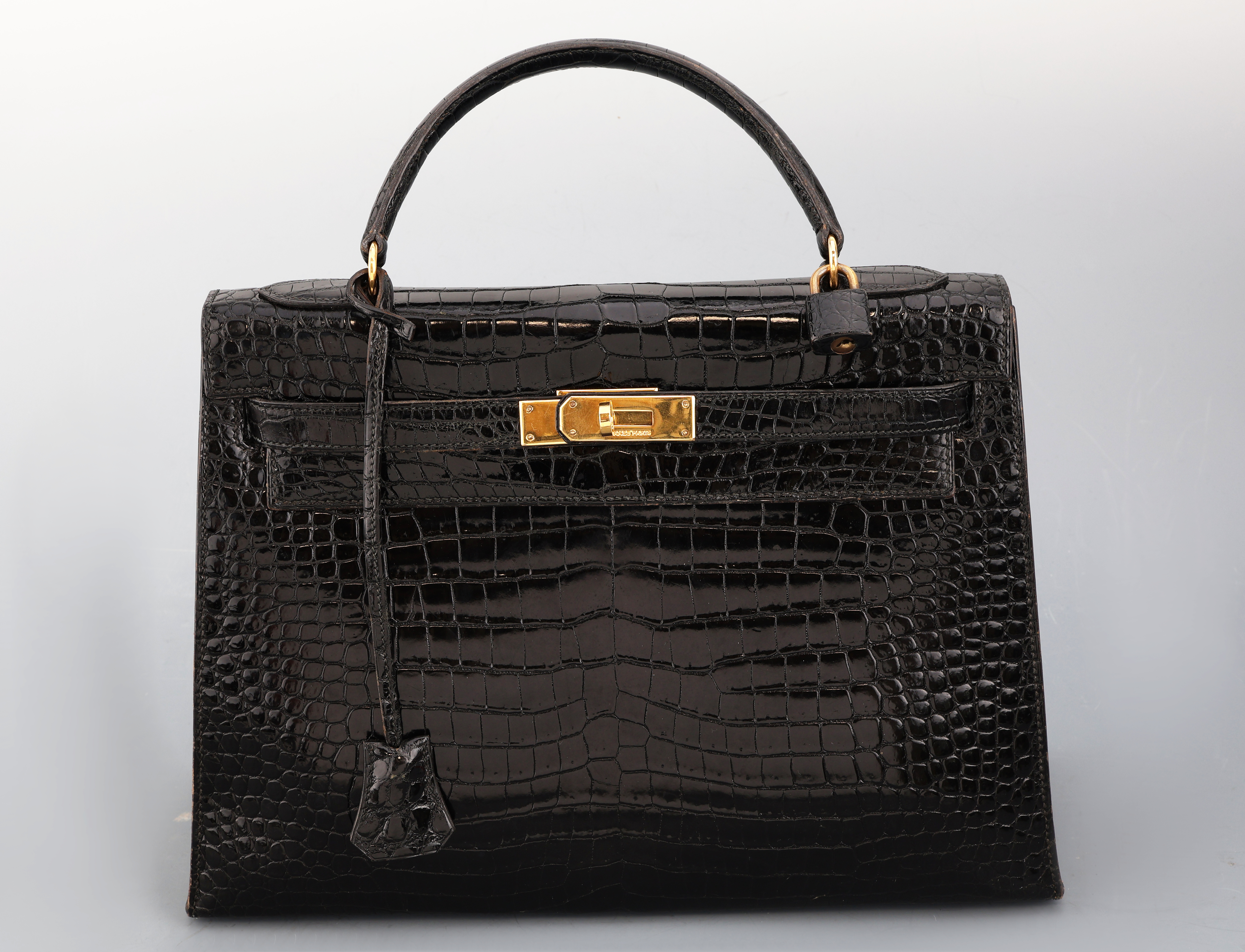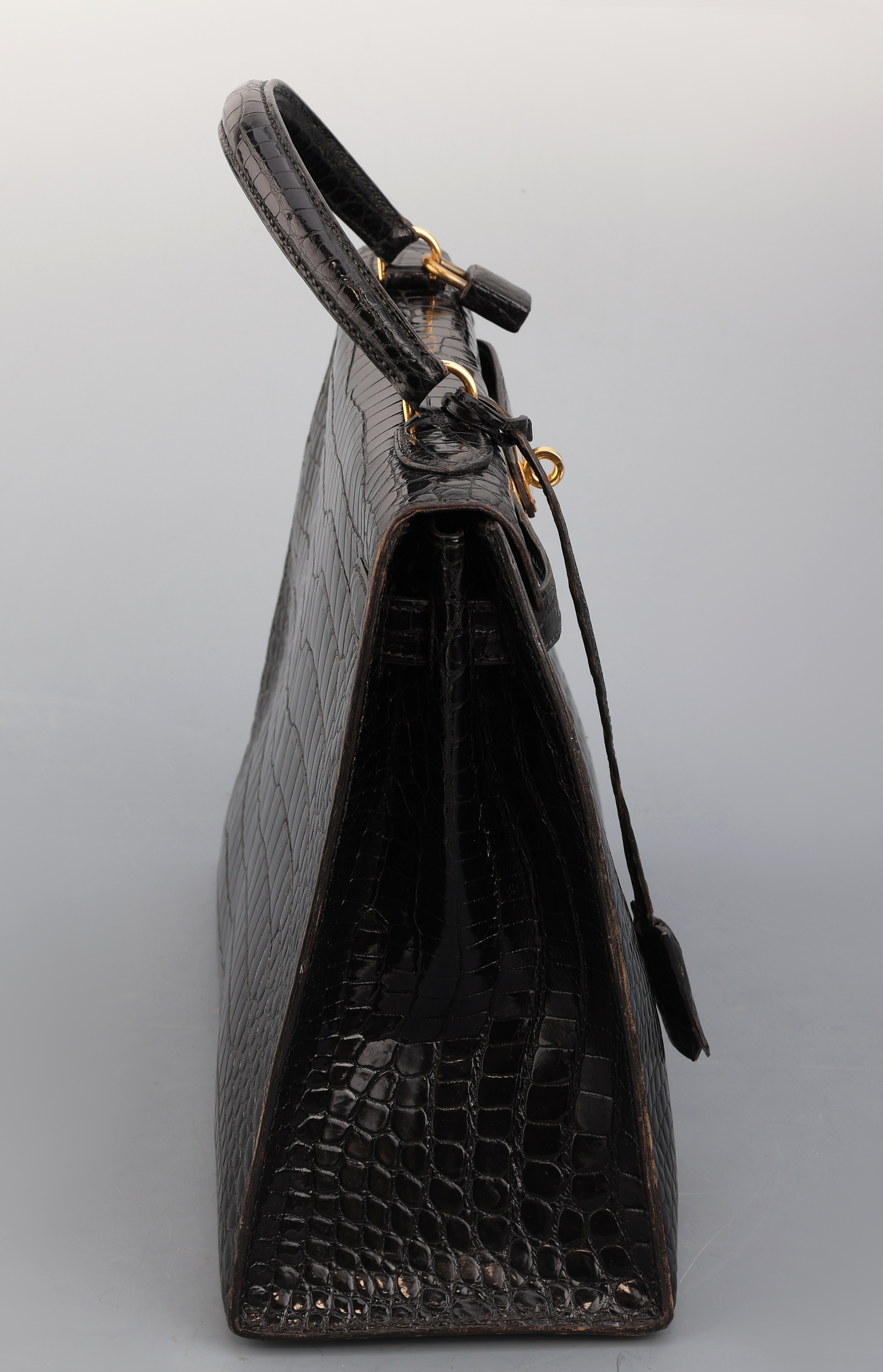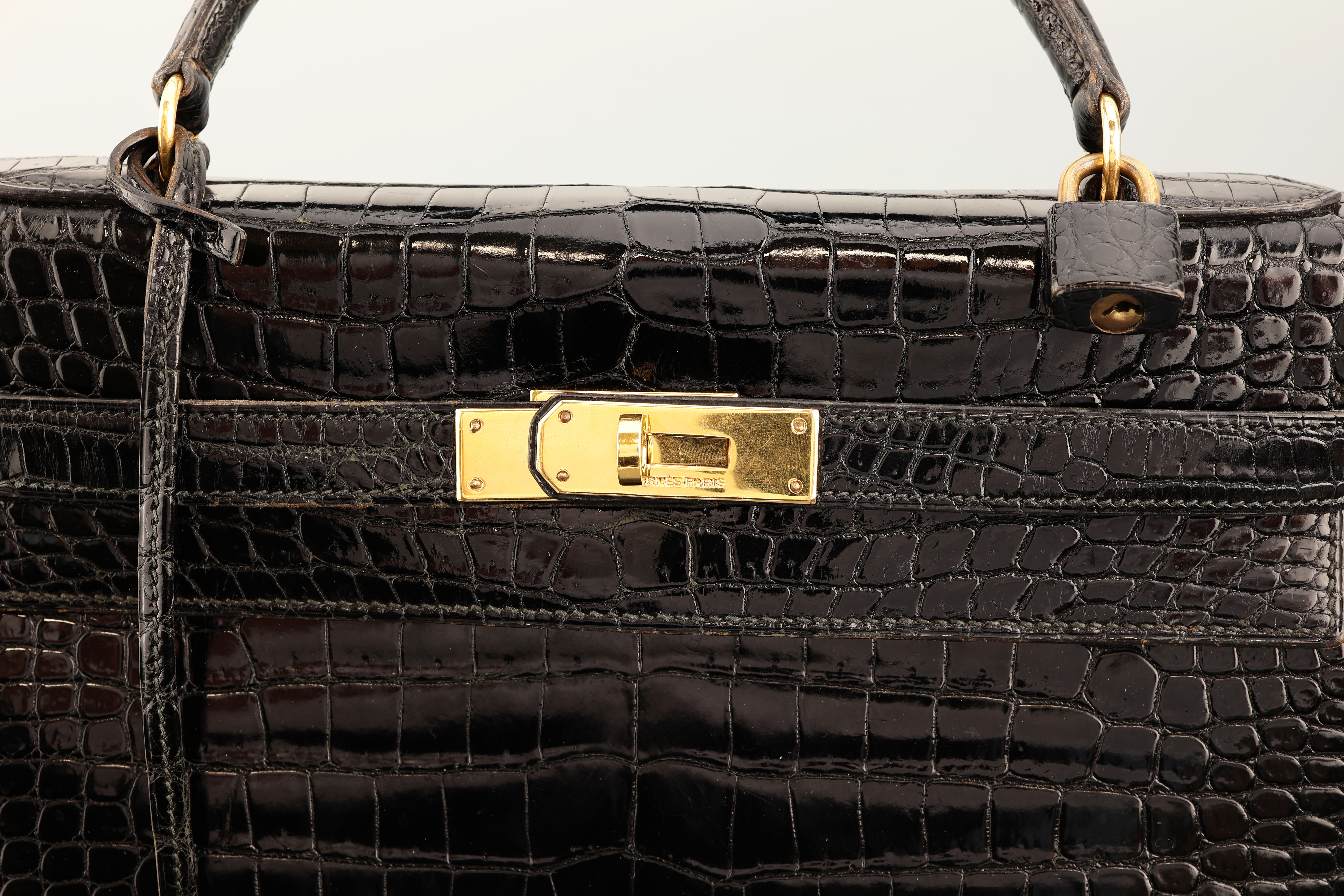 HERMES Kelly Bag 32, Shiny Porosus Crododile in Schwarz, 1978, Innenausstattung in
