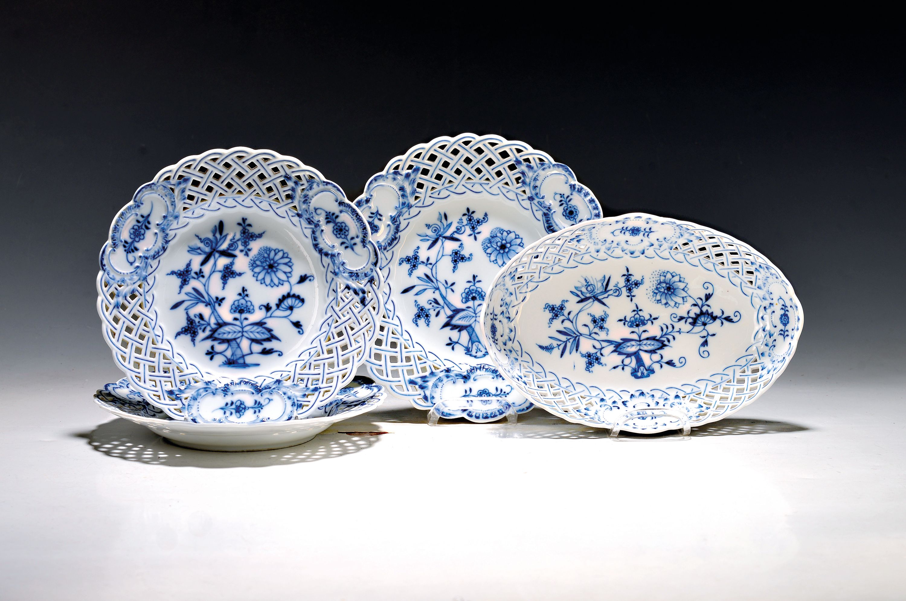 4 Teile Porzellan, Meissen, blaues Zwiebelmuster, Ränder in Durchbrucharbeit, 3