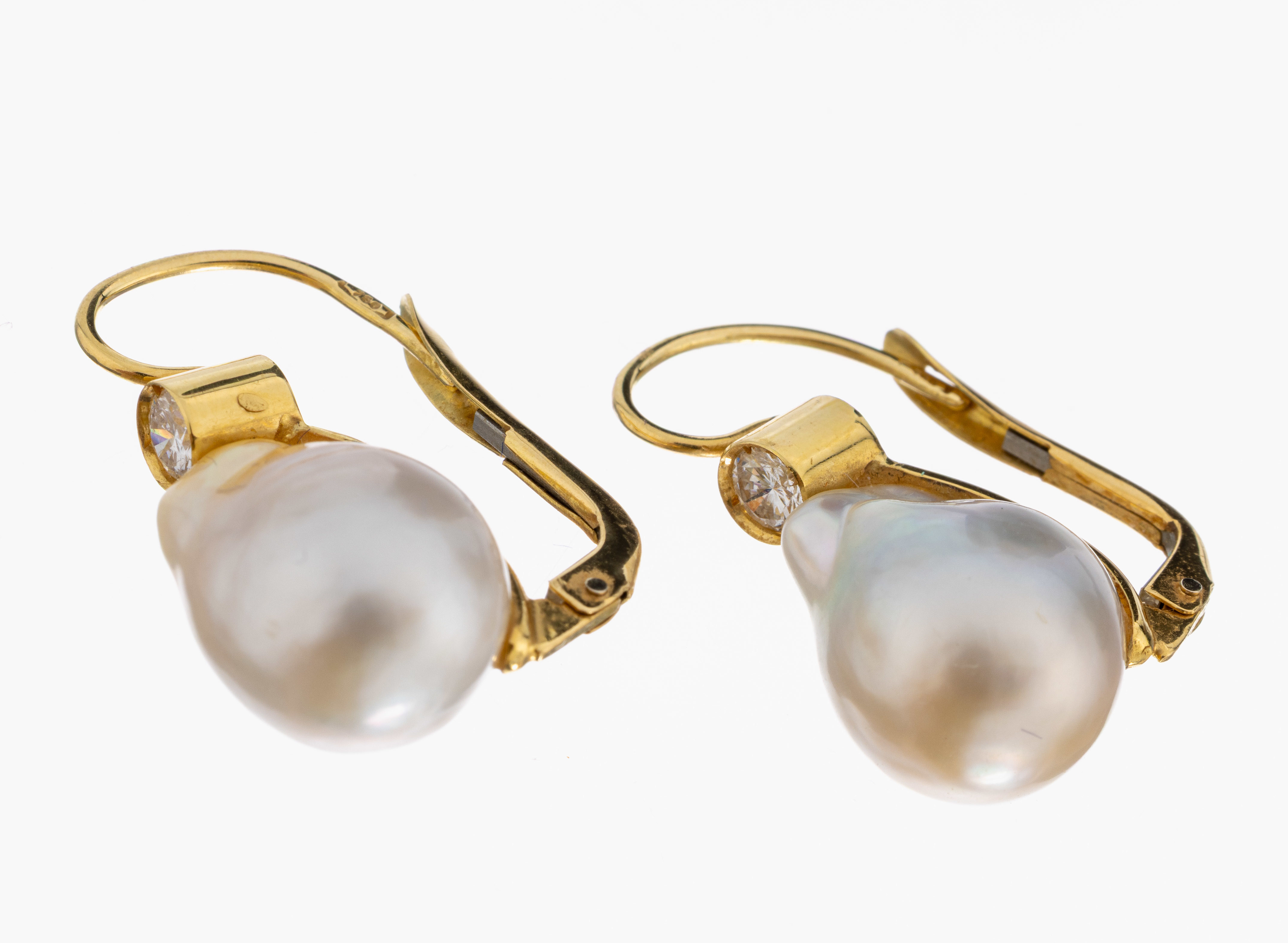 Paar 18 kt Gold Perl-Brillant-Ohrhänger, GG750/000, 2 unrunde Südseezuchtperlen,