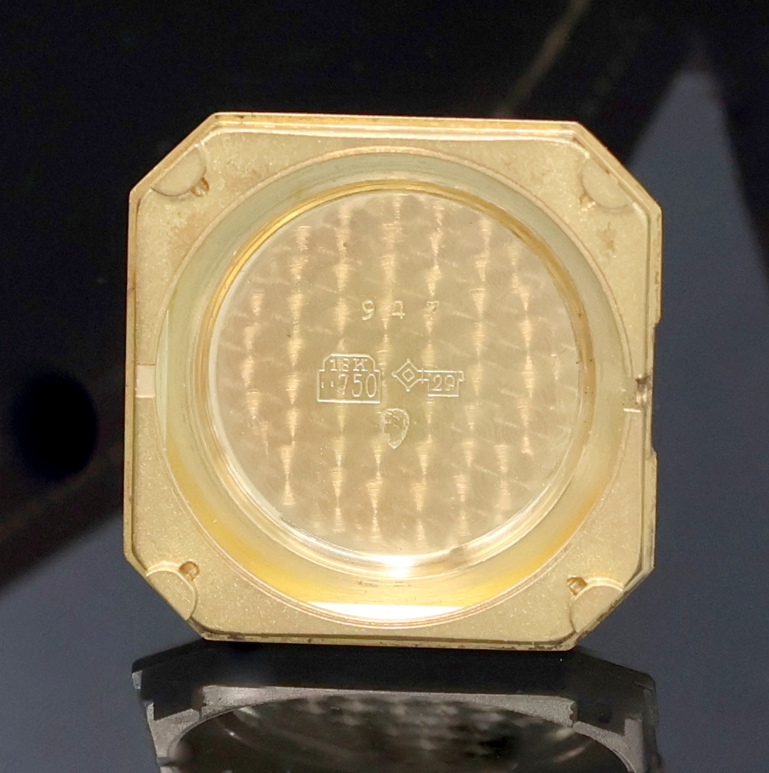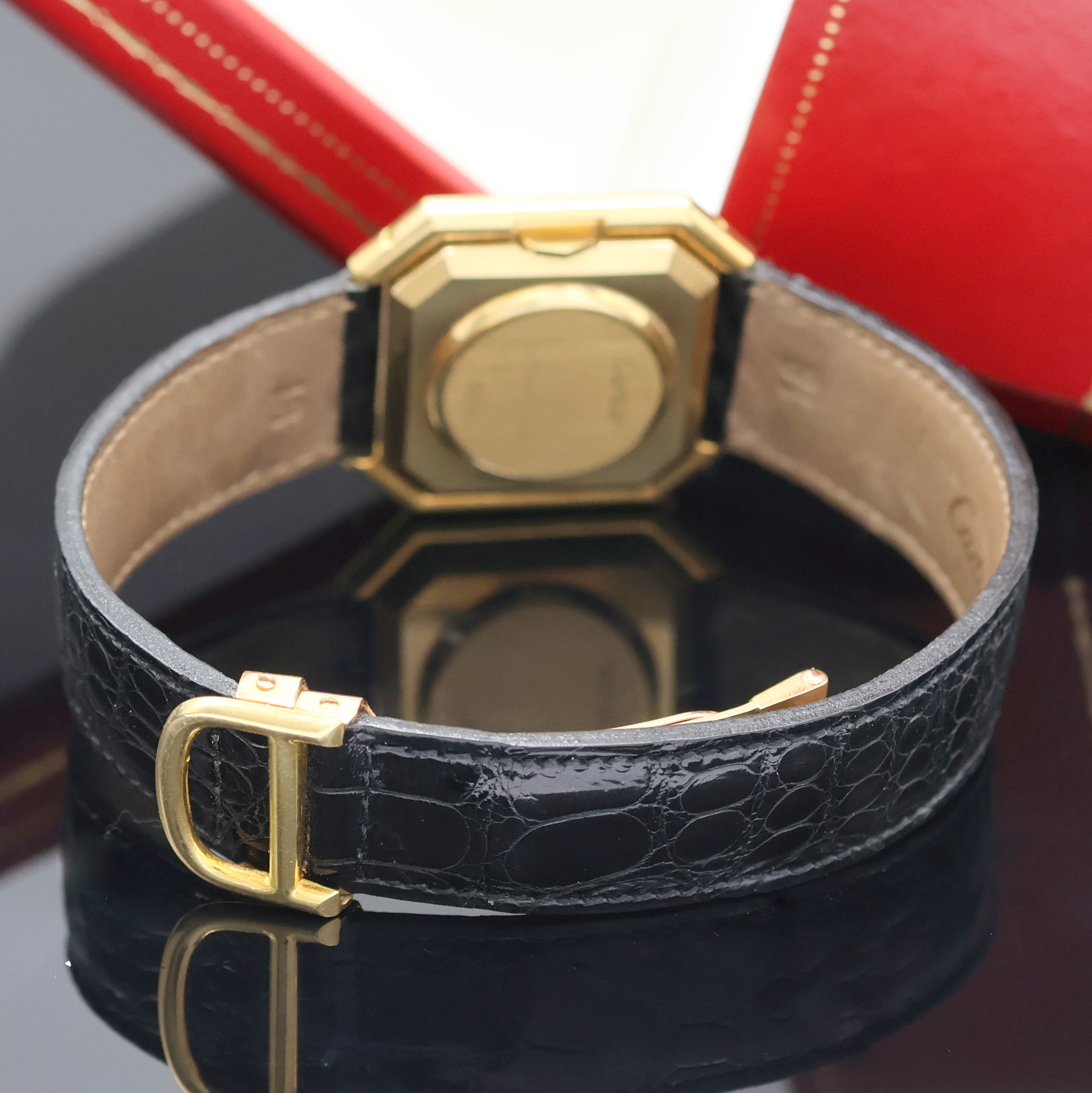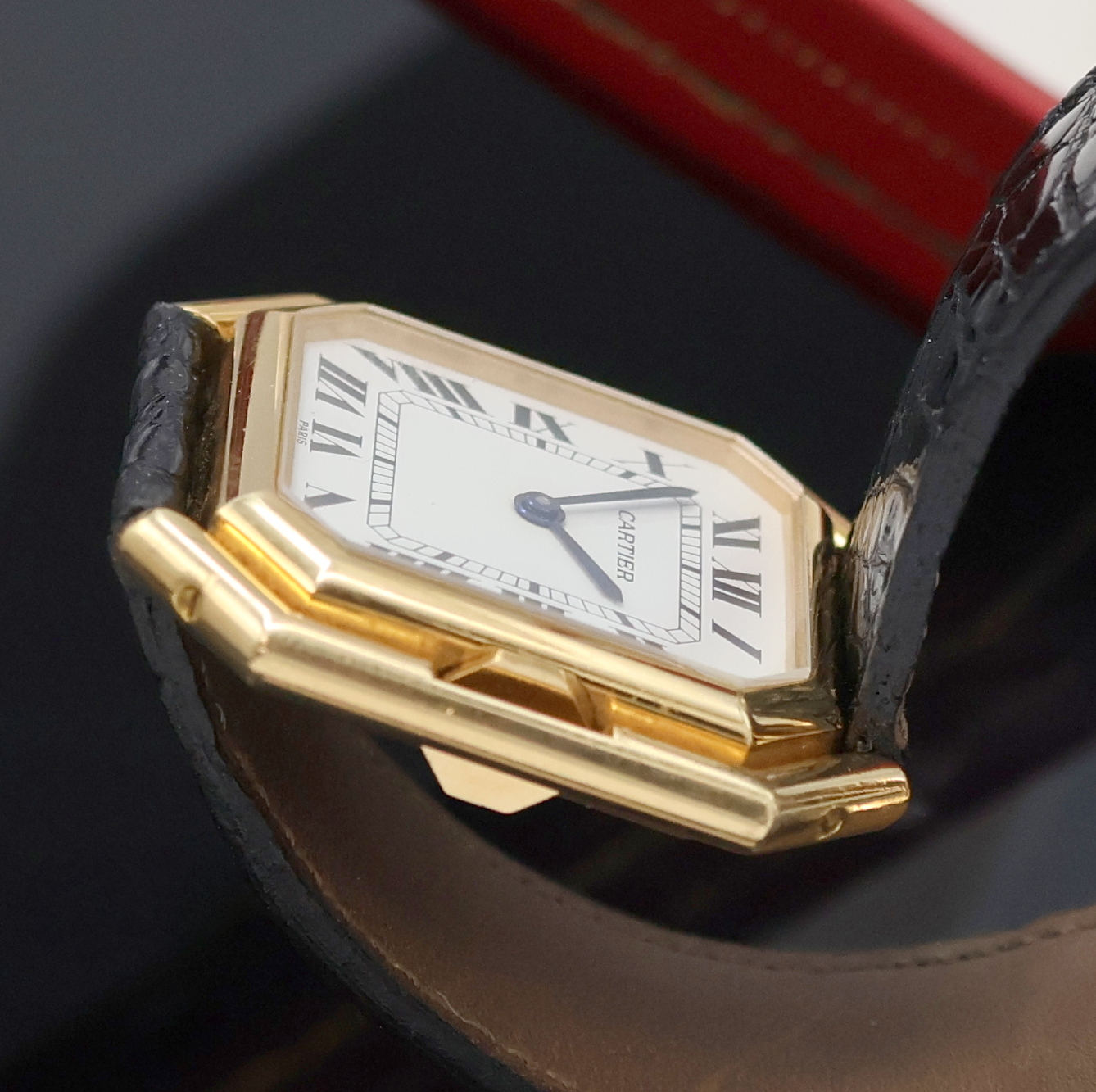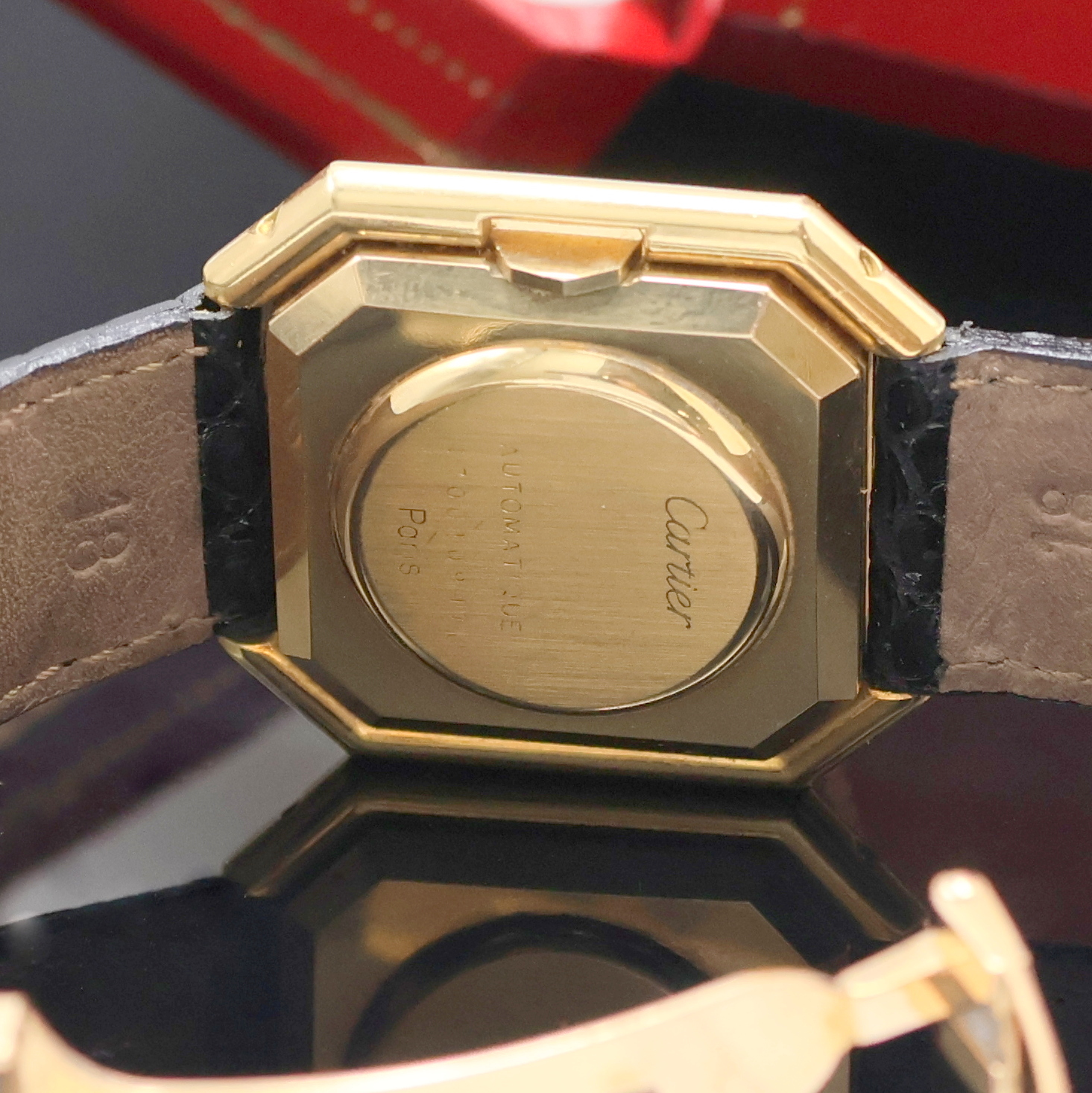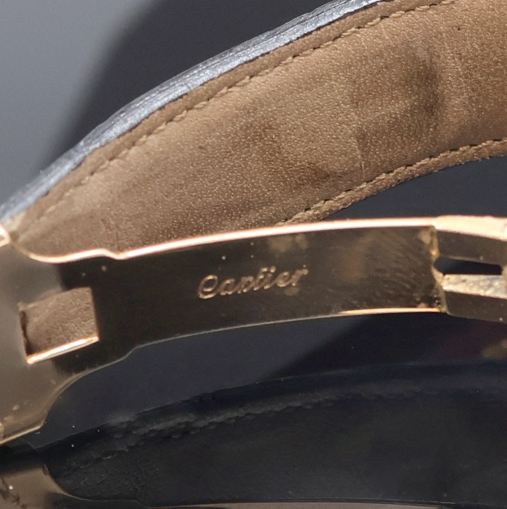 CARTIER Paris seltene, große Armbanduhr Ceinture "Jumbo", Automatik, Frankreich/Schweiz um 1970, Boden seitl. 4- fach verschr., orig. Lederband m. orig. GG 750/000 Faltschl., emailfarb. Zifferbl. m. röm. Std. zum Rand l. fl., gebl. Zeiger, Anz. v. Std. und Min., rhod. Rundankerw., 17 St., Basis ETA 2670, M. ca. 31 x 31 mm, Cartier Etui, EZ 2, aus Sammlungsauflösung