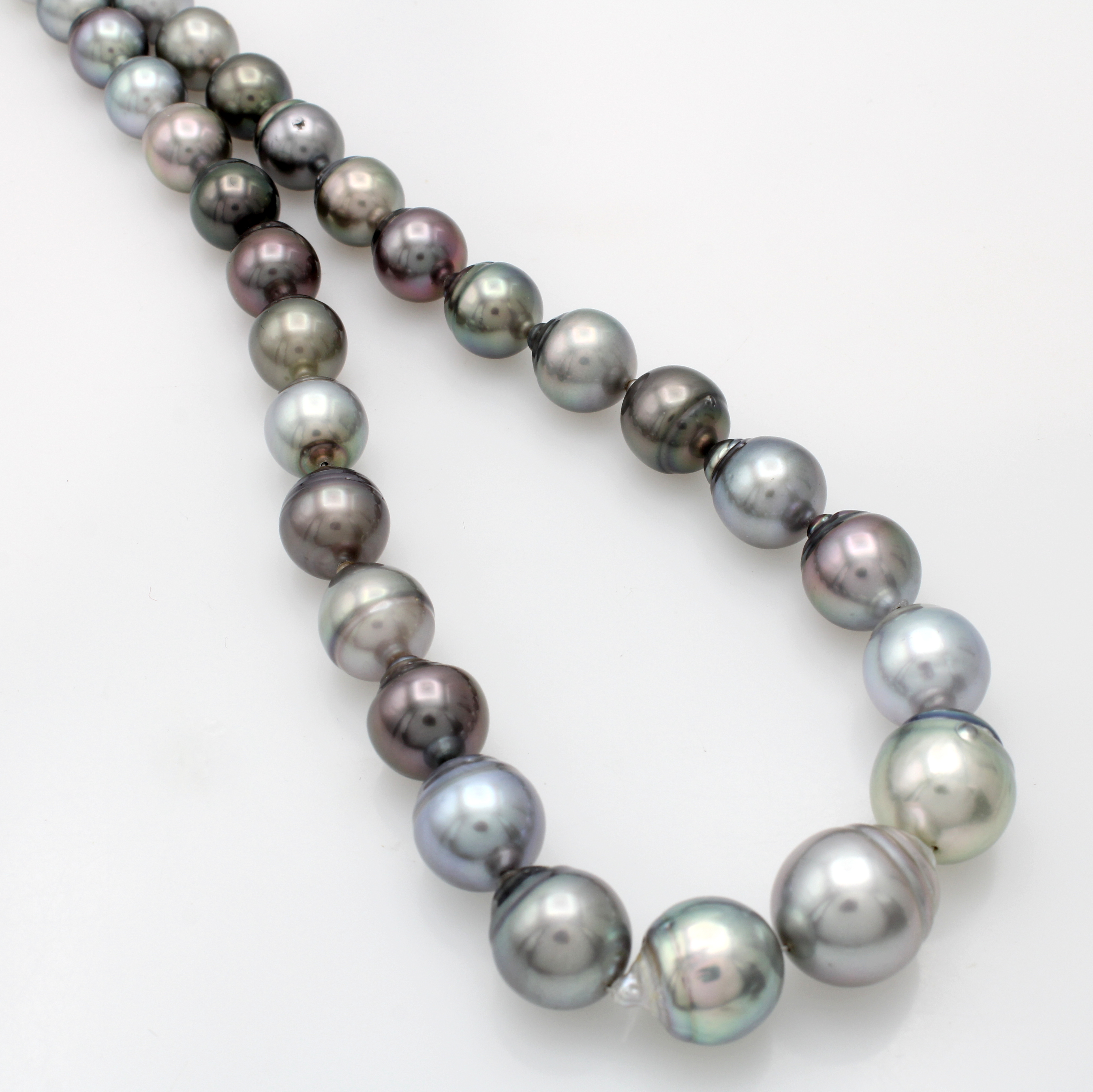 Tahitiperlstrang, verlaufende, barocke, silber- bis dunkelgraue Perlen, D. ca. 10.5- 14.5 mm, L. ca. 45 cm