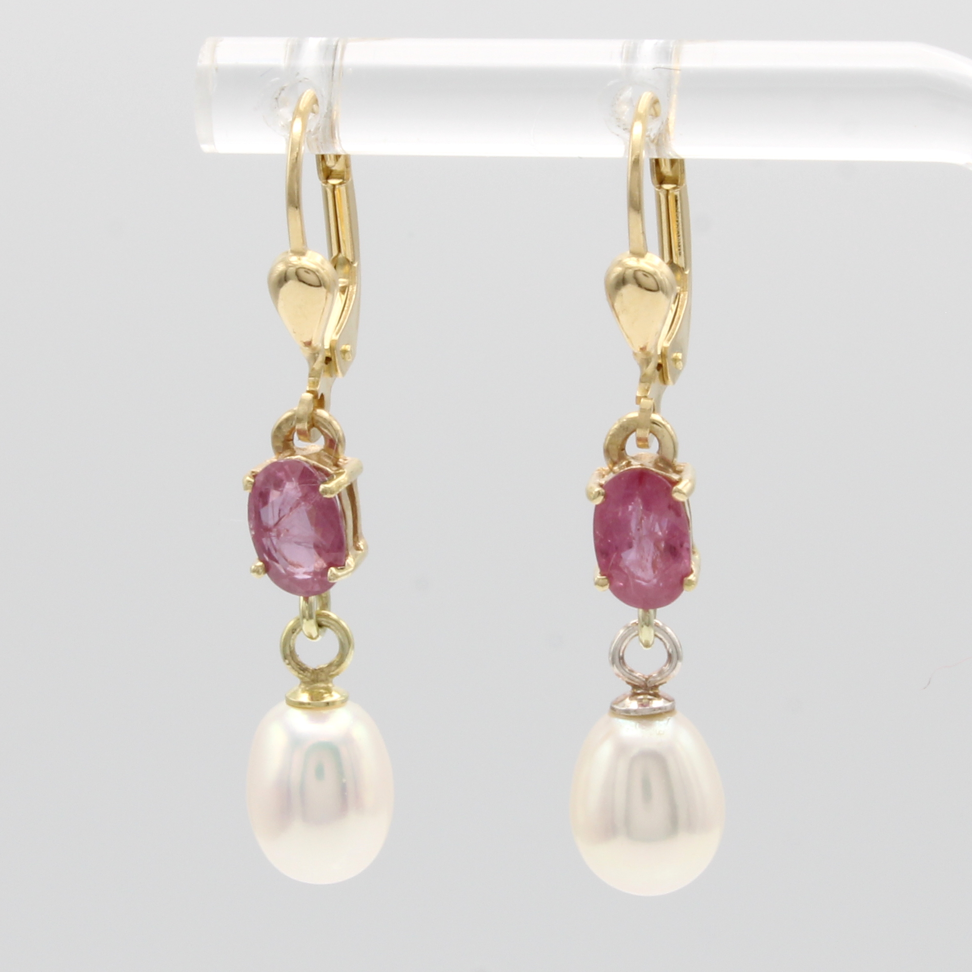 Paar Ohrgehänge mit Turmalinen und Süßwasser- zuchtperlen, GG 585/000, 2 ovale, rosa Turmaline, 2 tropfenf. Perlen Schätzpreis: 840, - EUR