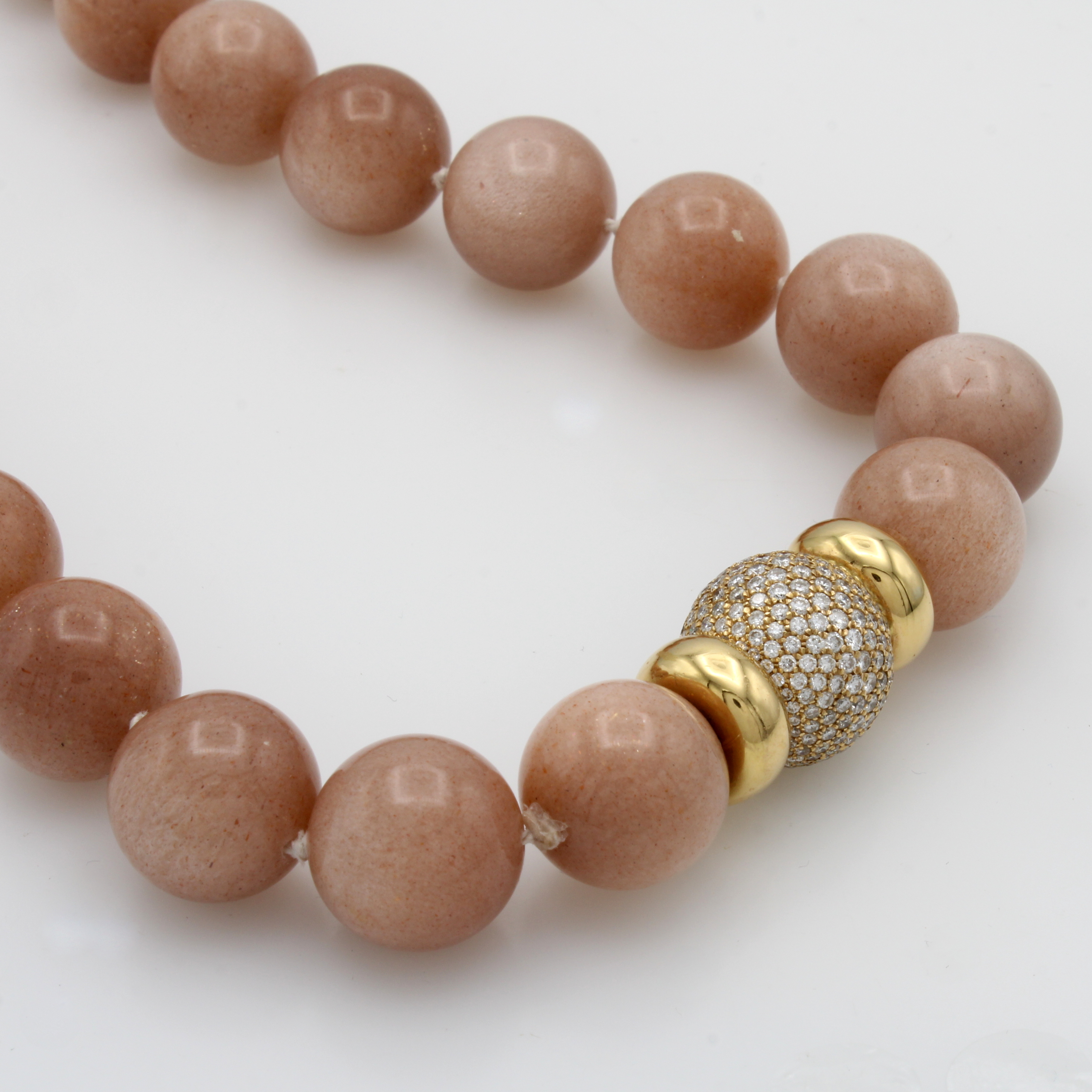 Mondsteincollier mit Brillantschließe, GG 750/000, Brill. zus. ca. 2.60 ct feines Weiß/ si, lachsfarb. natur Mondsteine D. ca. 14 mm, L. ca. 43.5 cm