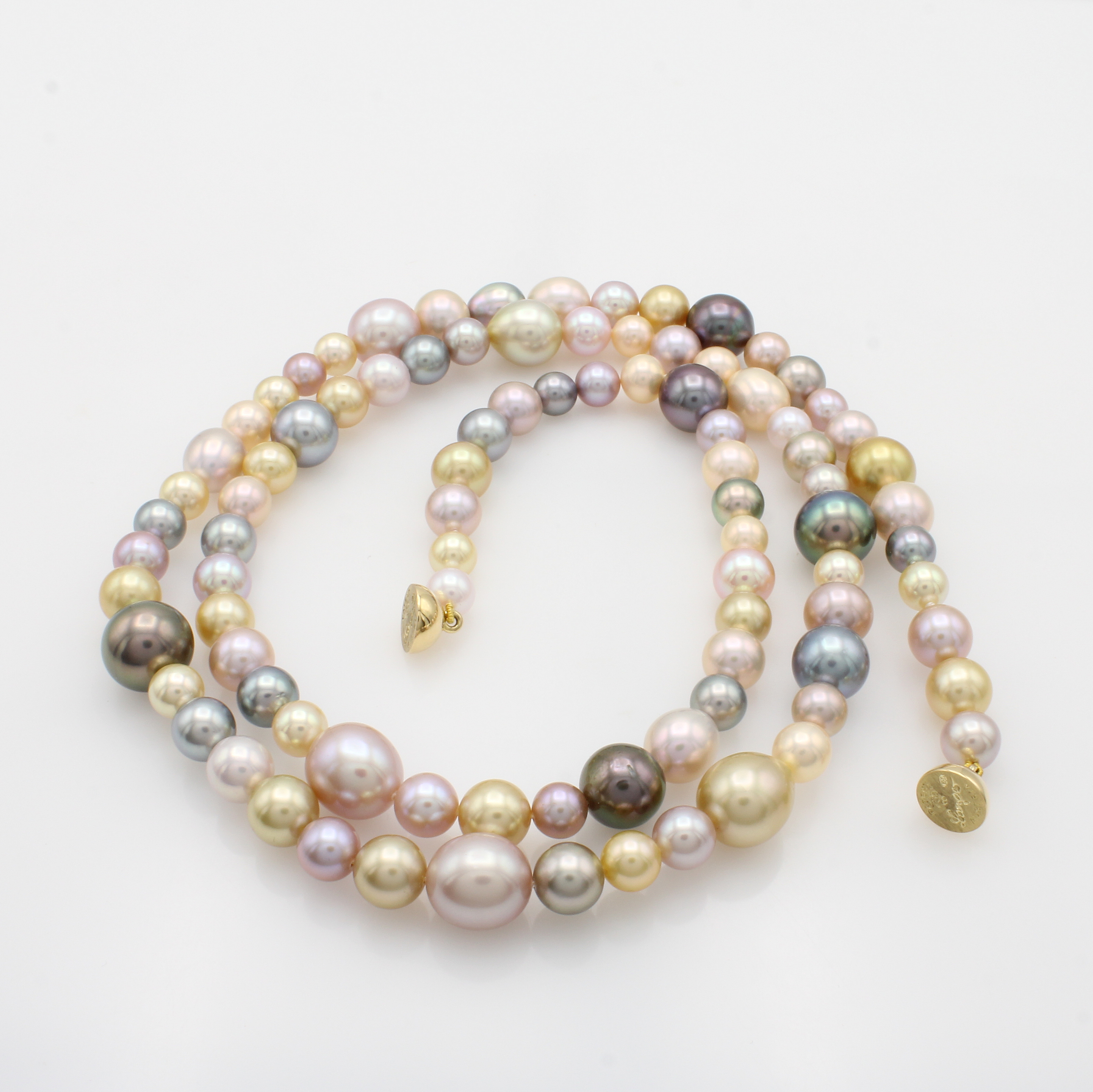 Perlcollier, Magnetschließe GG 750/000, mit feinen Tahitiperlen, D. ca. 11-14 mm, Akoya- perlen und Süßwasserperlen, L. ca. 83 cm, auch 2-reihig zu tragen