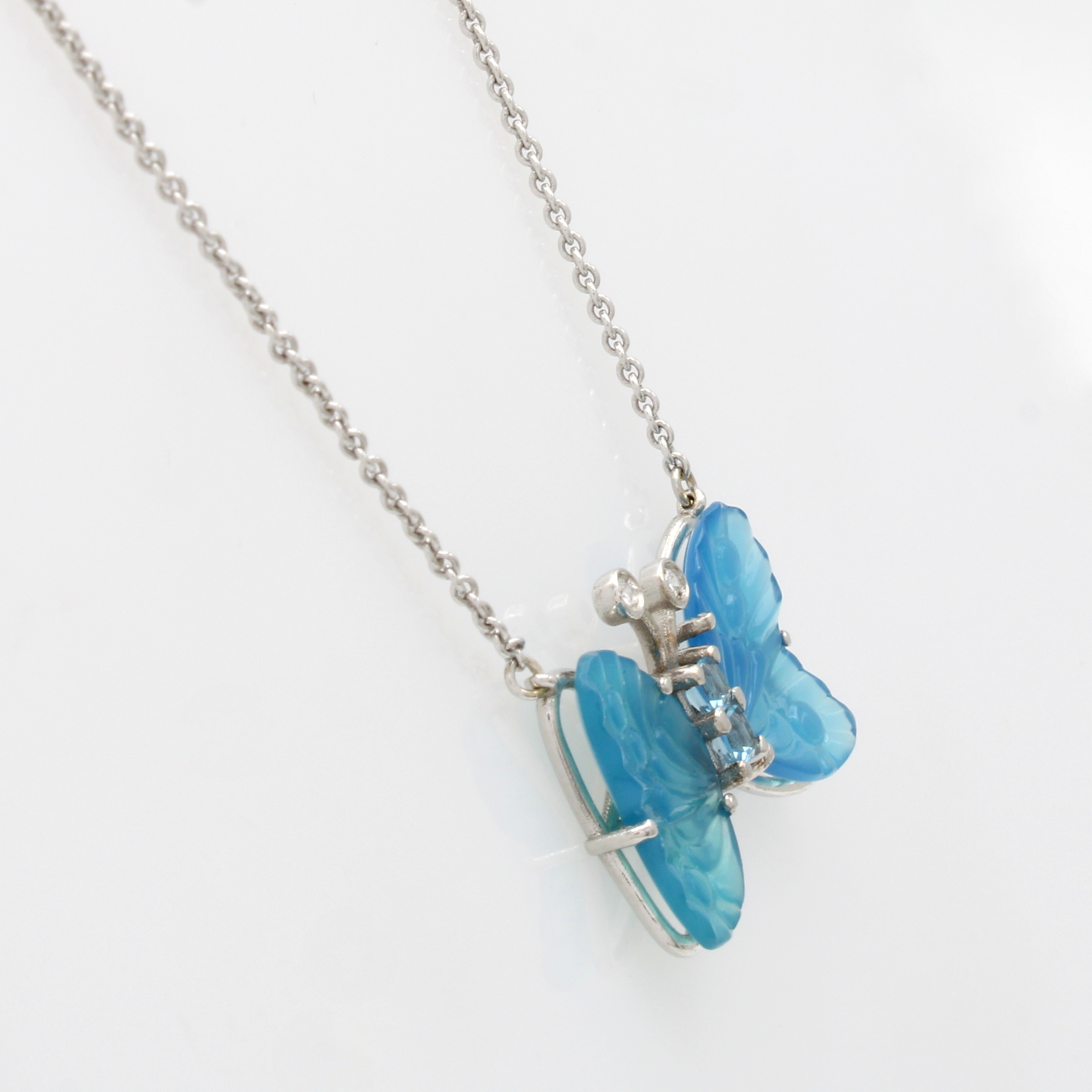 Collier "Schmetterling" mit Topasen und Bril- lanten, WG 750/000, Schmetterling aus ge- schnittenem Achat, Topas ca. 0.25 ct (beh.) u. Brill. zus. ca. 0.03 ct feines Weiß/si, L. ca. 40 u. 44 cm
