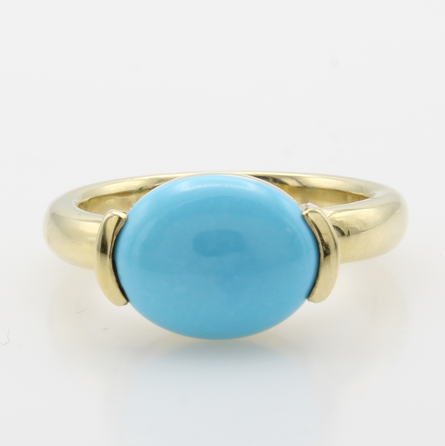 Ring mit Türkis, GG 585/000, ovaler Türkis ca. 12x10 mm in Halbzarge gef., RW ca. 56 Schätzpreis: 1540, - EUR