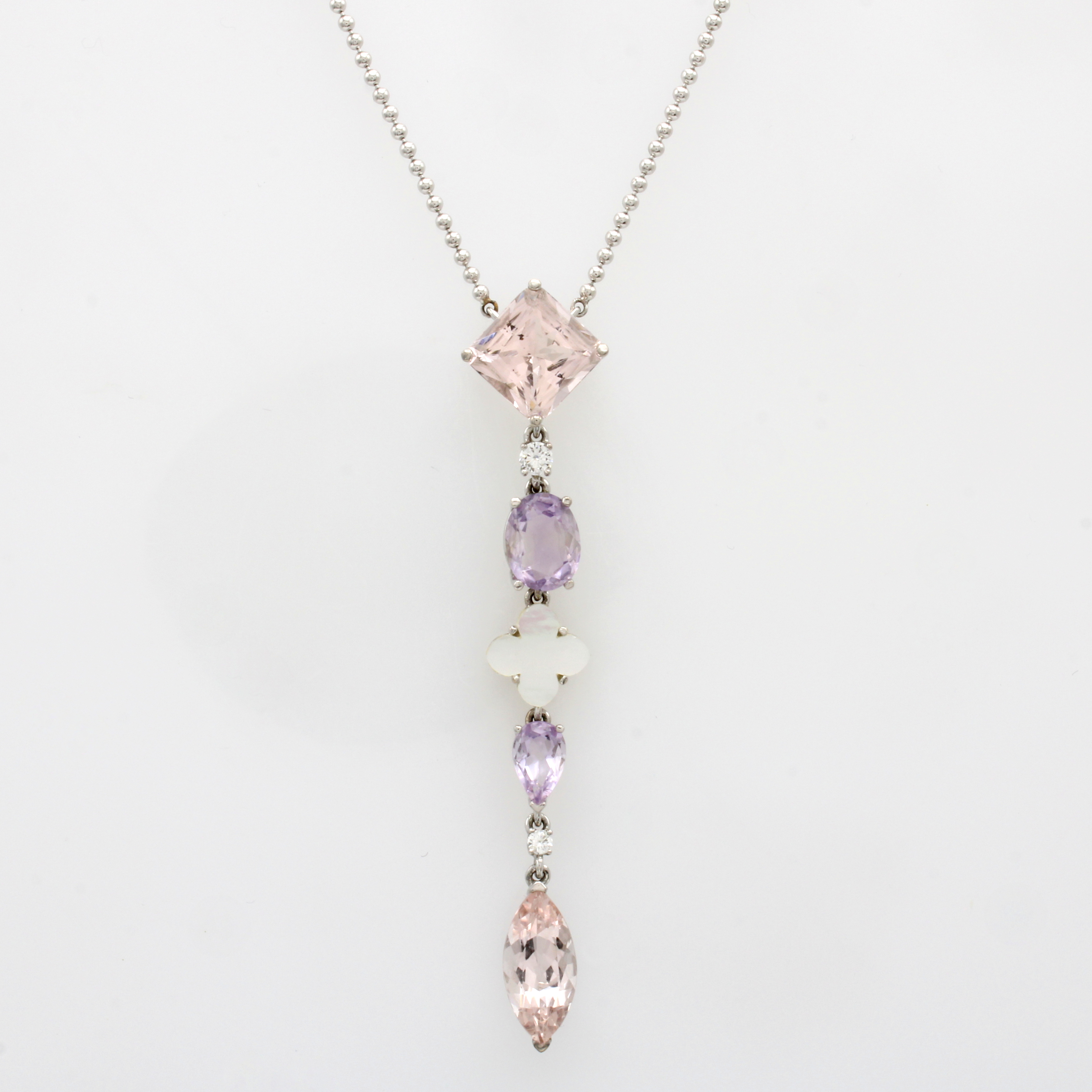 Collier mit Morganiten, Amethysten und Perl- mutt, WG 750/000, Morganite zus. ca. 6.2 ct, Amethyste zus. ca. 2.45 ct, Kugelkette, L. ca. 42 u. 43 cm