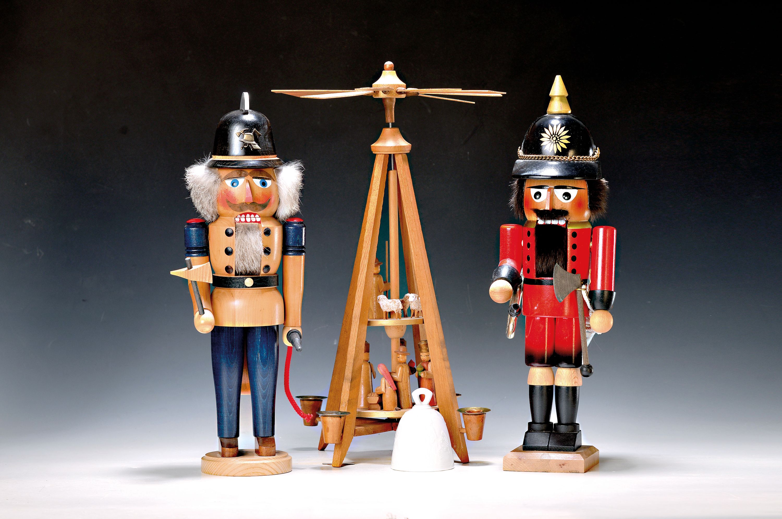 Könige, oben: Schäfer mit Tieren, H. ca. 43 cm; Nussknacker in Form von zwei Feuerwehrmännern,