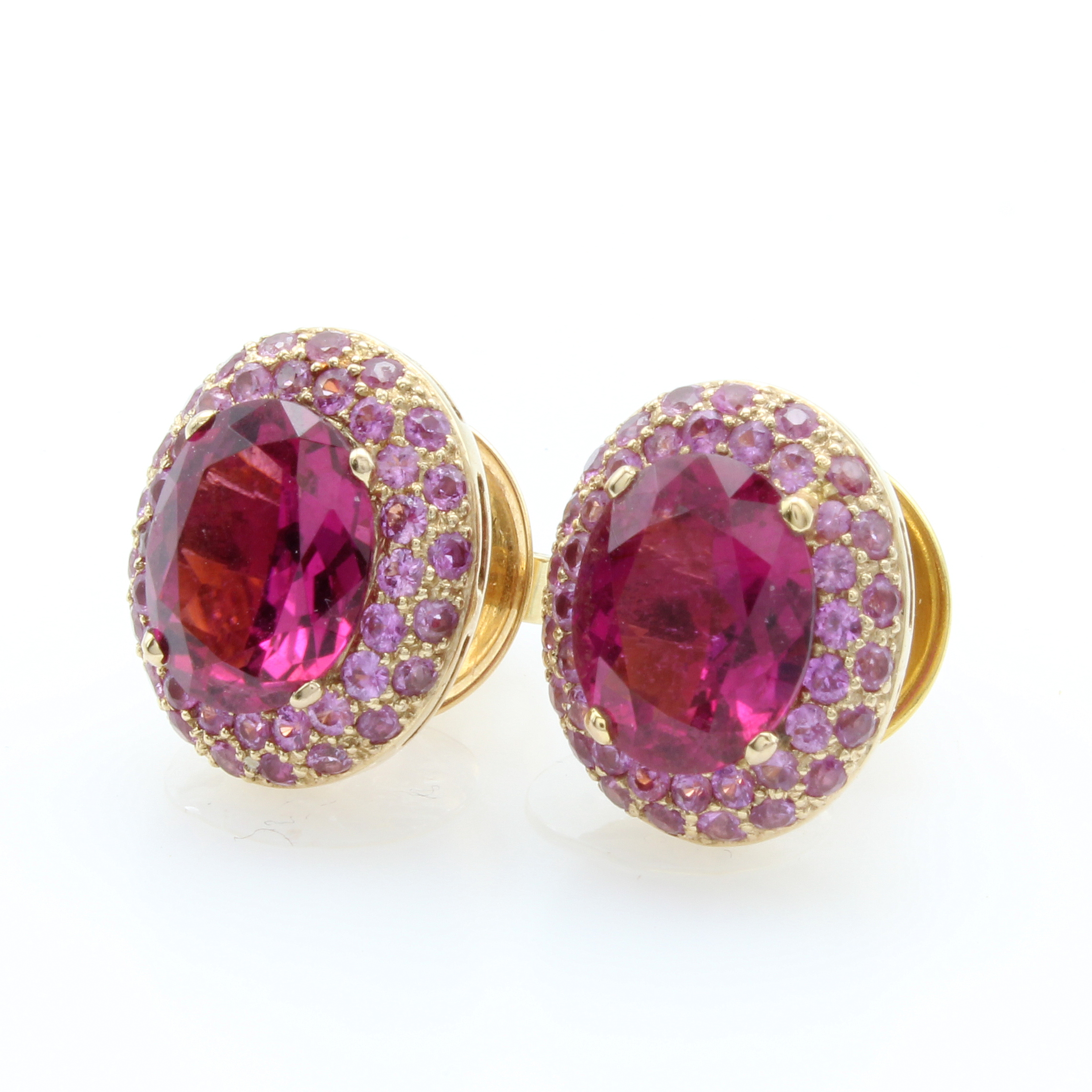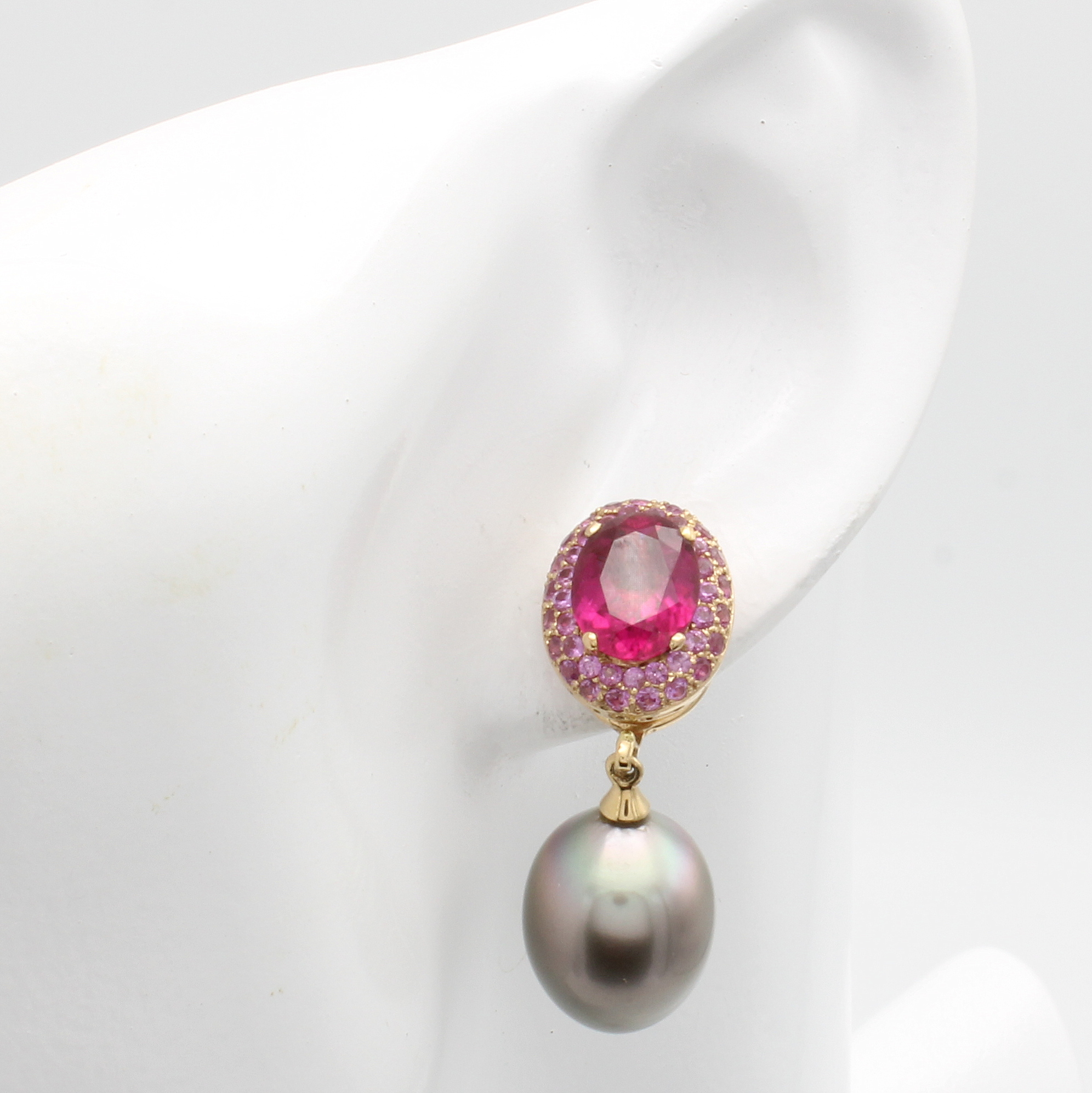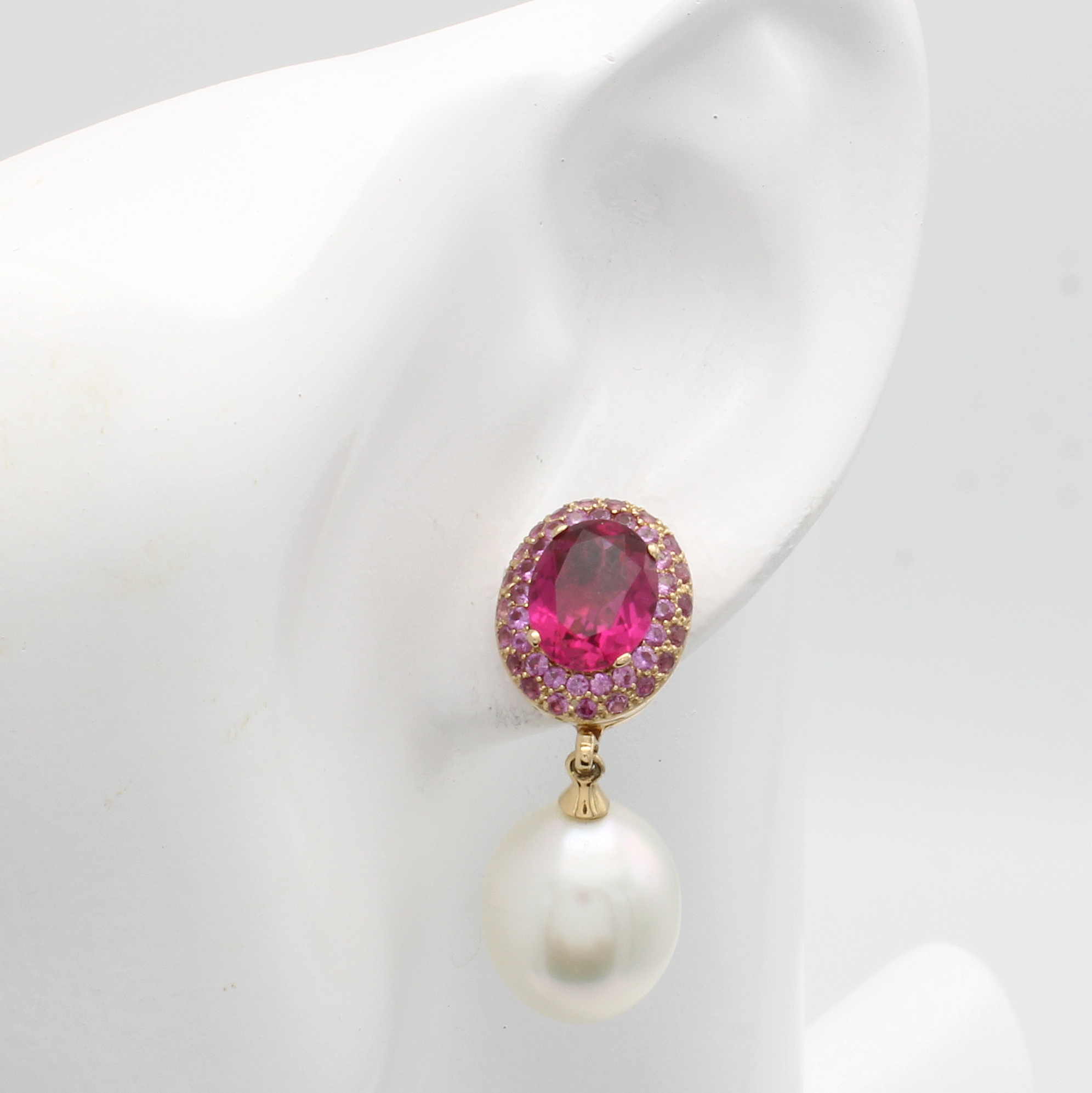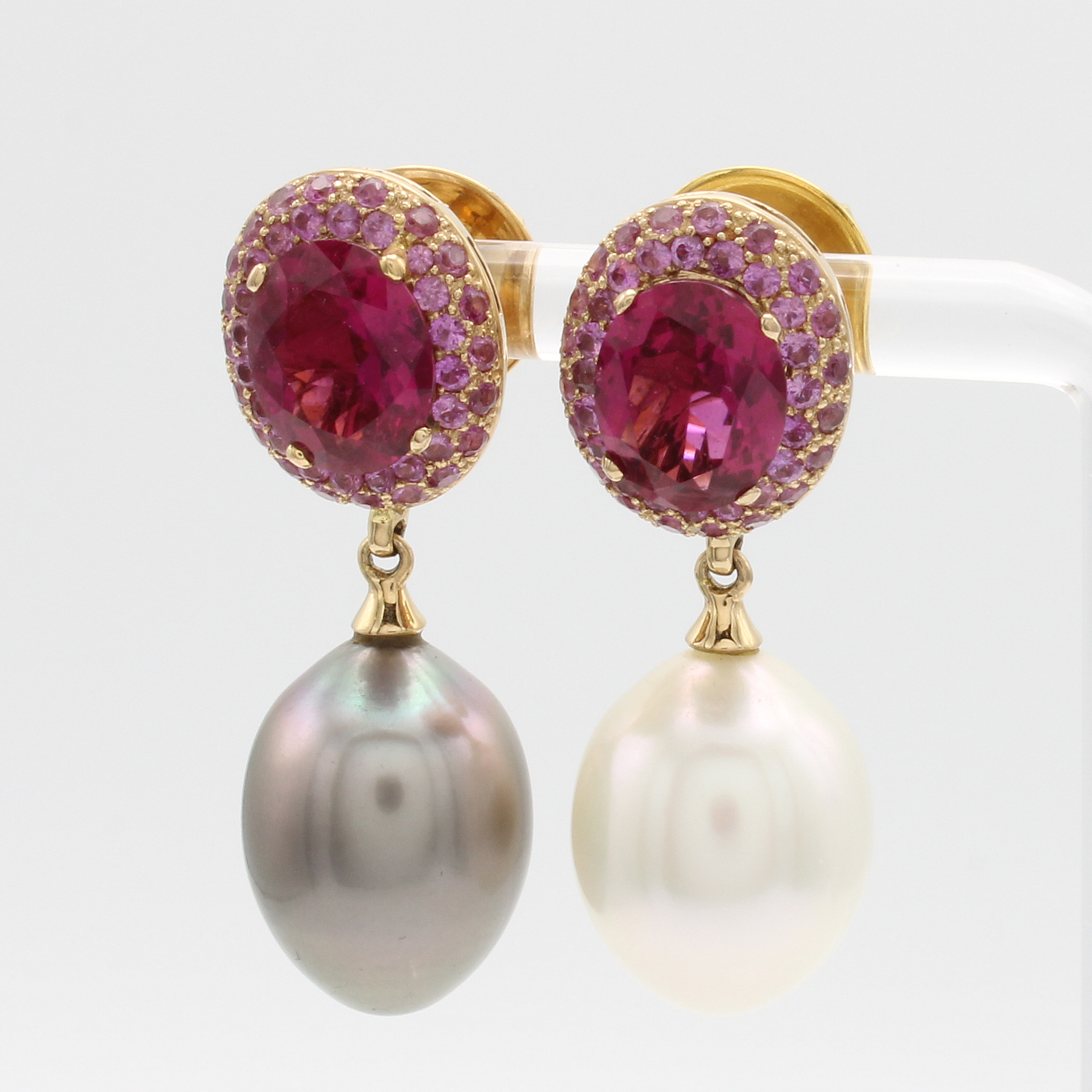 Paar Ohrgehänge mit Südsee- u. Tahitiperle, Rubelliten und Saphiren, RG 750/000, 2 Rubellite zus. ca. 4.56 ct, 80 pinkf. Saphire zus. ca. 1.55 ct und je eine Südseeperle und Tahitiperle, M. ca. 13x16.5 mm, abnehmbar