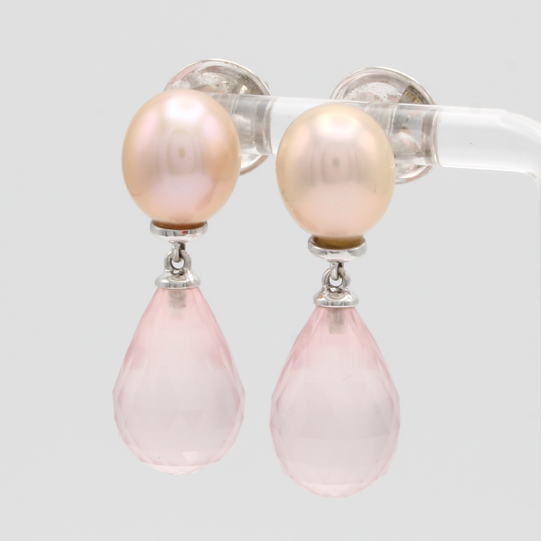 Paar Ohrgehänge mit Rosenquarzen und Süßwasserperlen, WG 750/000, facett. Rosenquarzpampeln zus. ca. 24.56 ct, 2 tropfenf., aprikotfarb. Perlen