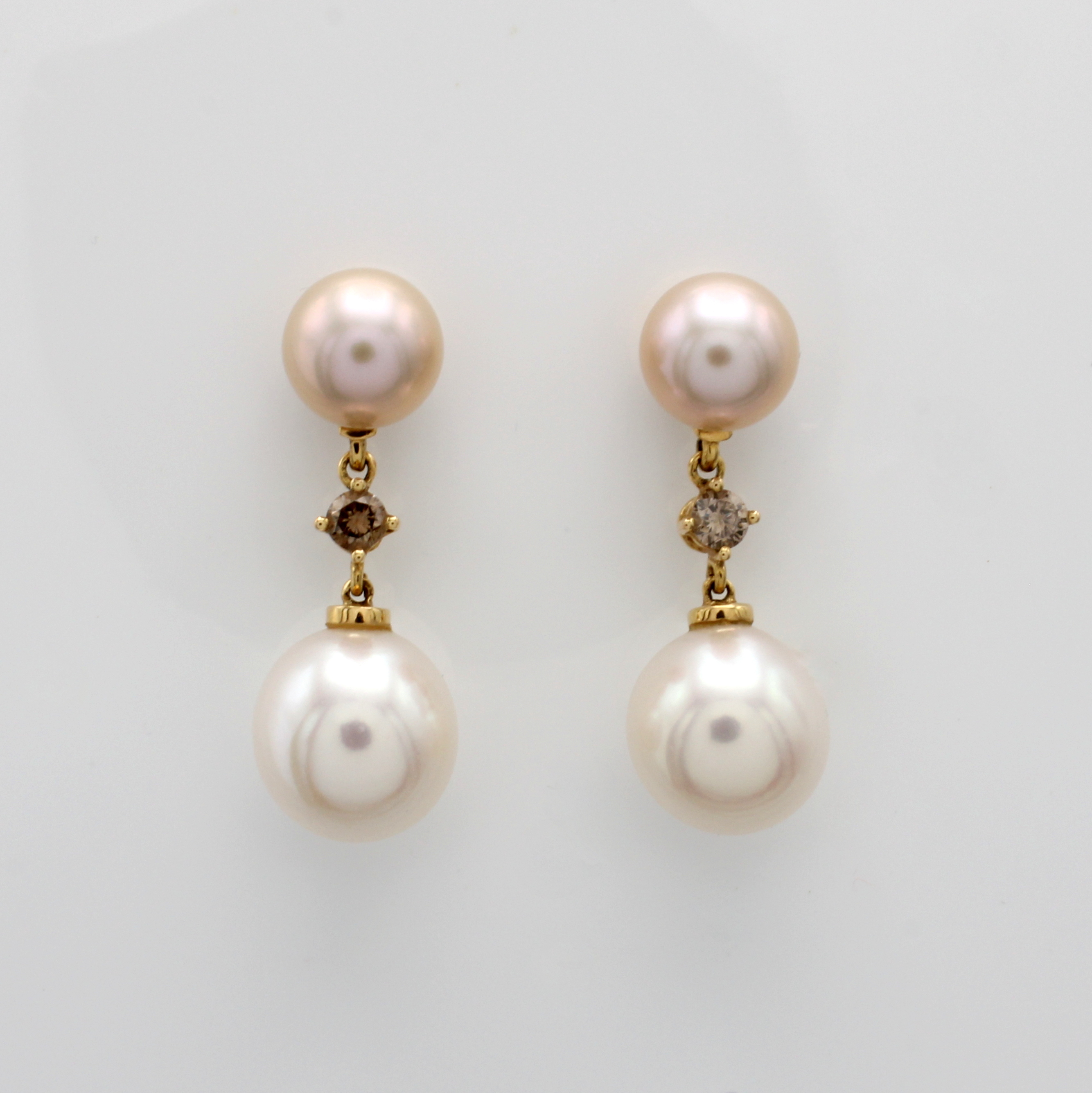 Paar Ohrgehänge mit Südseeperlen, Akoyaperlen und Brillanten, RG 750/000, 2 Brill. zus. ca. 0.33 ct braun (nat.)/si, Perld. ca. 9 u. 11.5 mm