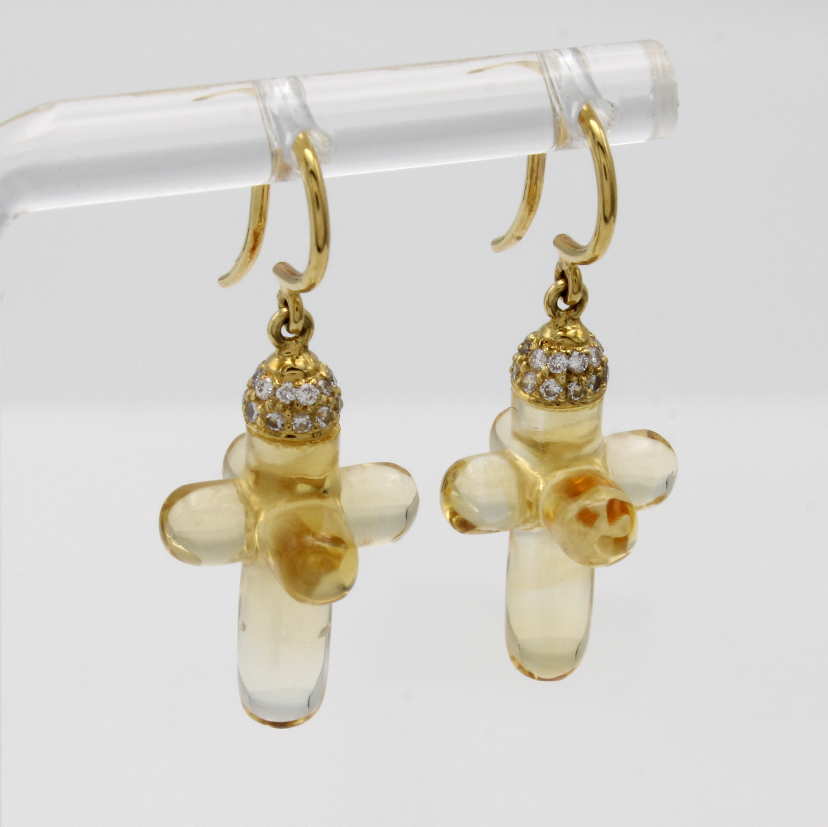 Paar Ohrgehänge mit Citrinen und Brillanten inForm von Rundkreuzen, GG 750/000, Brill. zus. ca. 0.14 ct feines Weiß/si, Citrine aus einem Stück geschliffen zus. ca. 14.2 ct