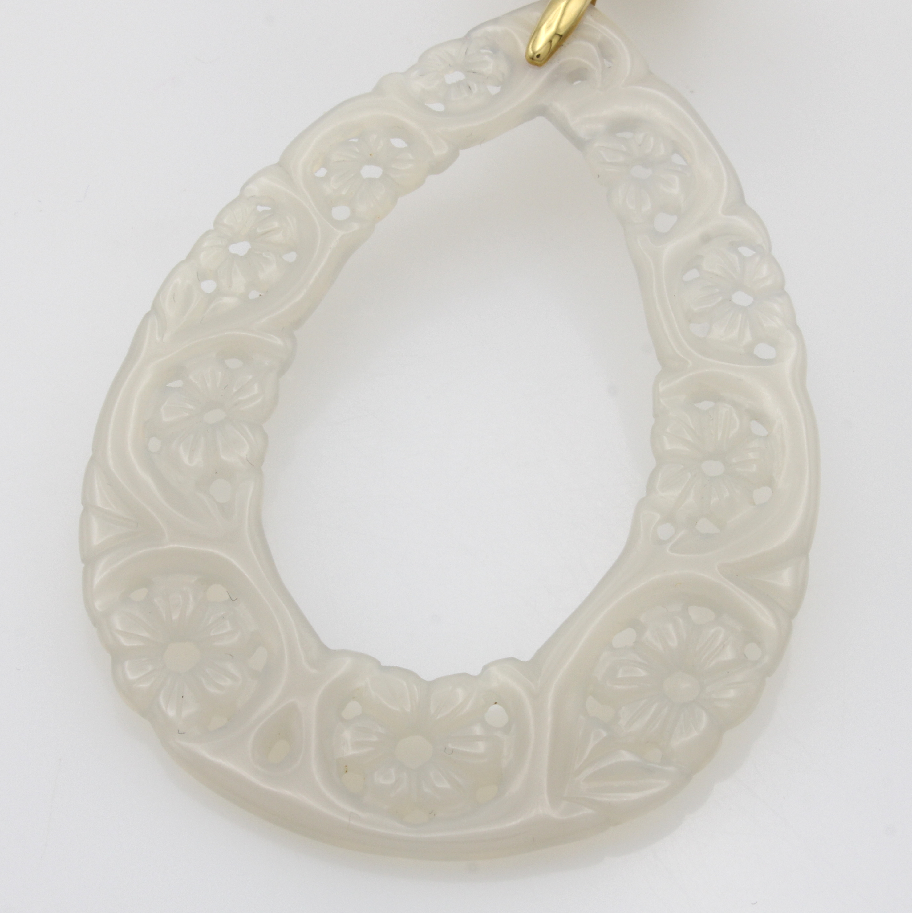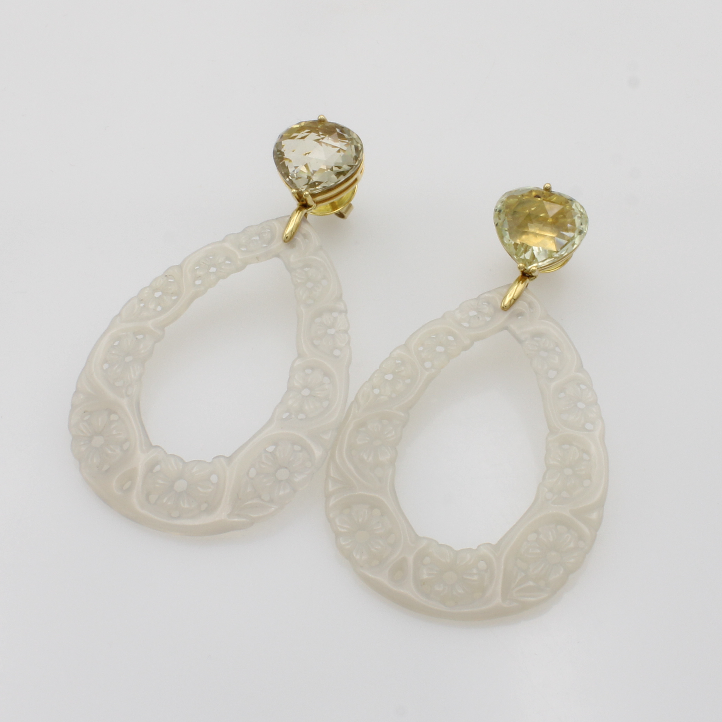 Paar Ohrgehänge mit Calcedonen und Lemon- citrinen, GG 750/000, 2 herzförm. Citrine (beh.) zus. ca. 17.03 ct, tropfenförm. Calcedone mit floraler Verzierung und Durchbrucharbeit