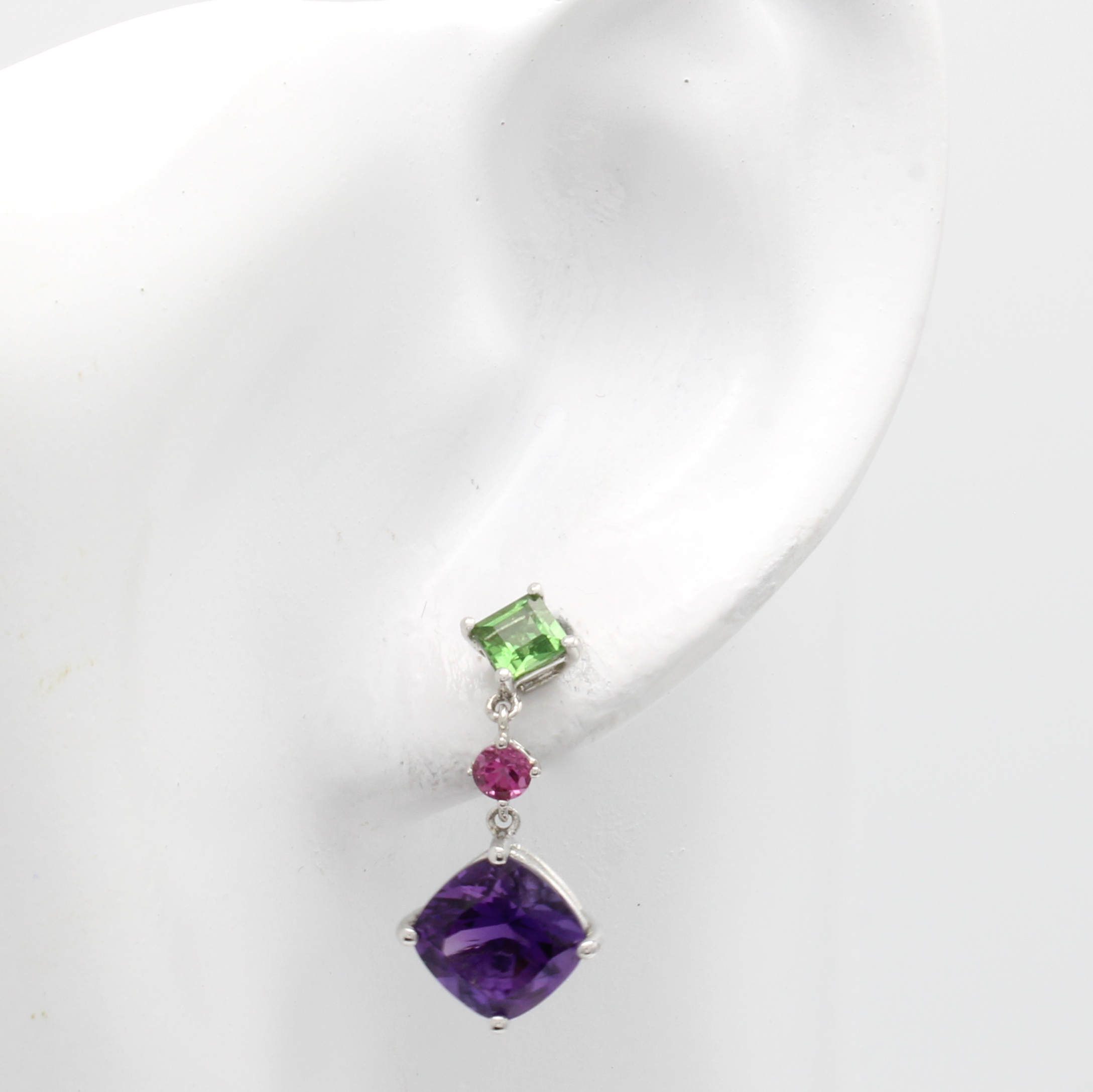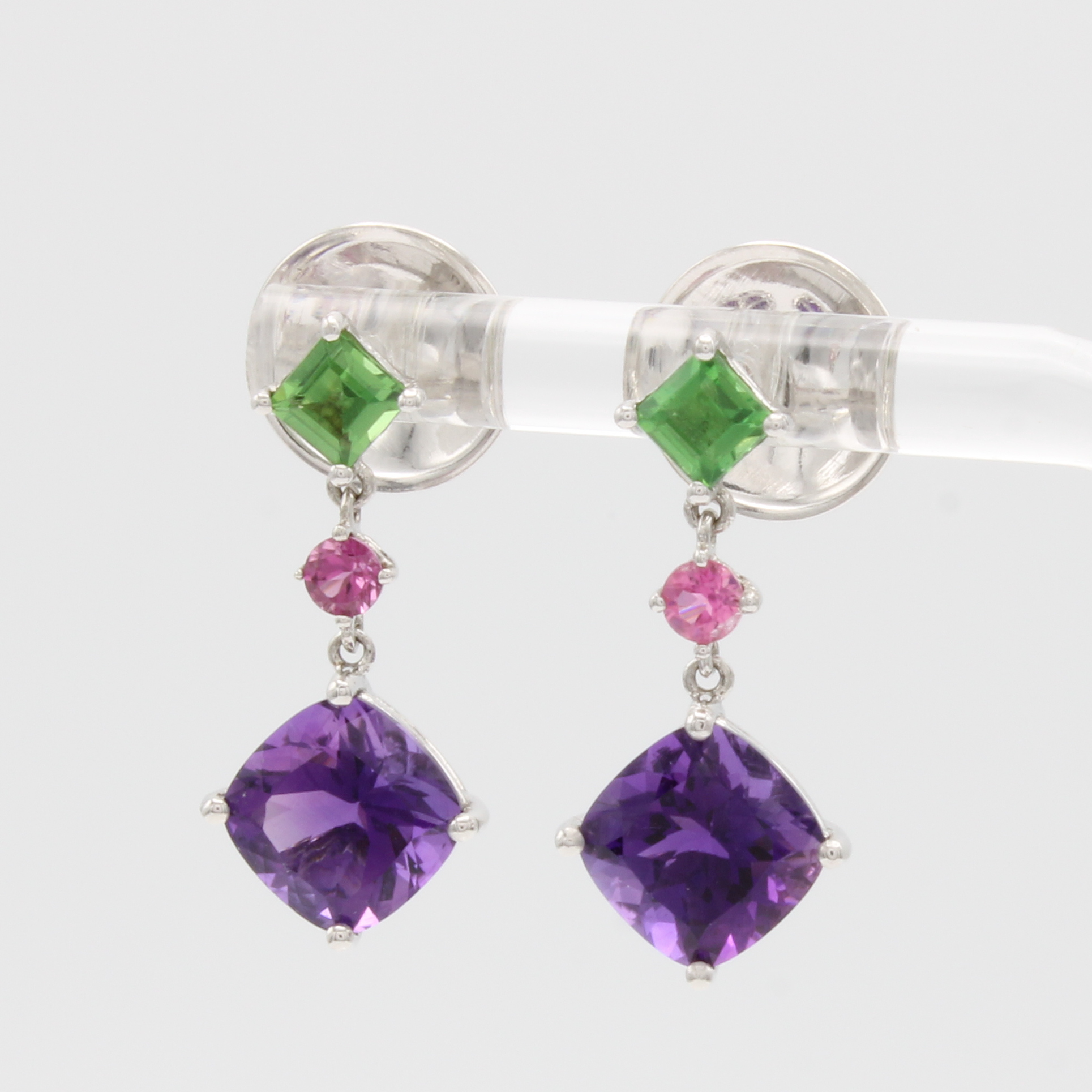 Paar Ohrgehänge mit Farbsteinen, WG 750/000,2 grüne und 2 rosa Turmaline zus. ca. 0.92 ct, 2 Amethyste zus. ca. 4.15 ct