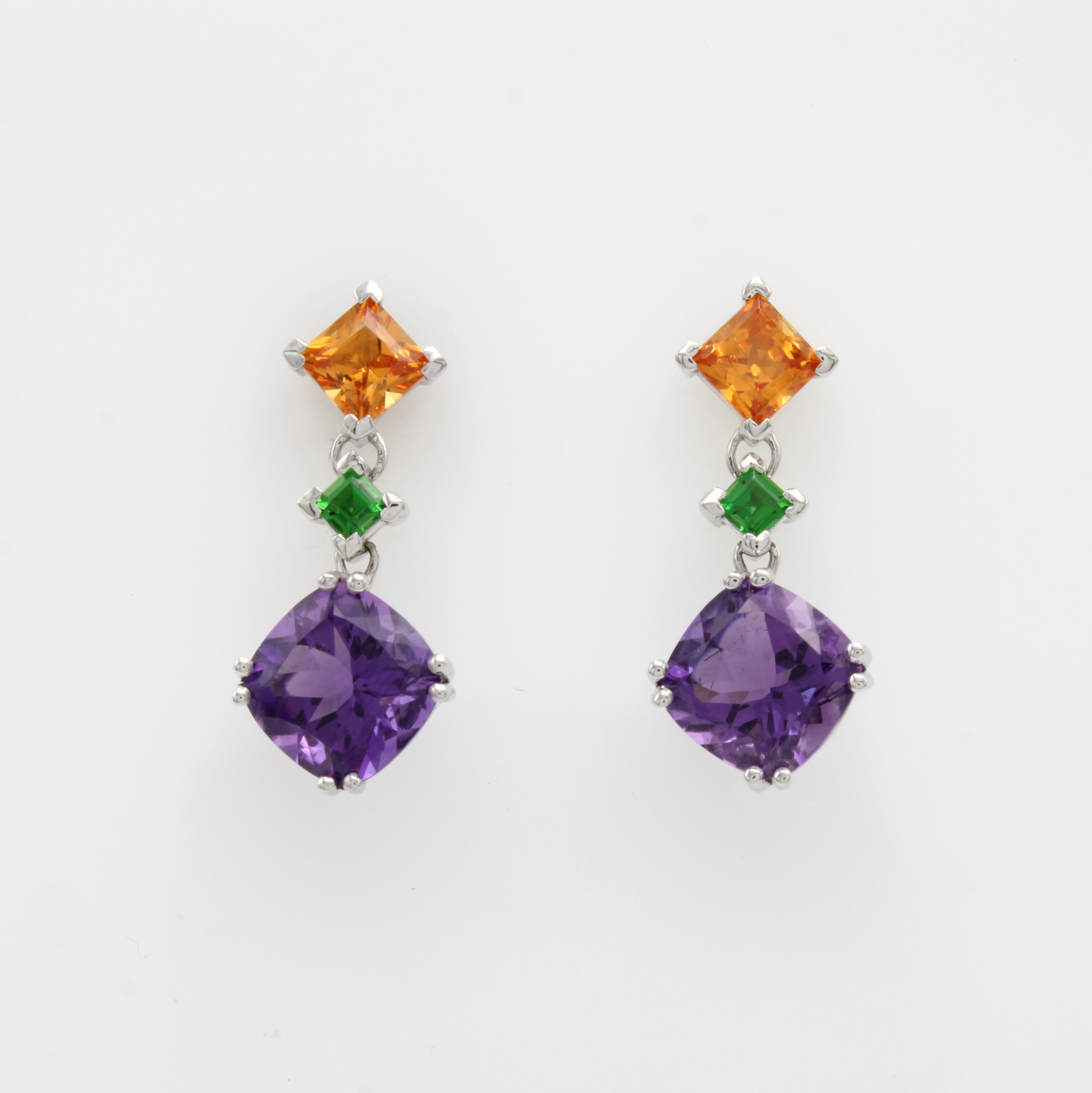 Paar Ohrgehänge mit Farbsteinen, WG 750/000, 2 Mandaringranate zus. ca. 1.93 ct, 2 Tur- maline zus. ca. 0.30 ct u. 2 Amethyste zus. ca. 5.68 ct