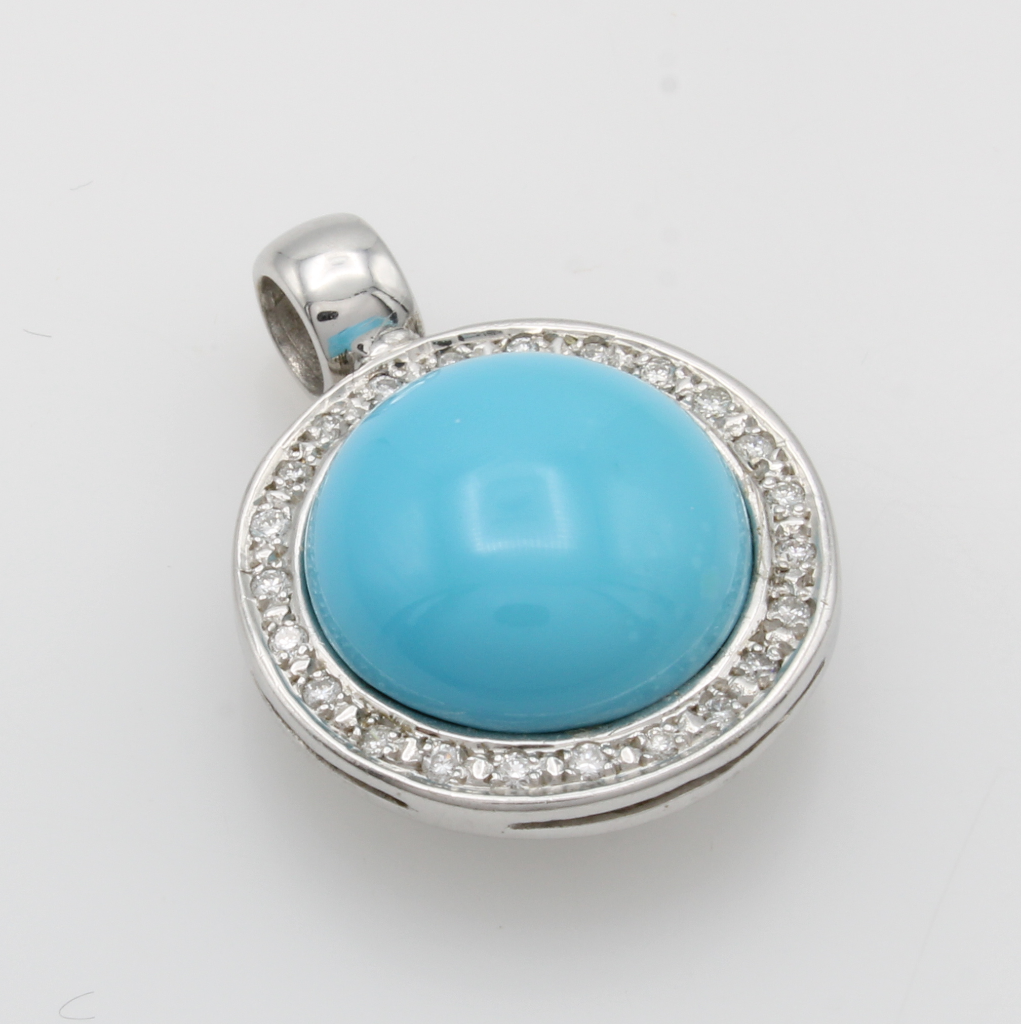 Anhänger mit Türkis und Brillanten, WG 585/ 000, bouttonf. Türkis ca. 15 mm, Brill. zus. ca. 0.23 ct feines Weiß/si Schätzpreis: 2320, - EUR