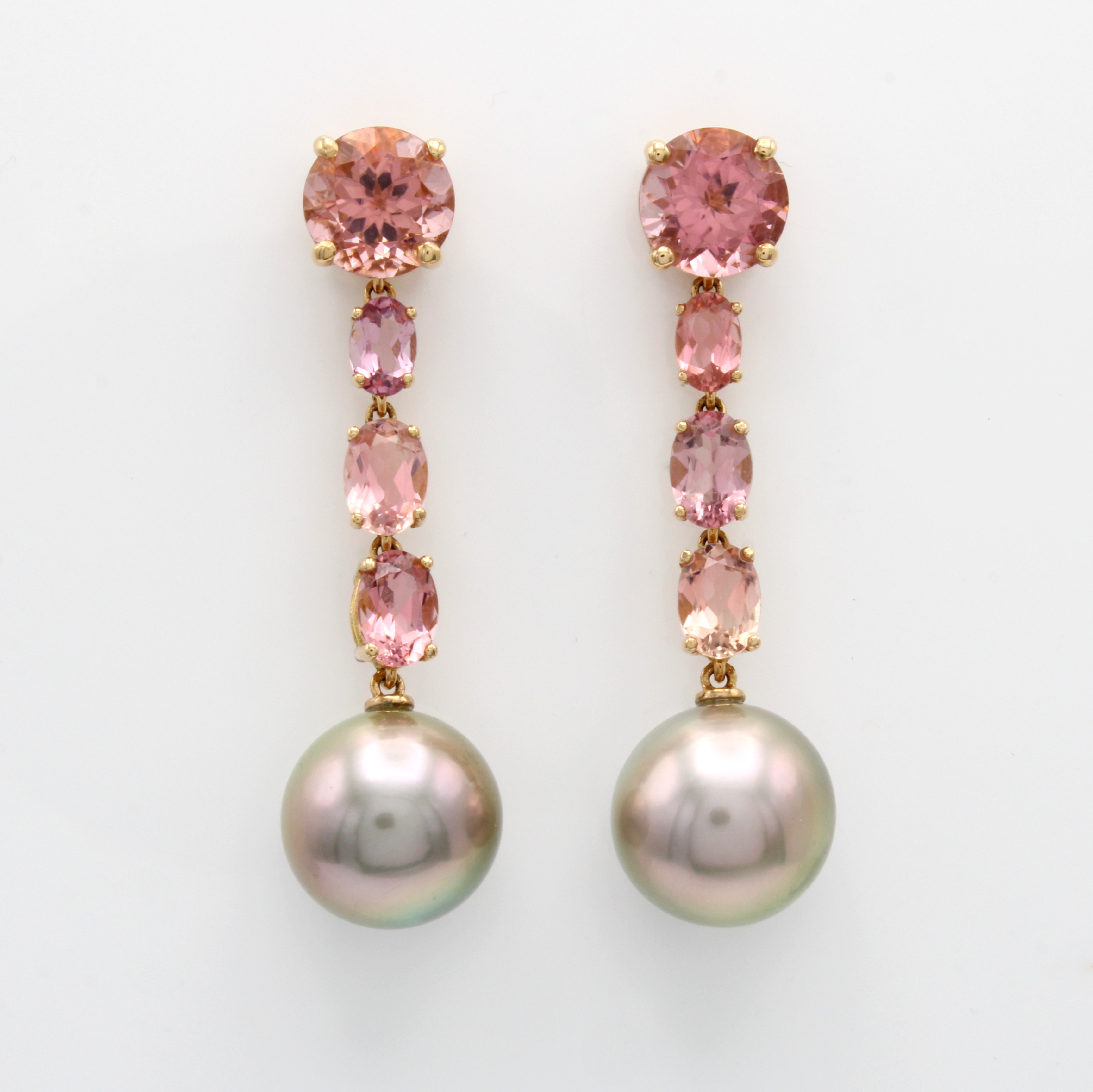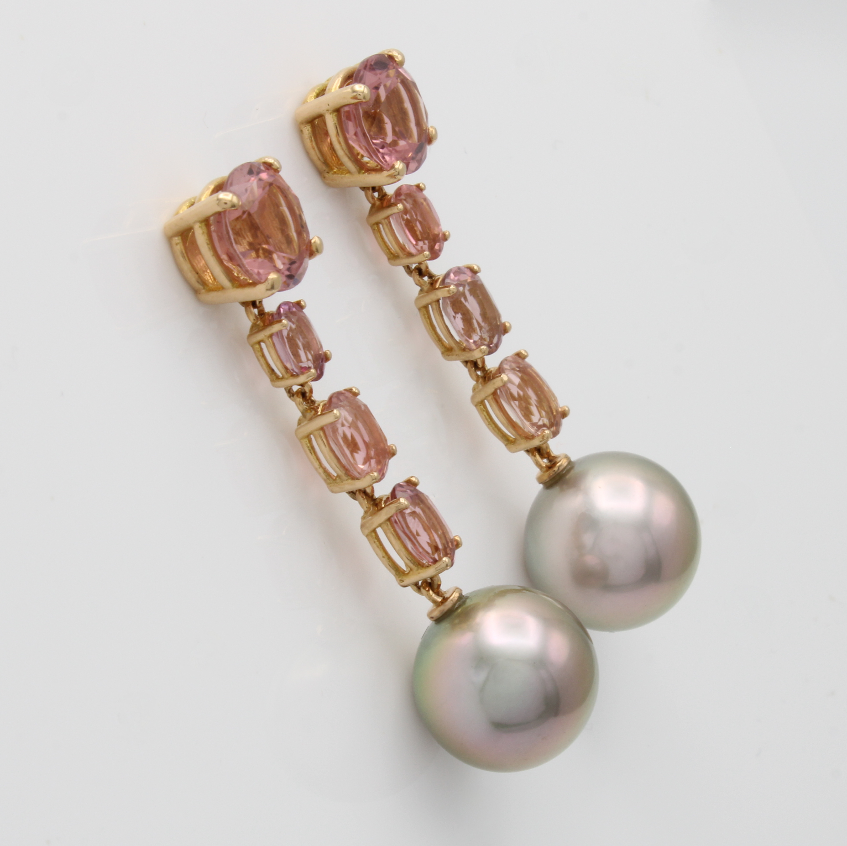 Paar Ohrgehänge mit Tahitiperlen und Turma- linen, RG 750/000, rosa Turmaline zus. ca. 3.26 ct, Tahitiperlen D. ca. 13 mm von sehr gutem Lüster