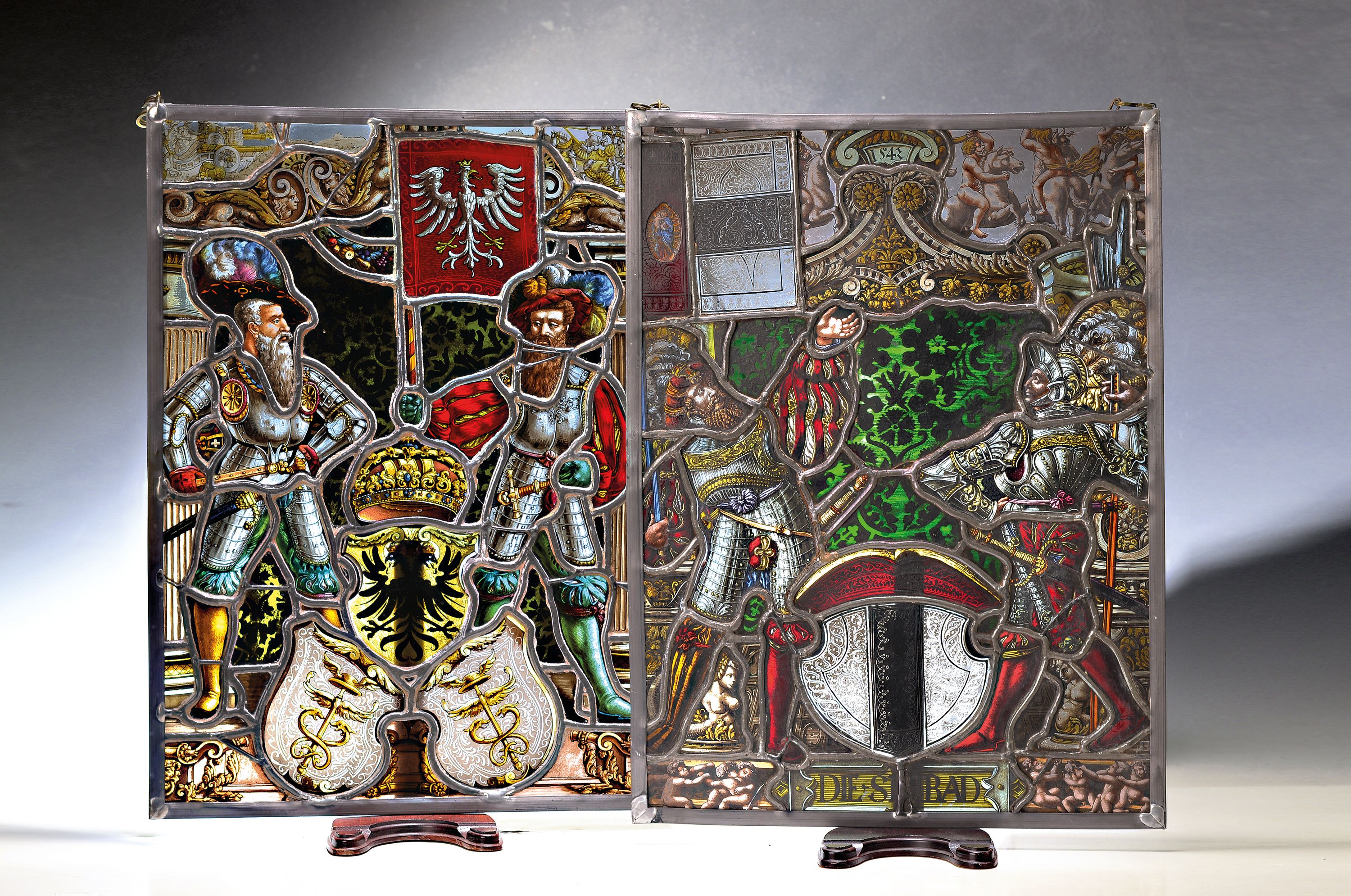 Zwei Bleiverglasungen, Bleiglasfenster,, Historismus, um 1880, Renaissancedarstellungen