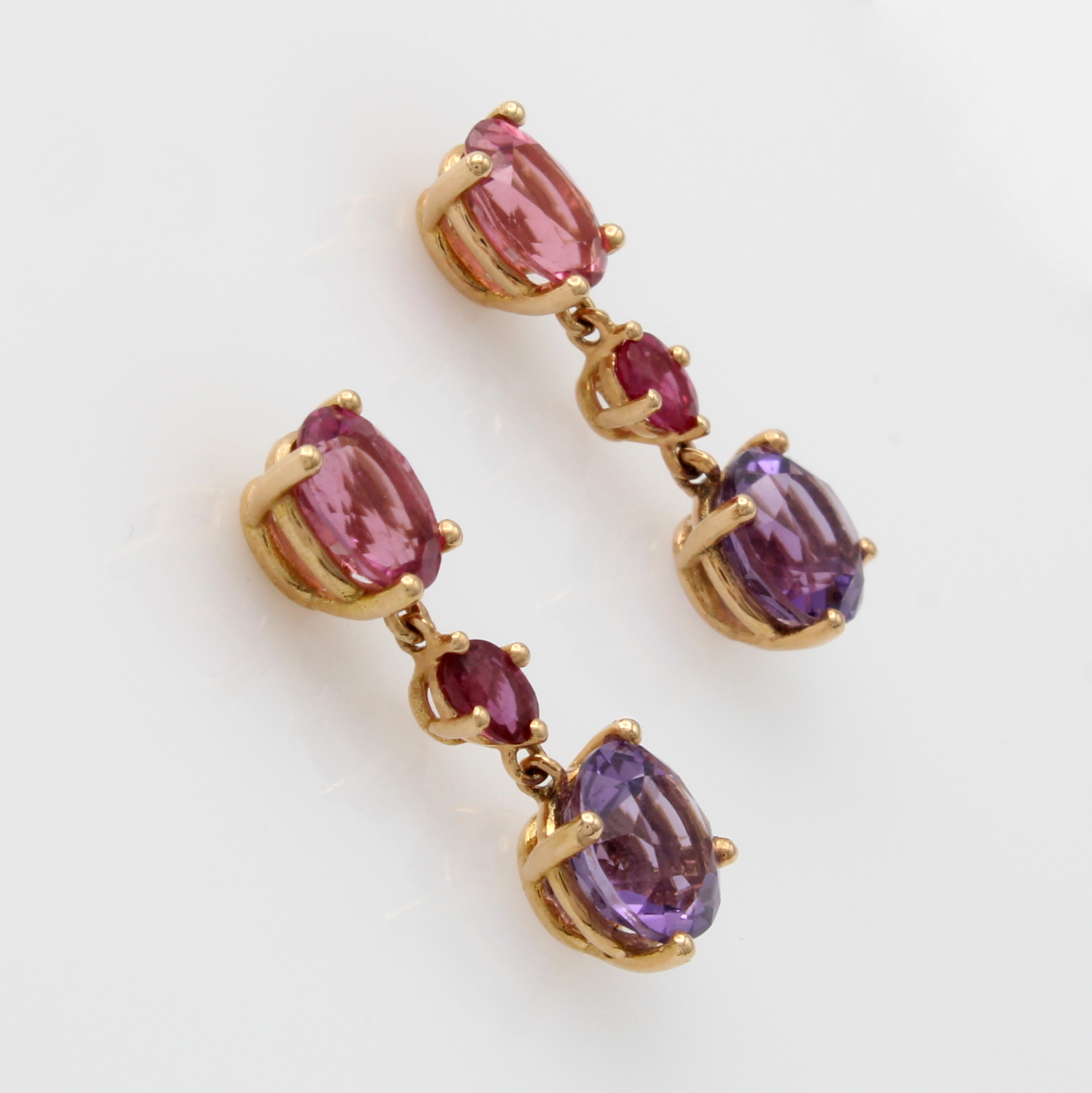 Paar Ohrgehänge mit Farbsteinen, RG 750/000, Turmaline zus. ca. 1.54 ct, Rubine zus. ca. 0.41 ct u. Amethyste zus. ca. 2.58 ct