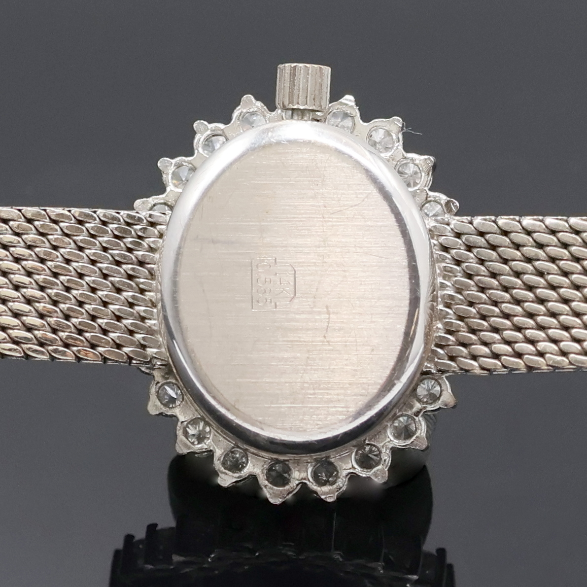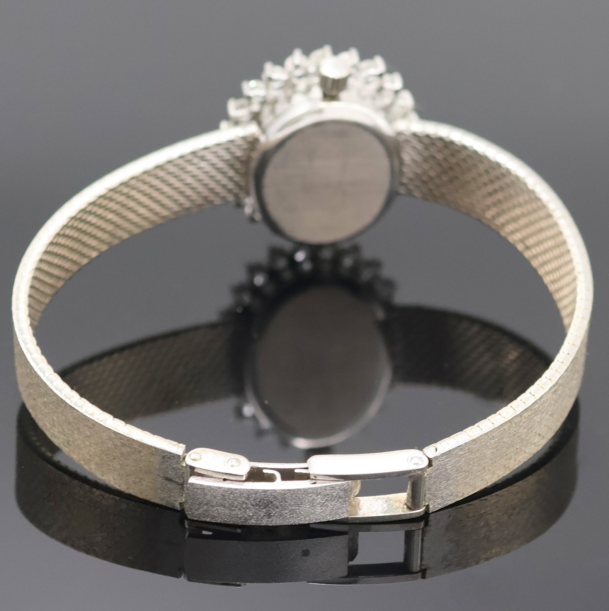um 1965, Boden aufgedr., Lün. aufw. m. Diamanten bes., silb. Strukturzifferbl. m.