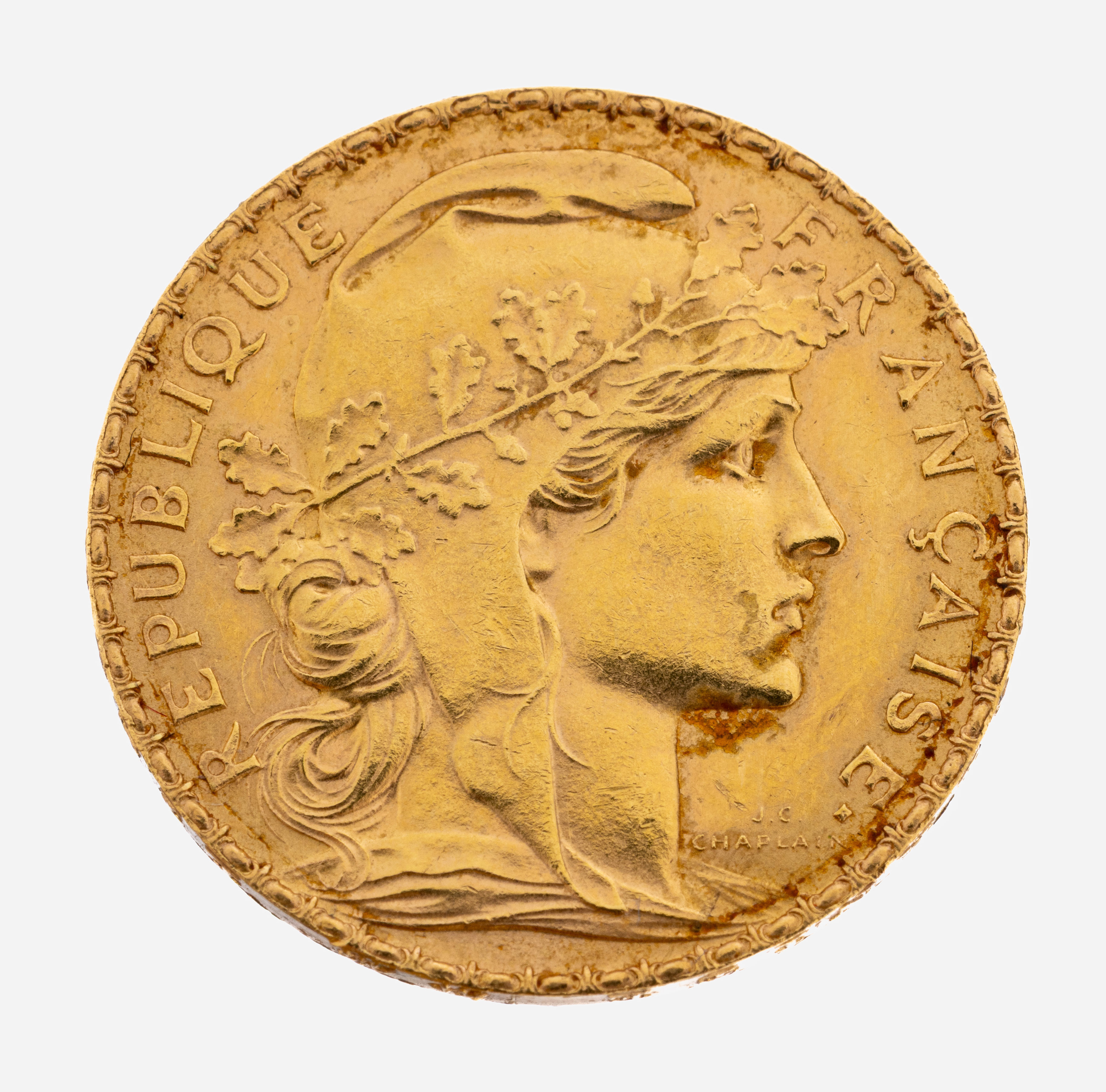 Goldmünze 20 Francs 1910, AV: Marianne, RV:Gallischer Hahn