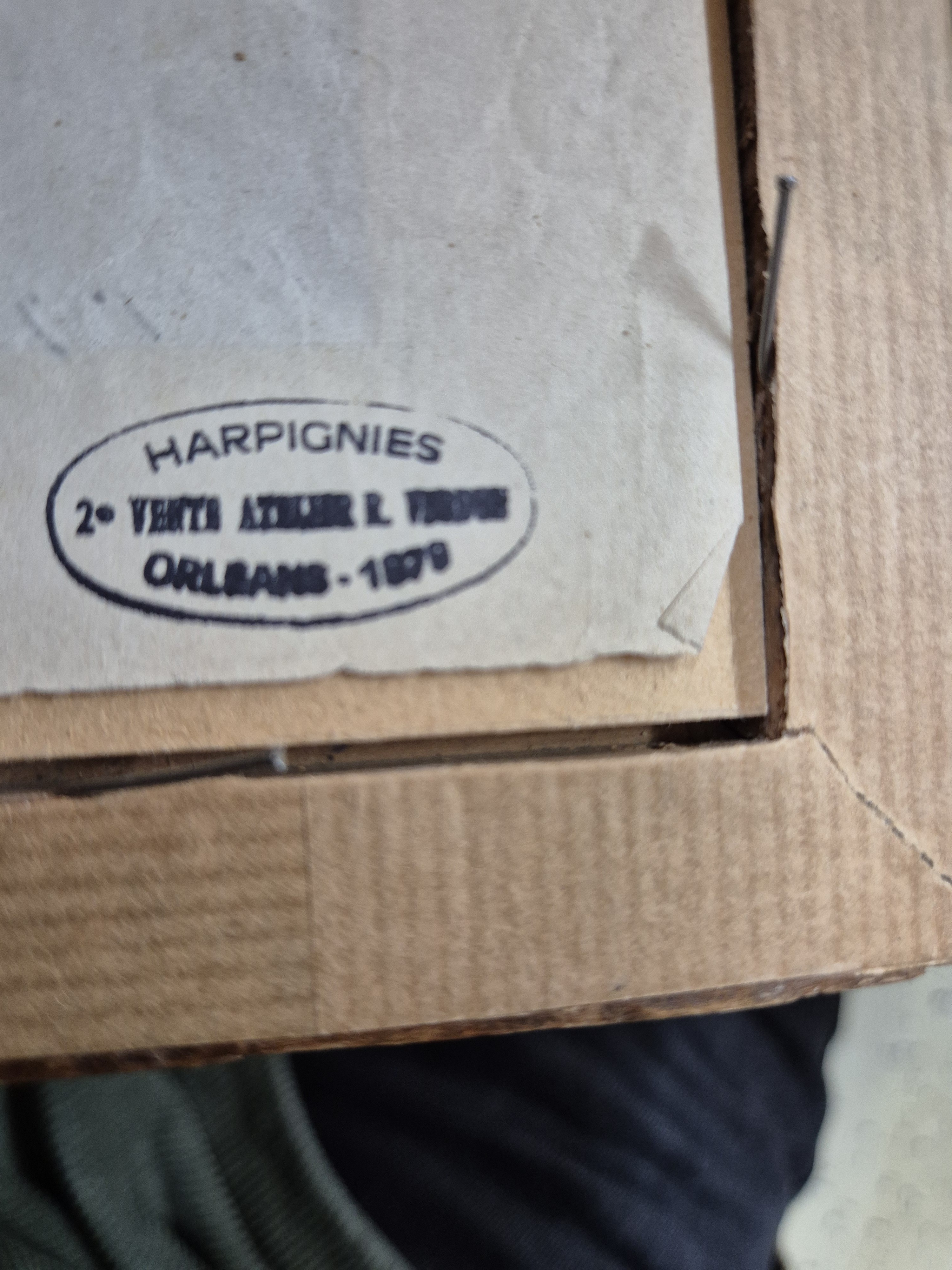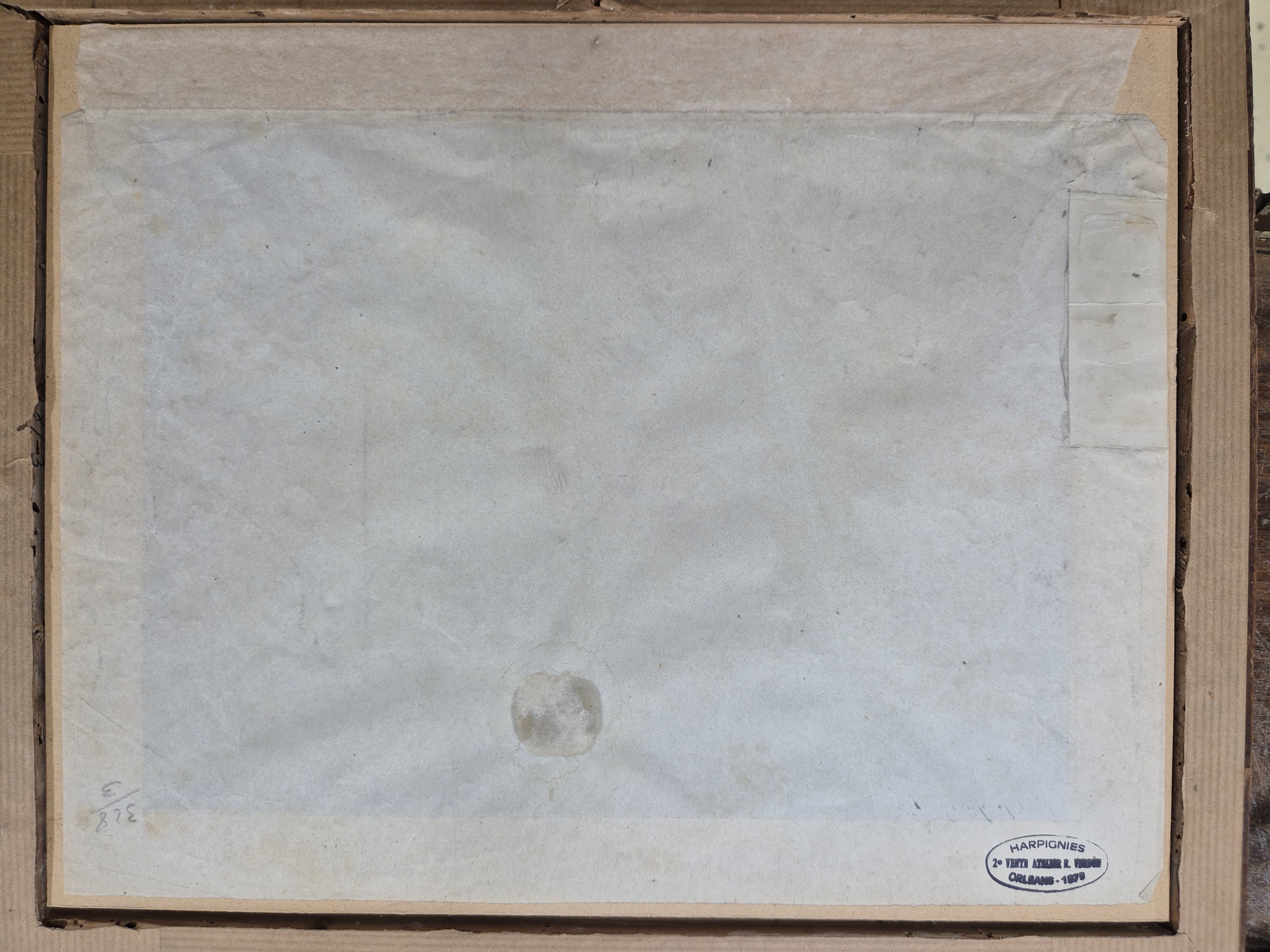 Wasserfleck, Etikett der Galerie Tarcia, Paris, Blatt ca. 18x24 cm, unter Glas gerahmt