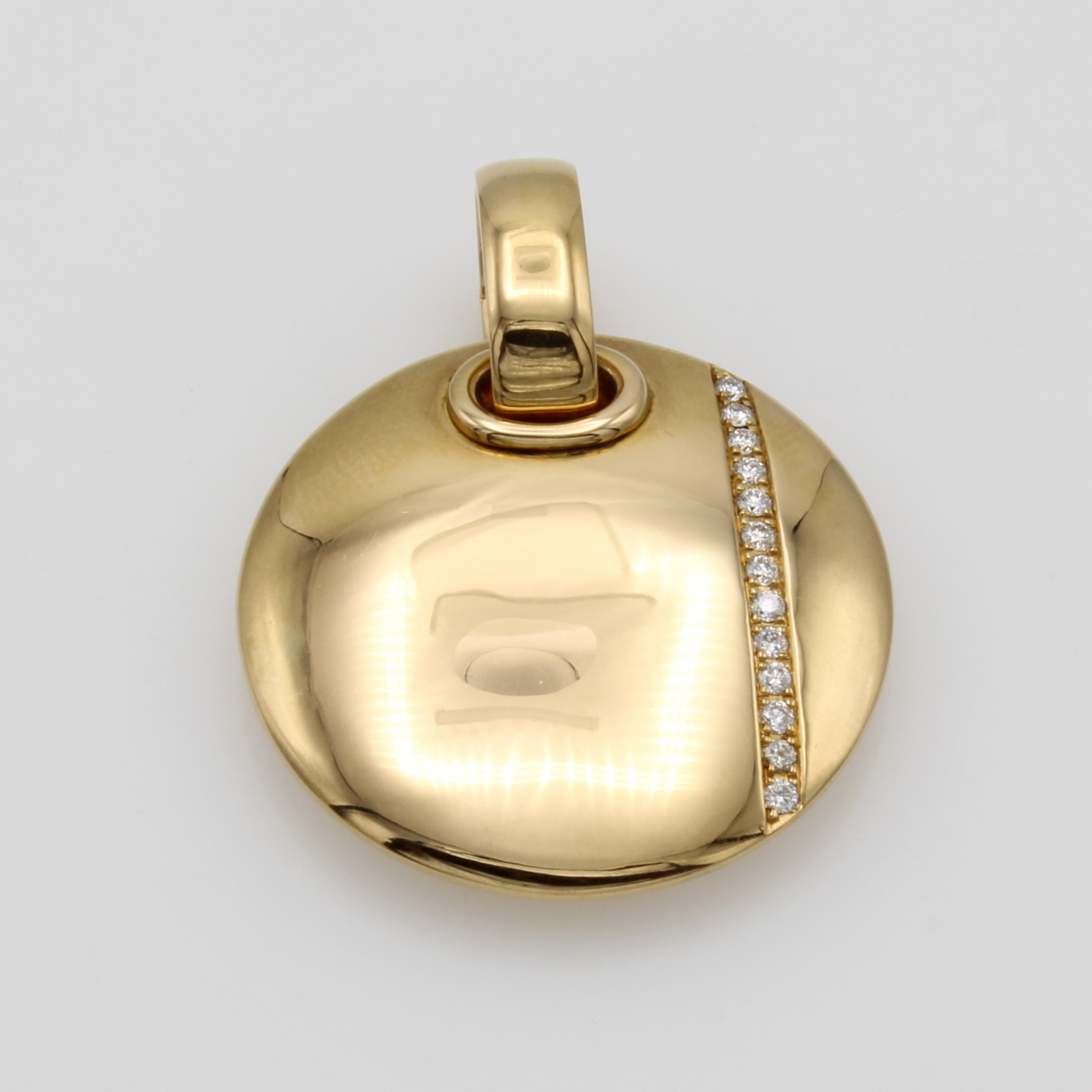 Clipanhänger mit Brillanten, RG 750/000, runde, leicht konvexe Form, Brill. in einer Reihe gef. zus. ca. 0.20 ct feines Weiß/vs, D. ca. 29.5 mm Schätzpreis: 6980, - EUR