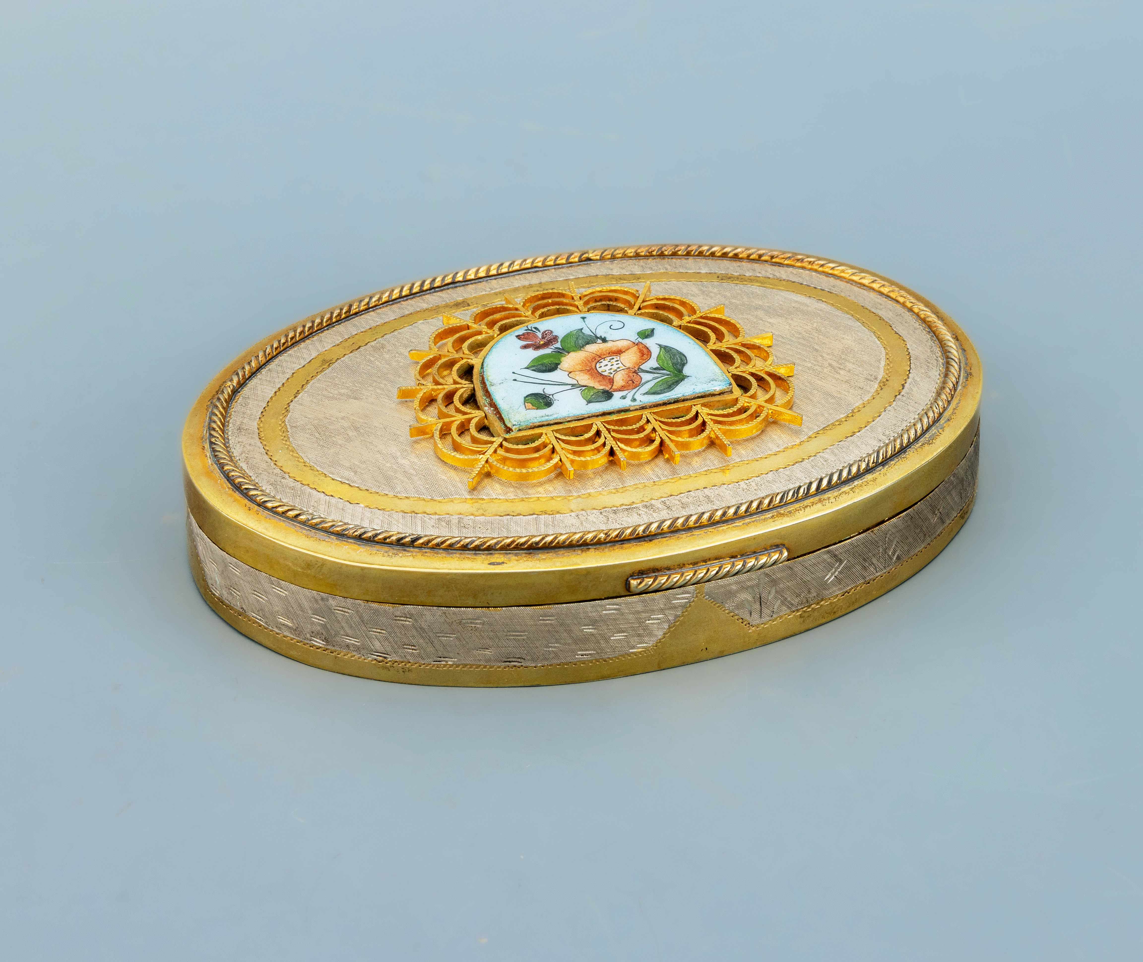 Blütenmalerei, Kordelverz., punziert und z.T. poliert, D. ca. 15.5 x 11 x 2.5 cm,