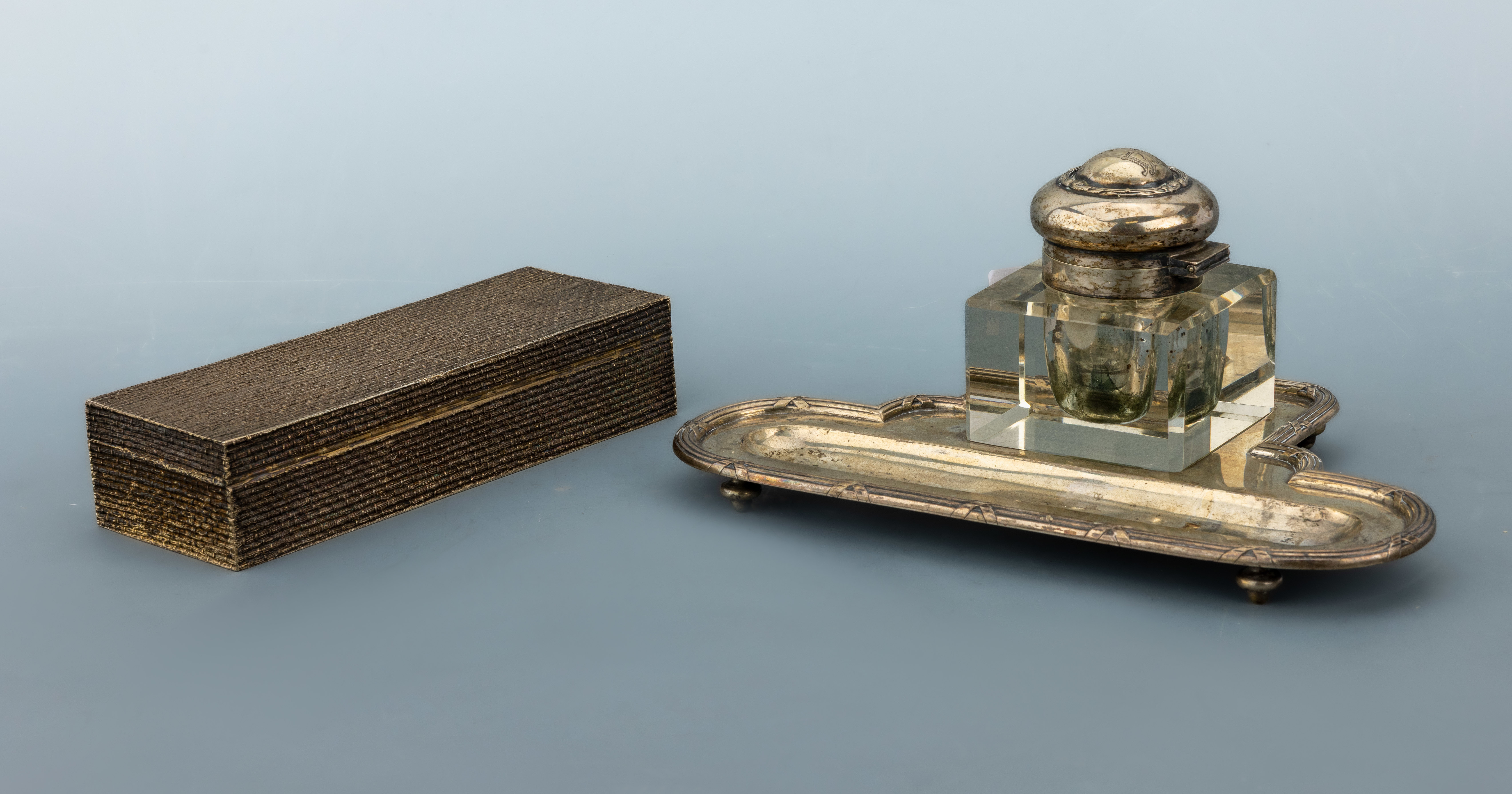 Tintenfass, Berlin um 1900, 800er Silber, massiver Glaskörper, Tablett mit fünffacher Bündelung mit Kreuzband, Gebr.-Spuren, min. verbeult, ca. 11 x 25 x 16.5 cm, Fass mit Silberdeckel, Monogramm KH legiert, dazu Deckeldose, Pforzheim um 1965, Silber verg., Flechtmuster, Korpus Holz, MeistermarkeEB unged., ca. 4 x 19.5 x 7 cm, zus. ca. 1080 g, Deckeldose wohl gefüllt