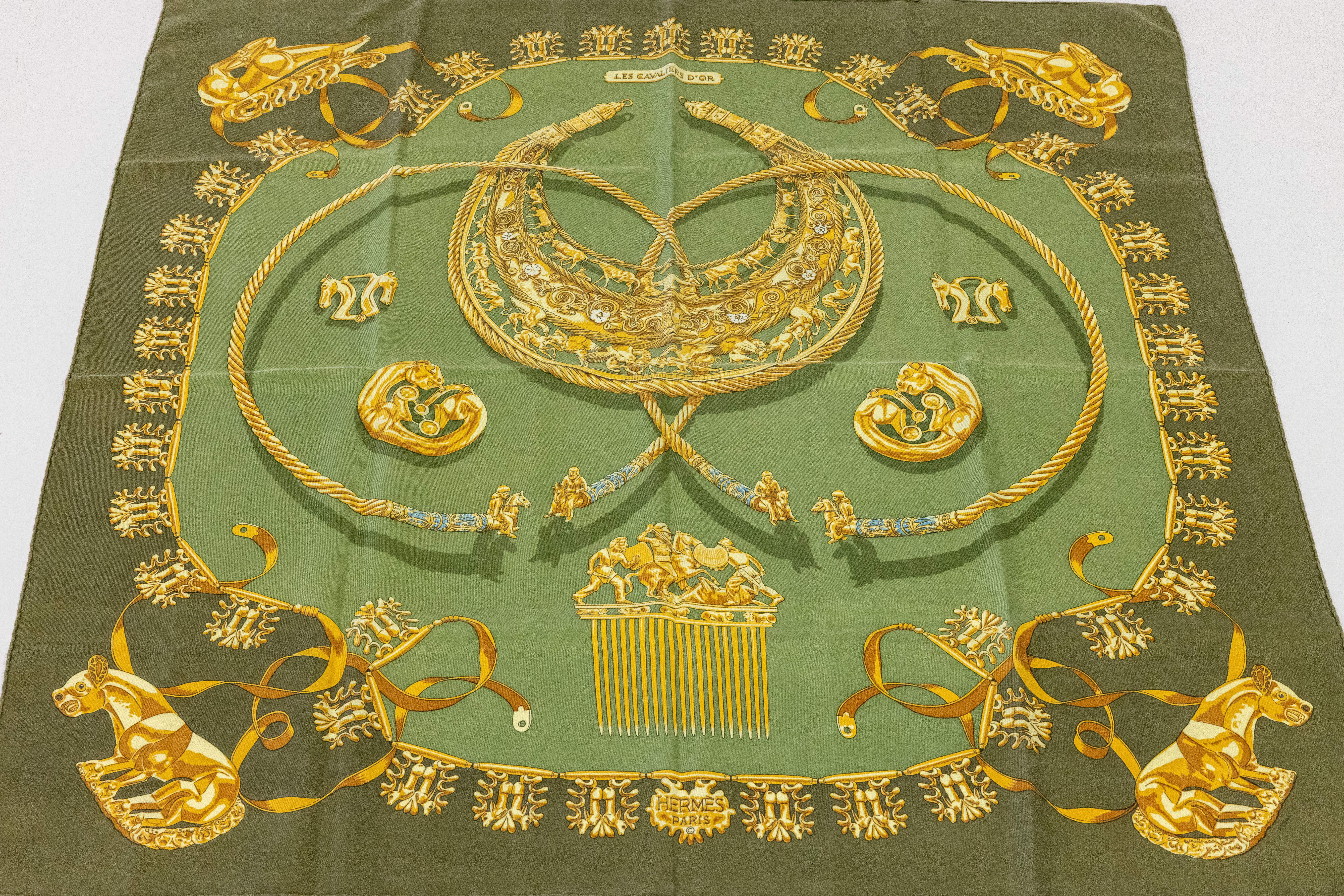 HERMES Carree, "Le Cavaliers DÓr", 100% Seide, grünfarb. Grund, Applikationen in