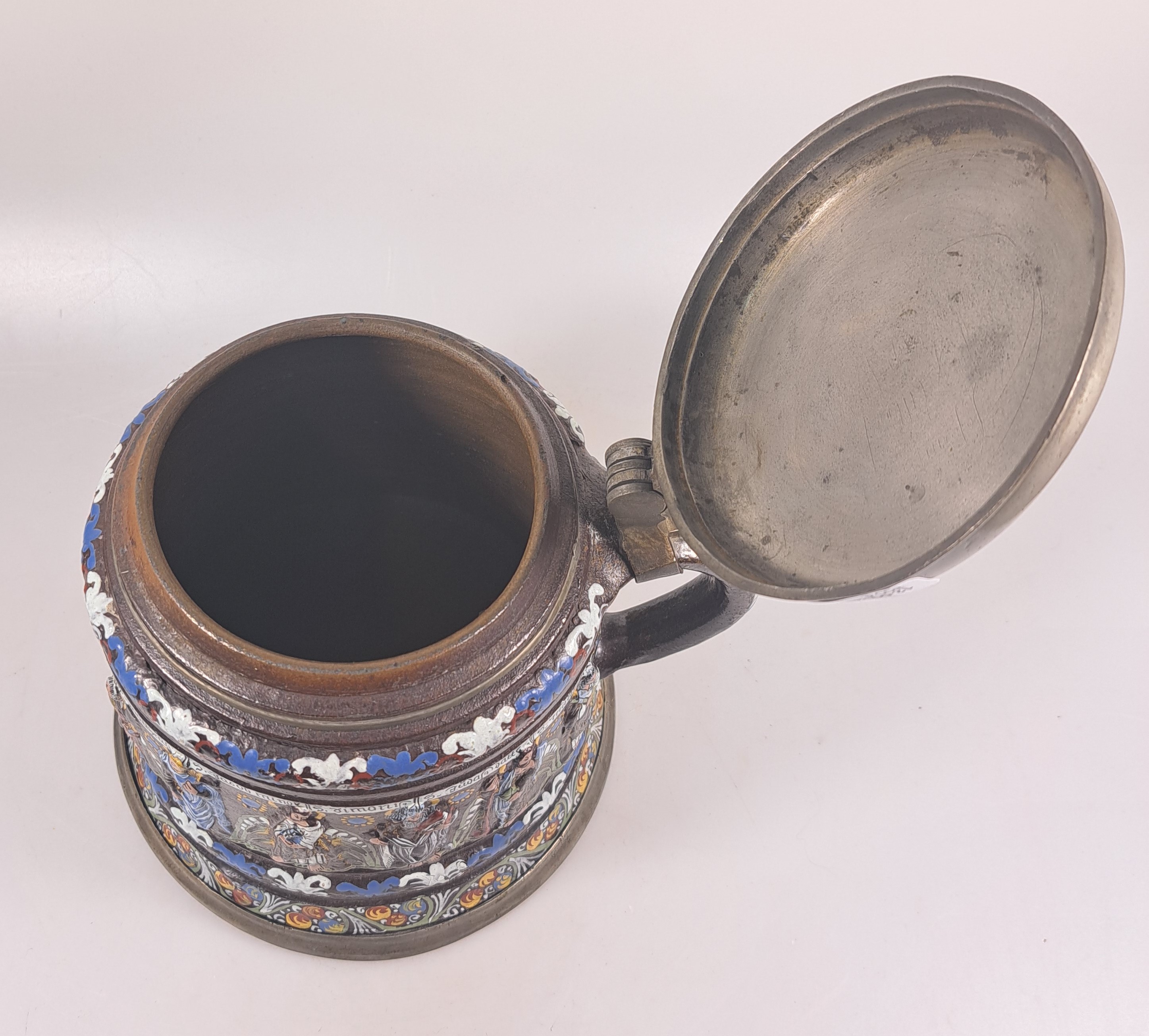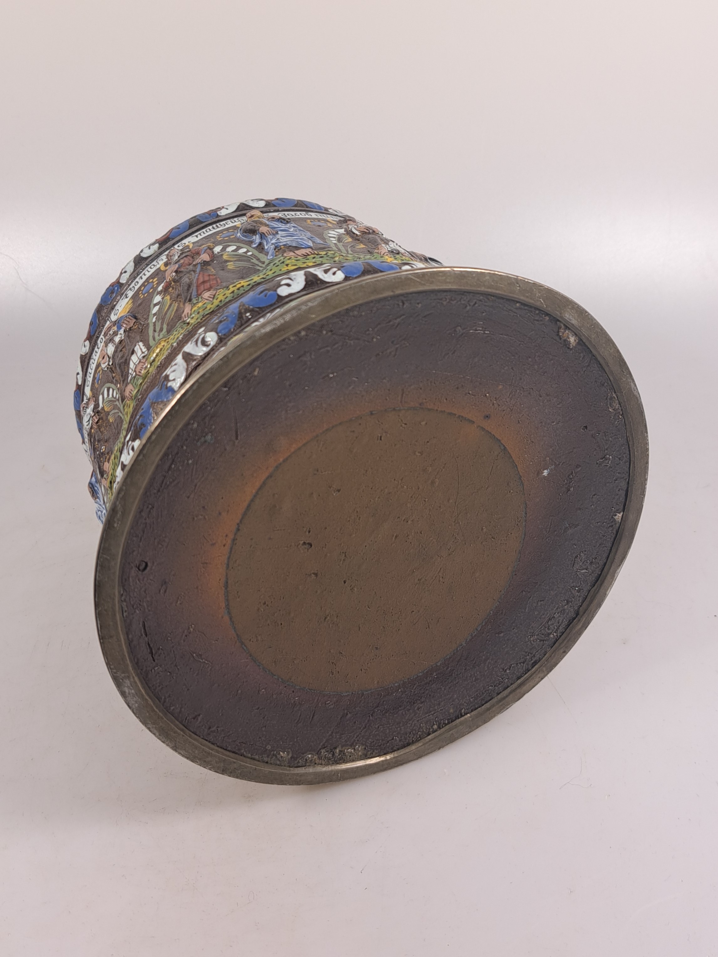 braunes Steinzeug, kräftig farbige Emailmalerei mit Resten alter Vergoldung, umlaufend
