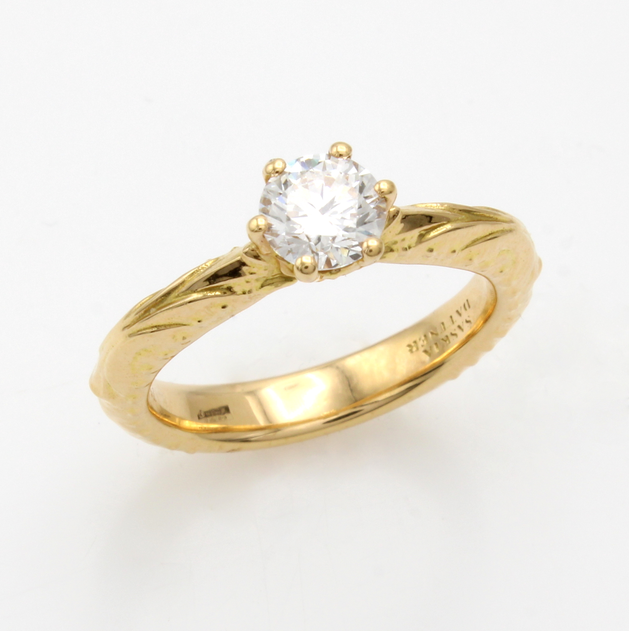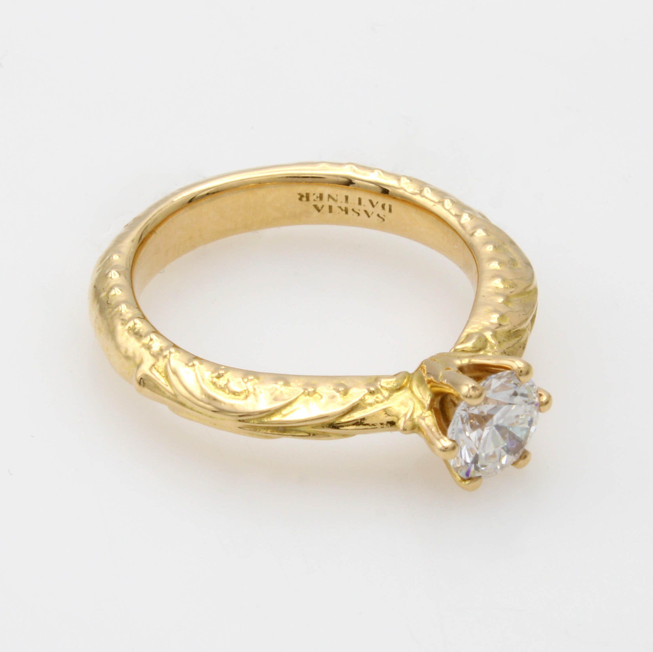 Ring mit Brillantsolitär, GG 750/000, ornamentreiche, verzierte Ringschiene, Brill. in 6er Krappenfassung 0.74 ct feines Weiß(G)/ vs1, RW ca. 53, GIA-Expertise liegt vor Schätzpreis: 8500, - EUR