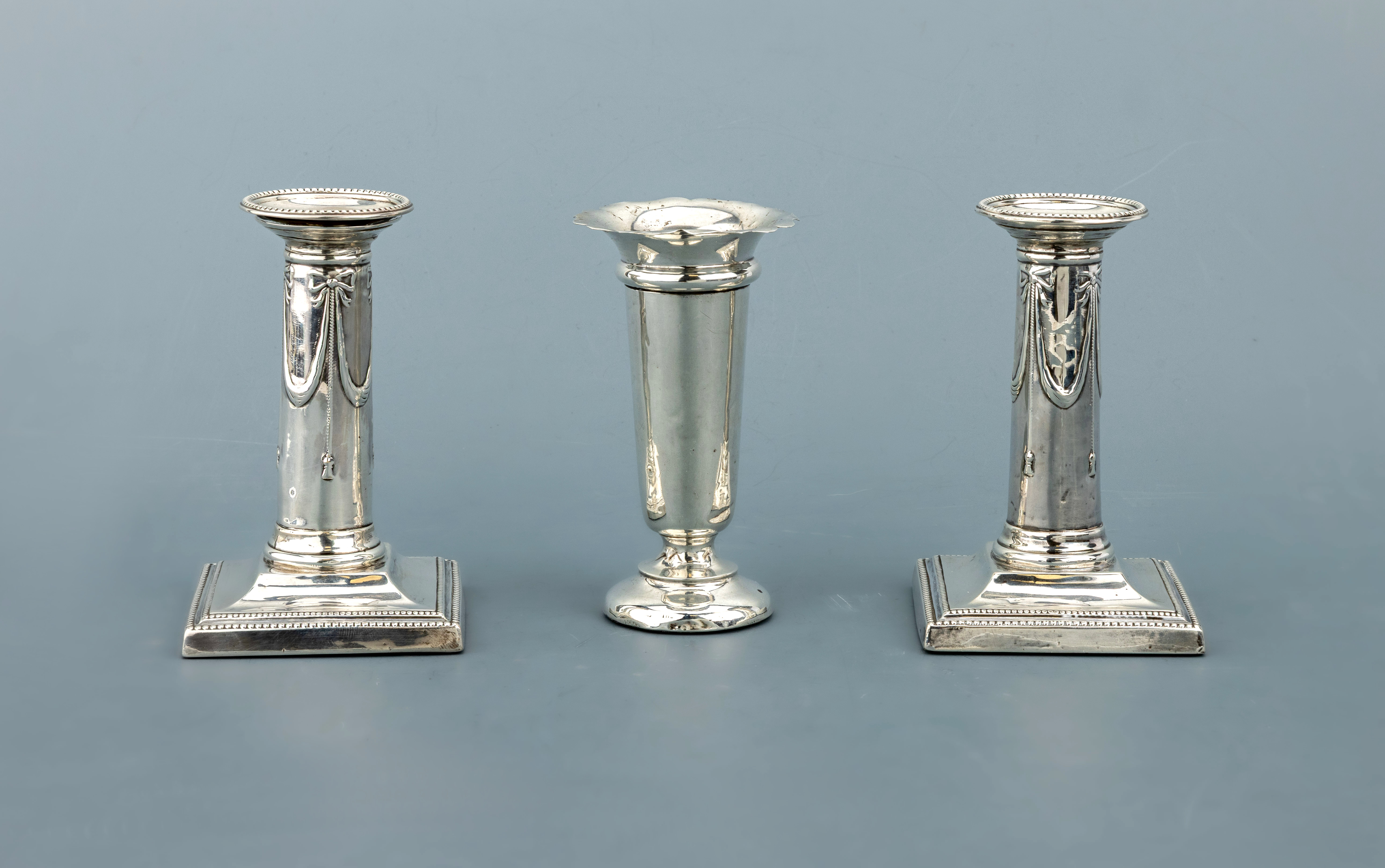 Paar Kerzenleuchter und kleine Vase, Silber, Leuchterpaar England, London 1900, 925er