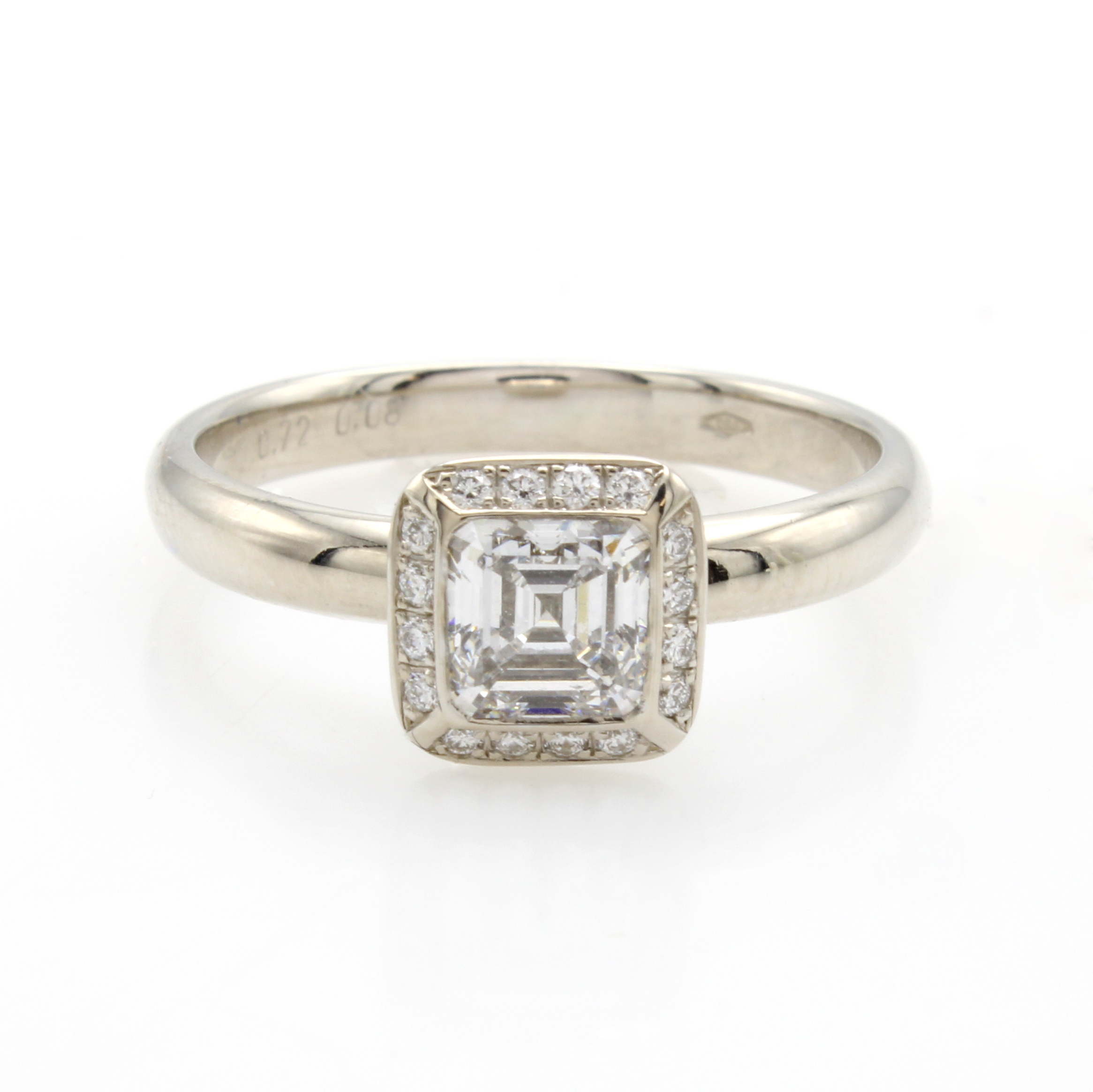 Ring mit Diamant und Brillanten, WG 750/000,Diam. im sog. carréeförm. Smaragdschliff 0.72 ct hochfeines Weiß(E)/si umgeben v. Brill. zus. ca. 0.09 ct feines Weiß/vs, RW ca. 55, GIA-Expertise für Mittelstein liegt vor Schätzpreis: 5900, - EUR