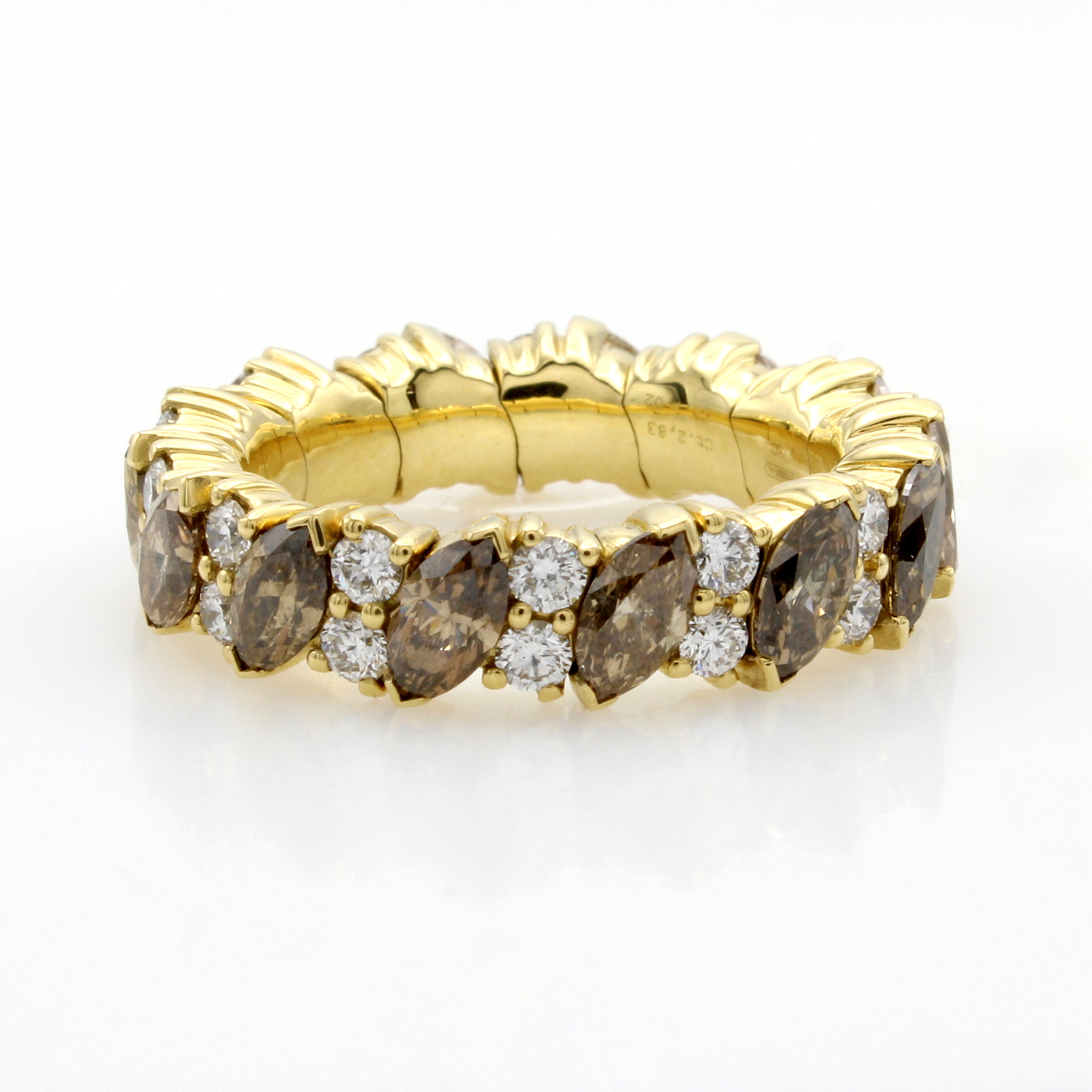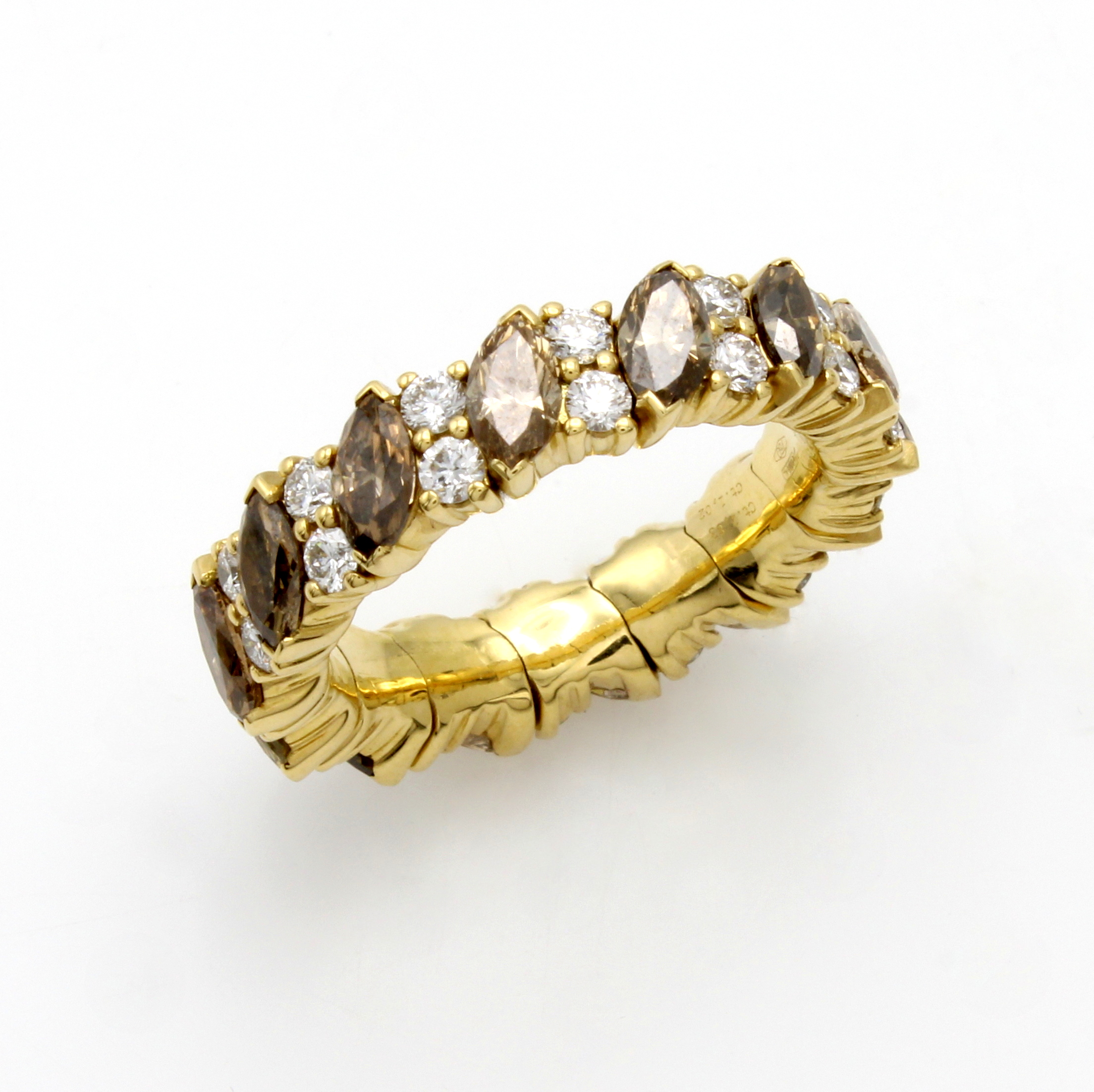 Flexibler Ring mit Diamanten und Brillanten, GG 750/000, 14 Diamantnavettes zus. ca. 2.83 ct in versch. natürlichen Brauntönen, 28 Brill. zus. ca. 1.02 ct feines Weiß/si, RW ca.54+ Schätzpreis: 12000, - EUR