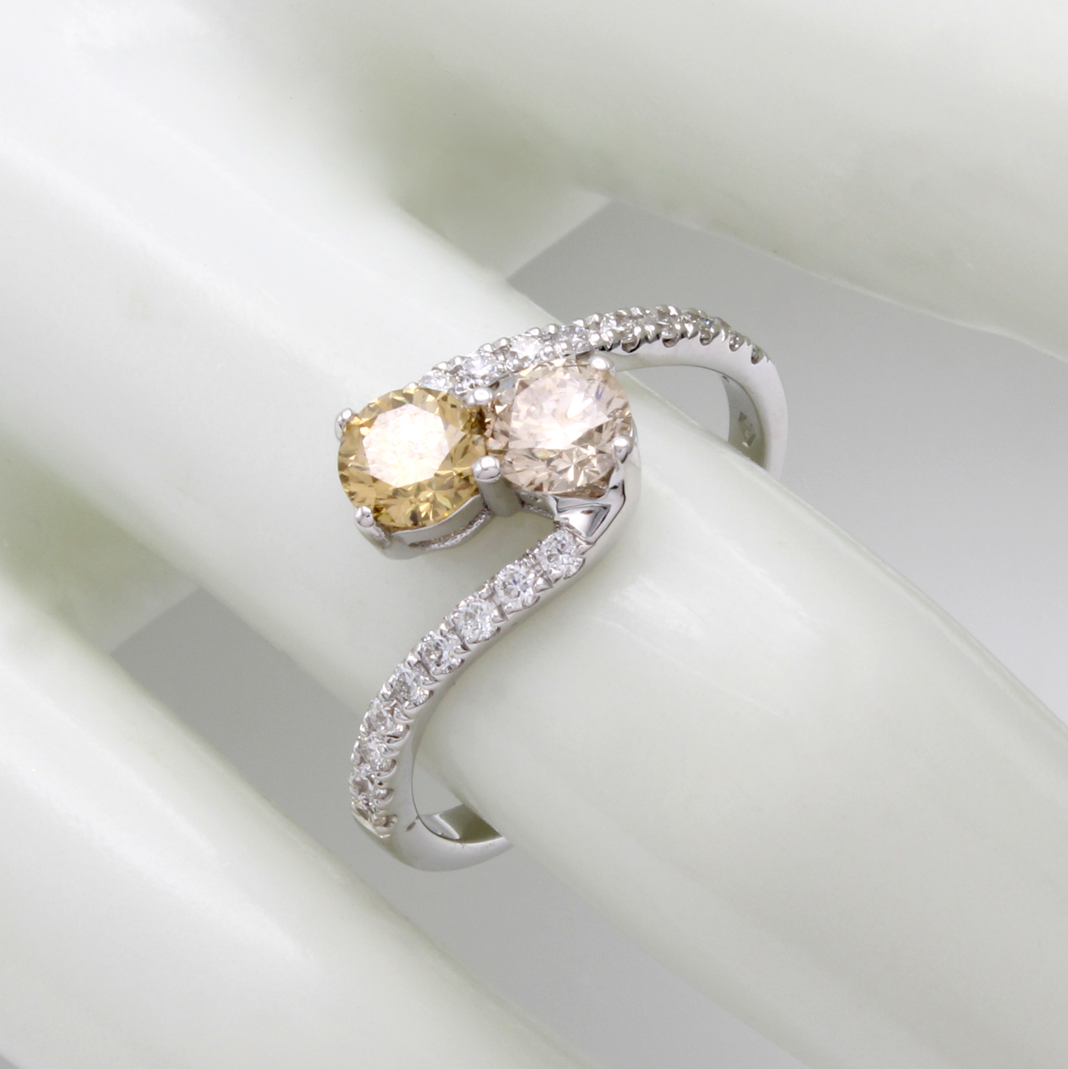 Ring mit Brillanten, WG 750/000, geschwung. Design, 2 Brill. mittig gef. zus. ca. 0.71 ct Braun/si, 18 Brill. zus. ca. 0.19 ct Weiß/si, RW ca. 53 Schätzpreis: 3400, - EUR