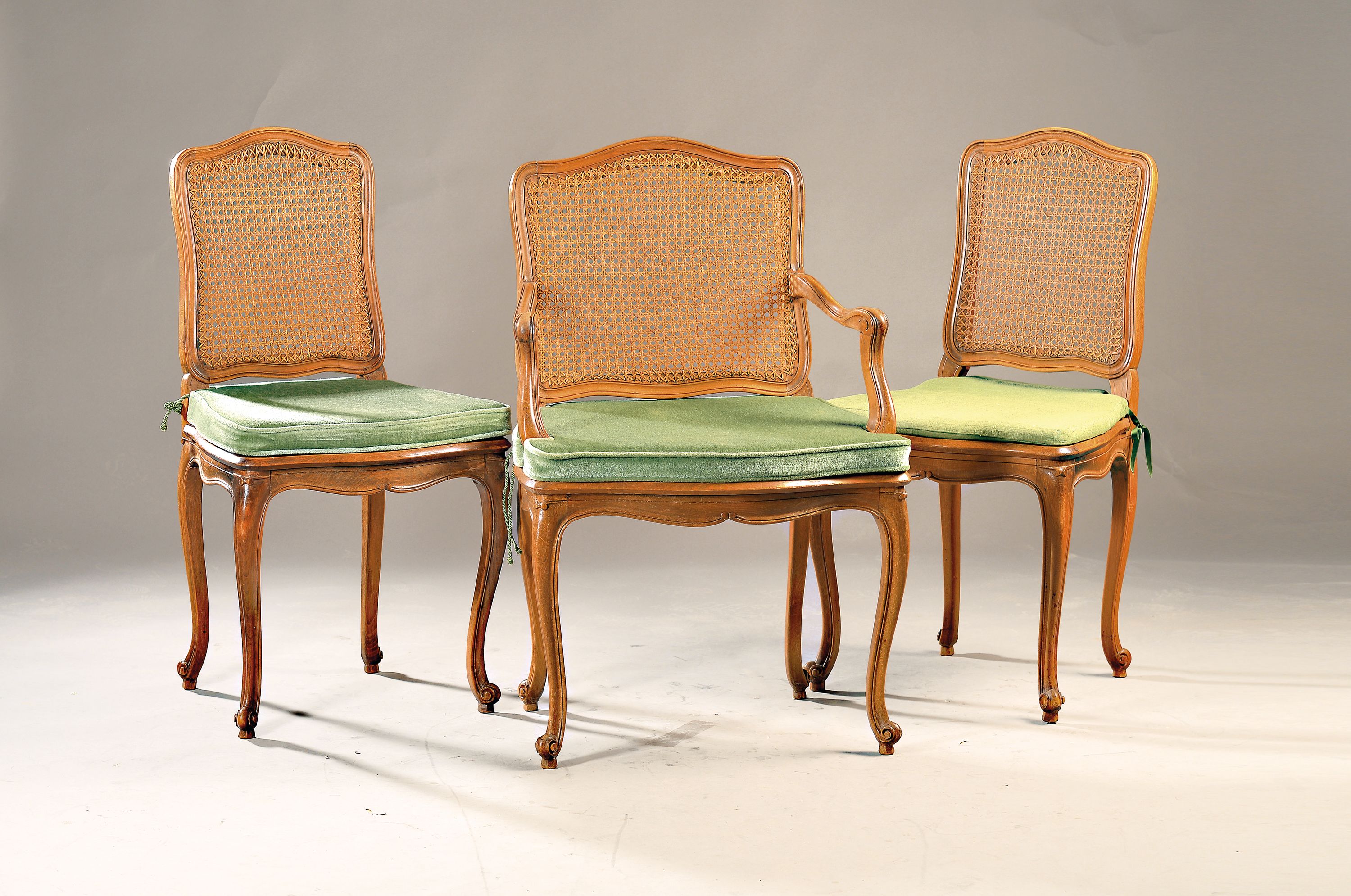 in Nußbaum gebeizt, Rücken und Lehne mit Geflecht, teilweise Geflecht erneuert,