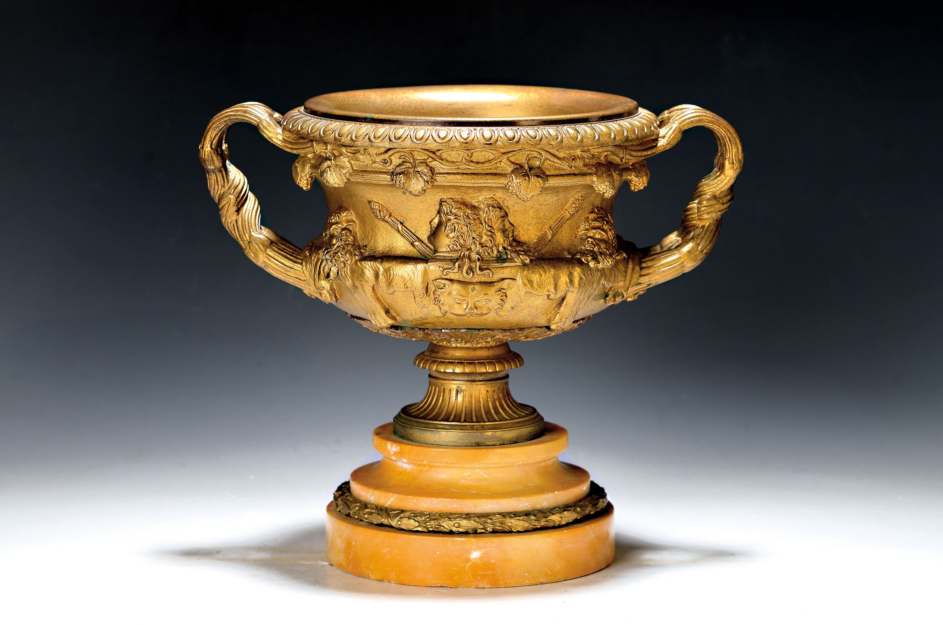 Sog. Warwick-Vase, deutsch, um 1900, massive Bronze, gelber Marmorsockel, nach dem