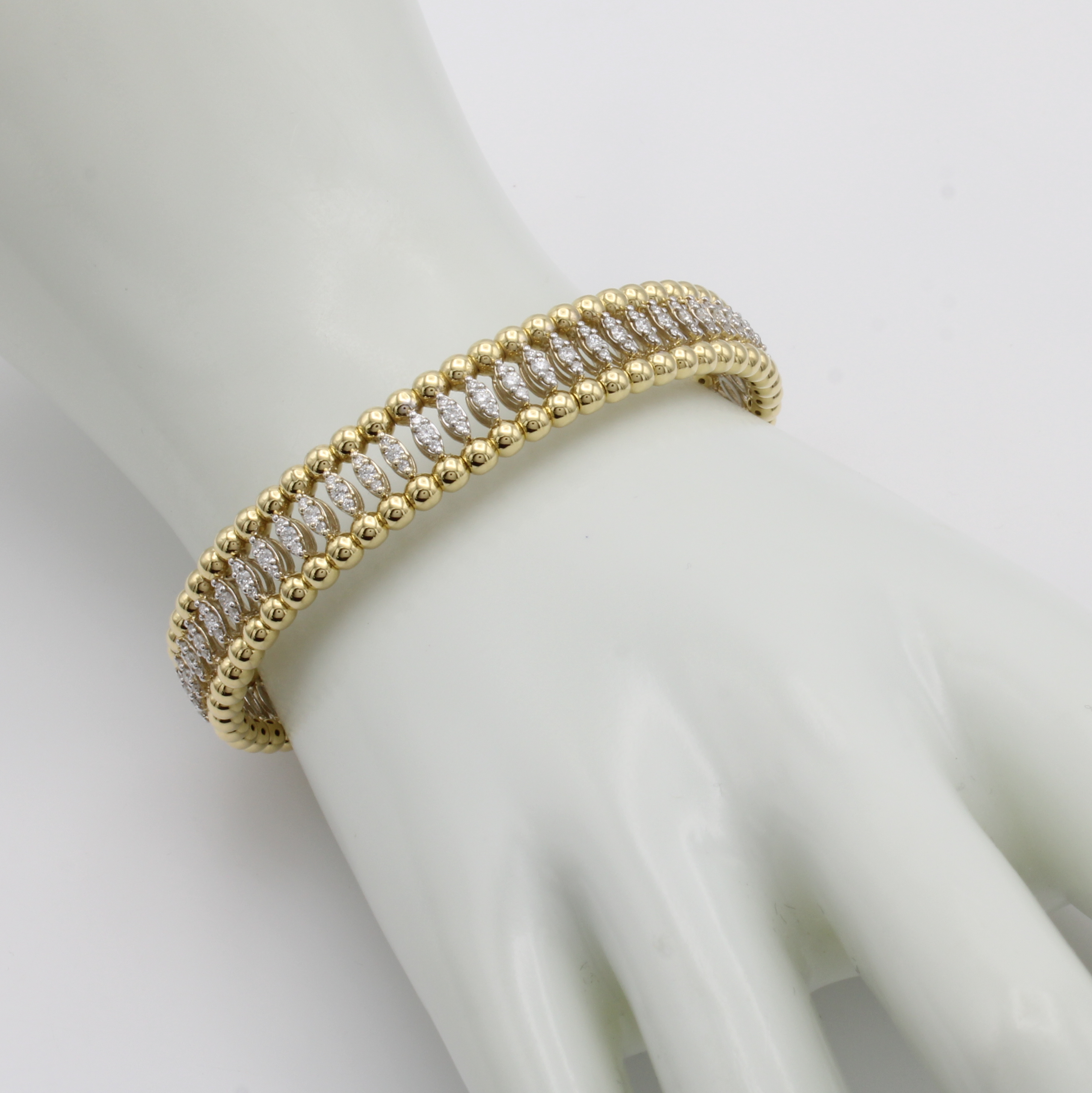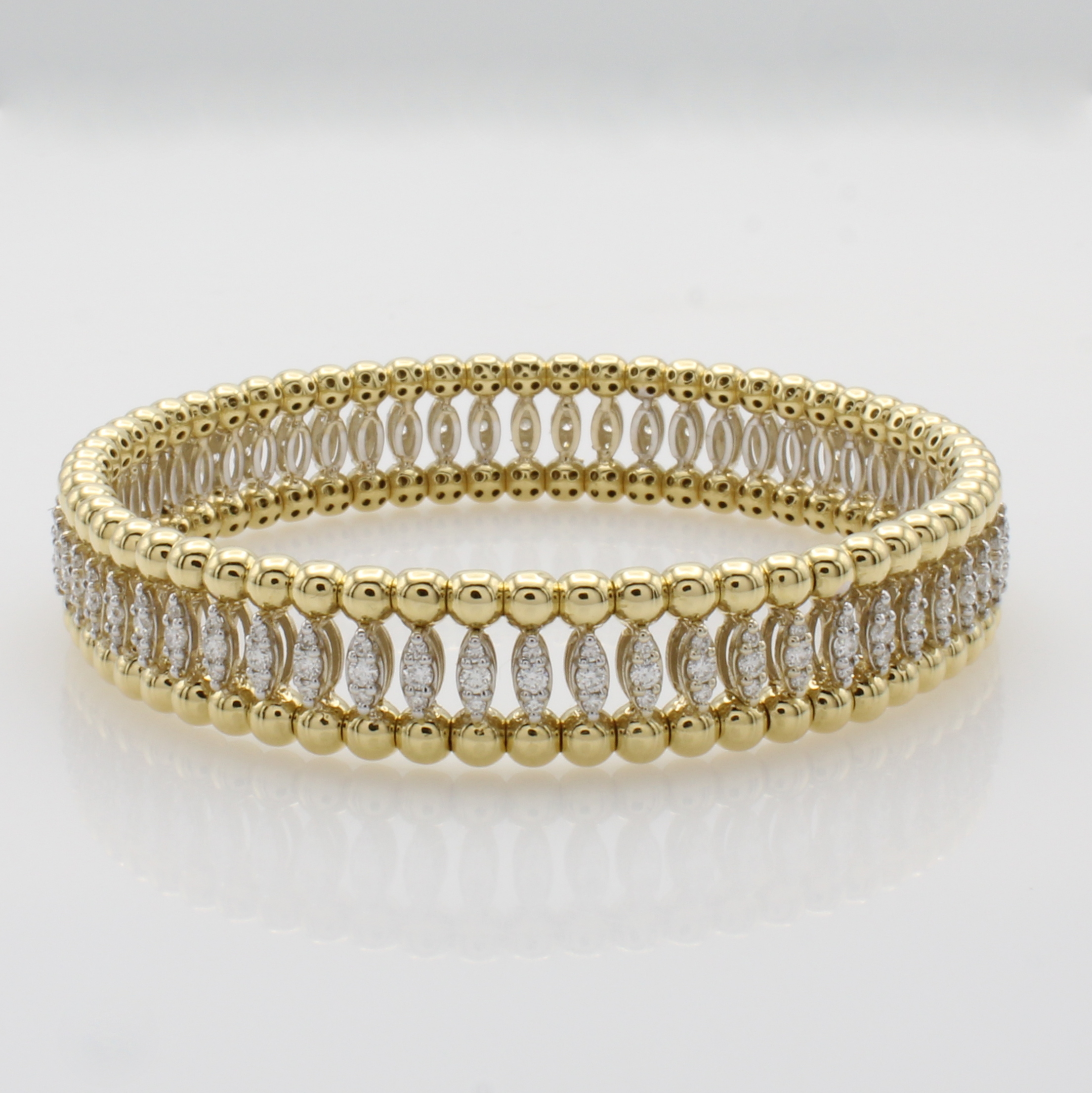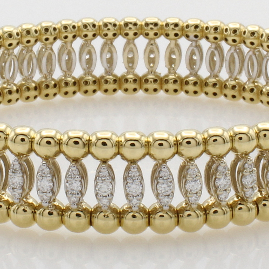 Flexibler Armreif mit Brillanten, GG/WG 750/000, Kugelumrandung in GG, navetteförm. WG- Glieder bes. m. 180 Brill. zus. ca. 1.75 ct feines Weiß/vs, Br. ca. 11 mm Schätzpreis: 14000, - EUR