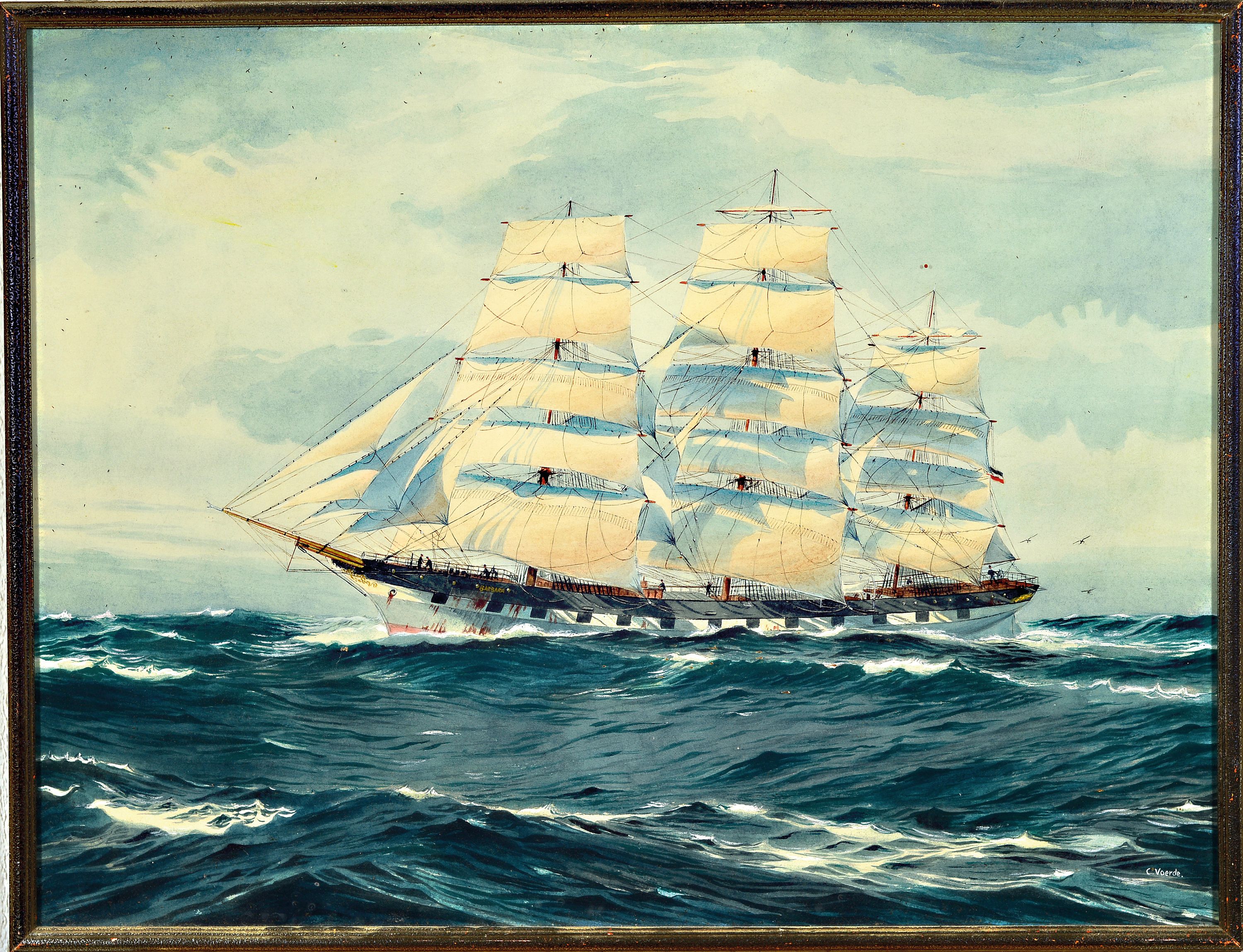 C. Voerde, aufgetakeltes Segelschiff mit Mannschaft auf bewegter See, Gouache, auf