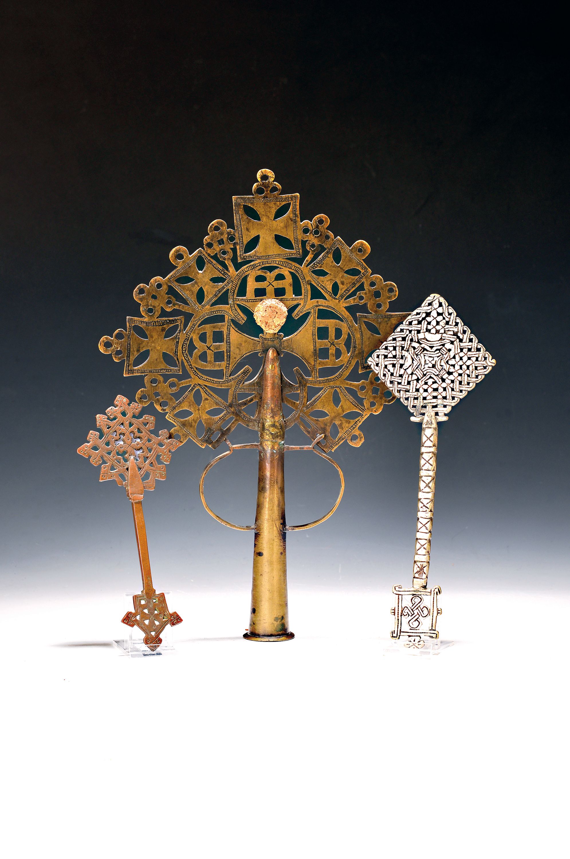 Ein sehr großes und zwei kleinere Vortragekreuze, Äthiopien, 19./20. Jh., Metall,