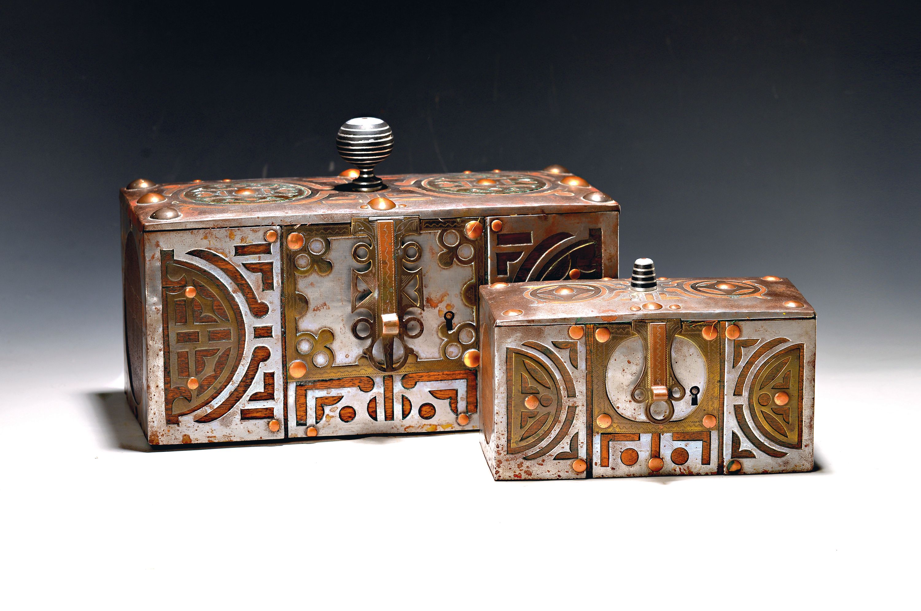 z.T. Kupferfarben, l. korrodiert, ca. 13 x 20 x 9.5 cm, größere Box ca. 20 x 31