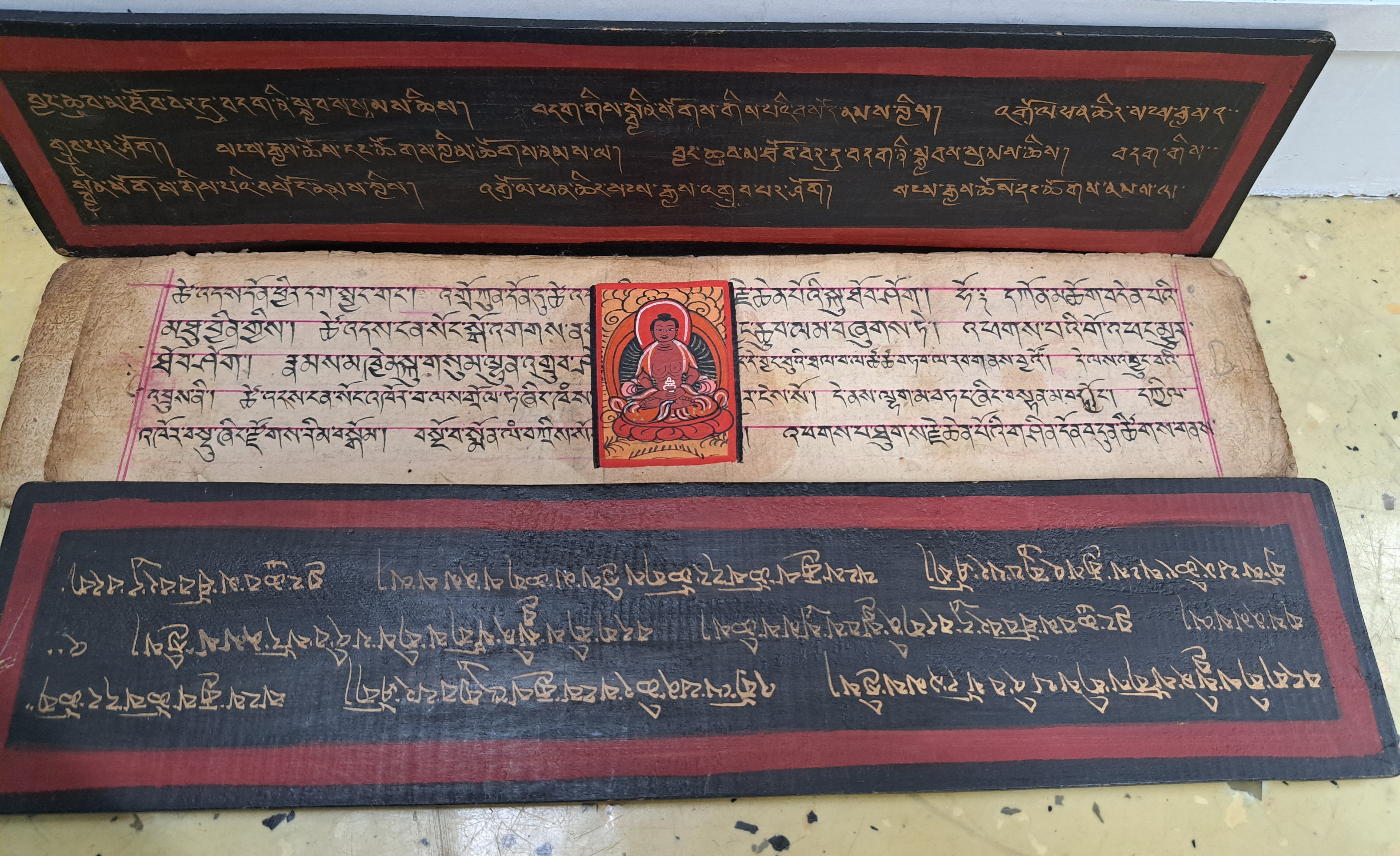 beidseitig beschriftet und teilweise mittig mit Buddhadarstellung, 41 x 9.5cm, Altersschäden