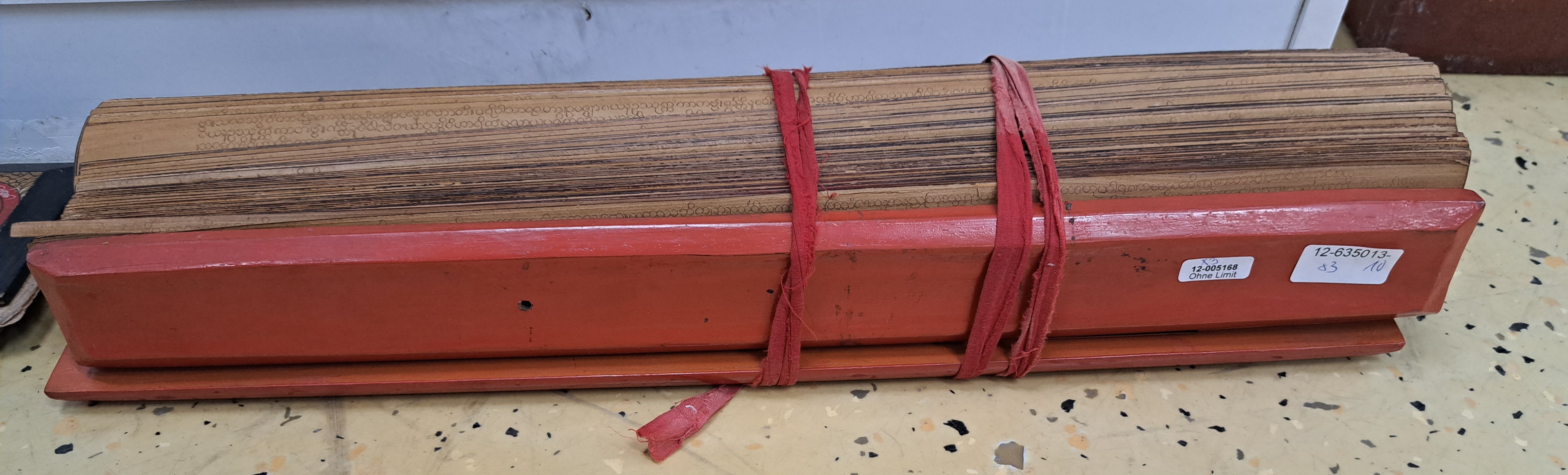 ca. 56.5 x 12.5 cm, Altersspuren, berieben, dazu Palmblattbuch mit Goldschnitt, beschriftet,