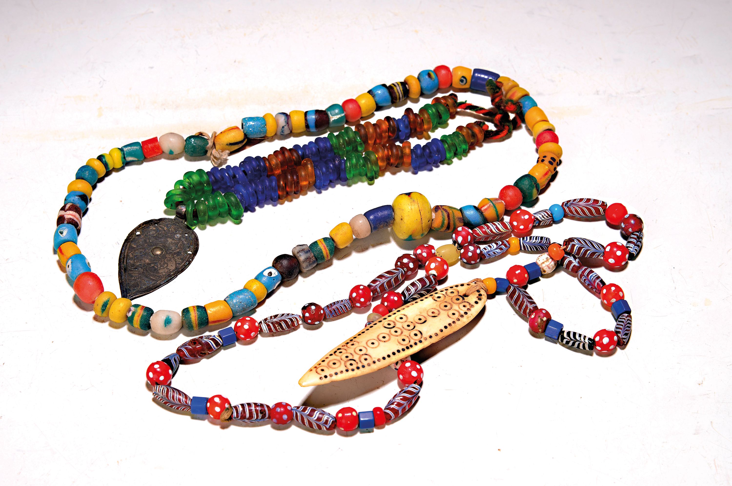 Drei Ketten, Afrika, 20.Jh., mit Glasperlen, z.T. mit eingekämmten Mustern z.T.