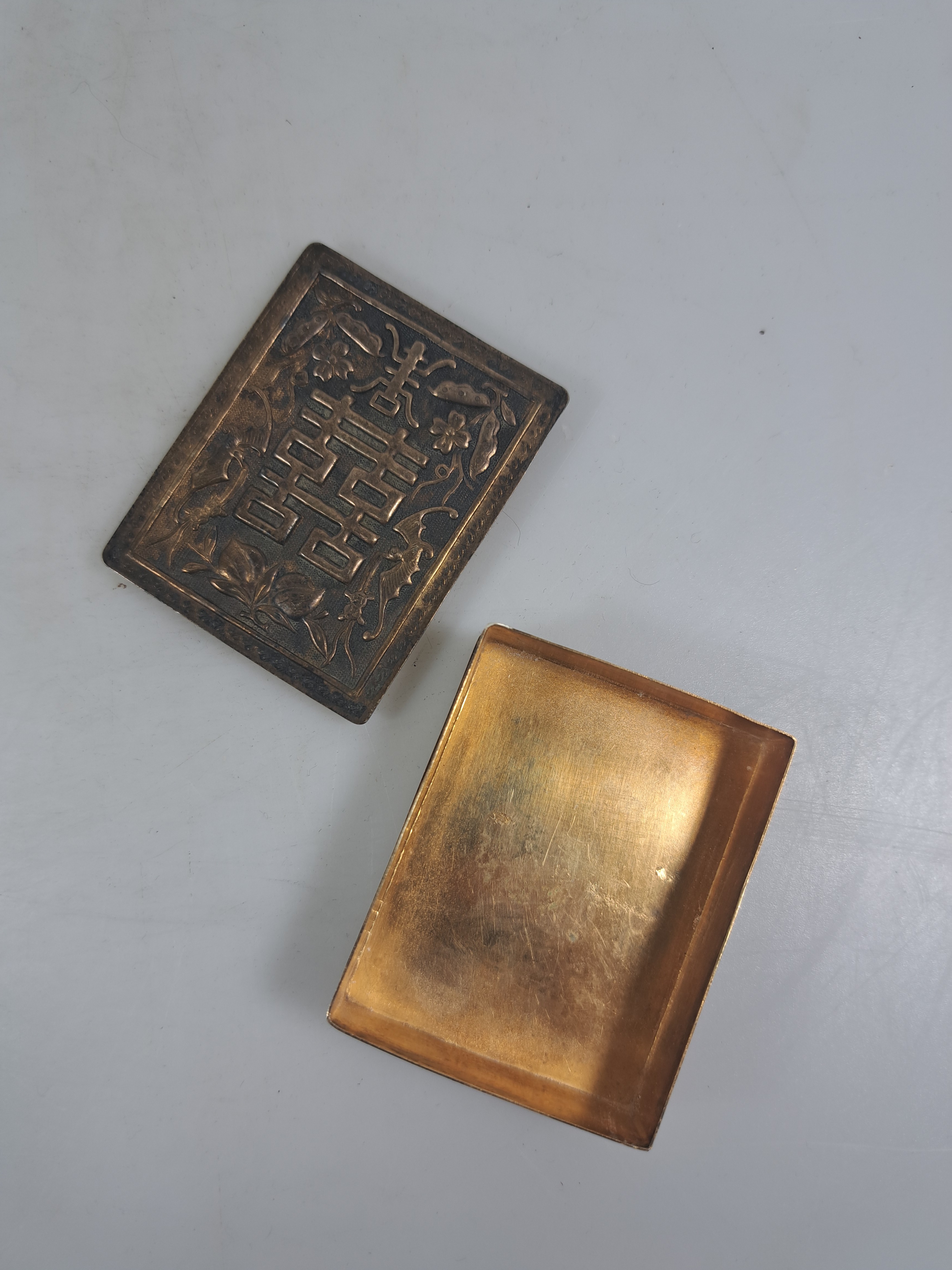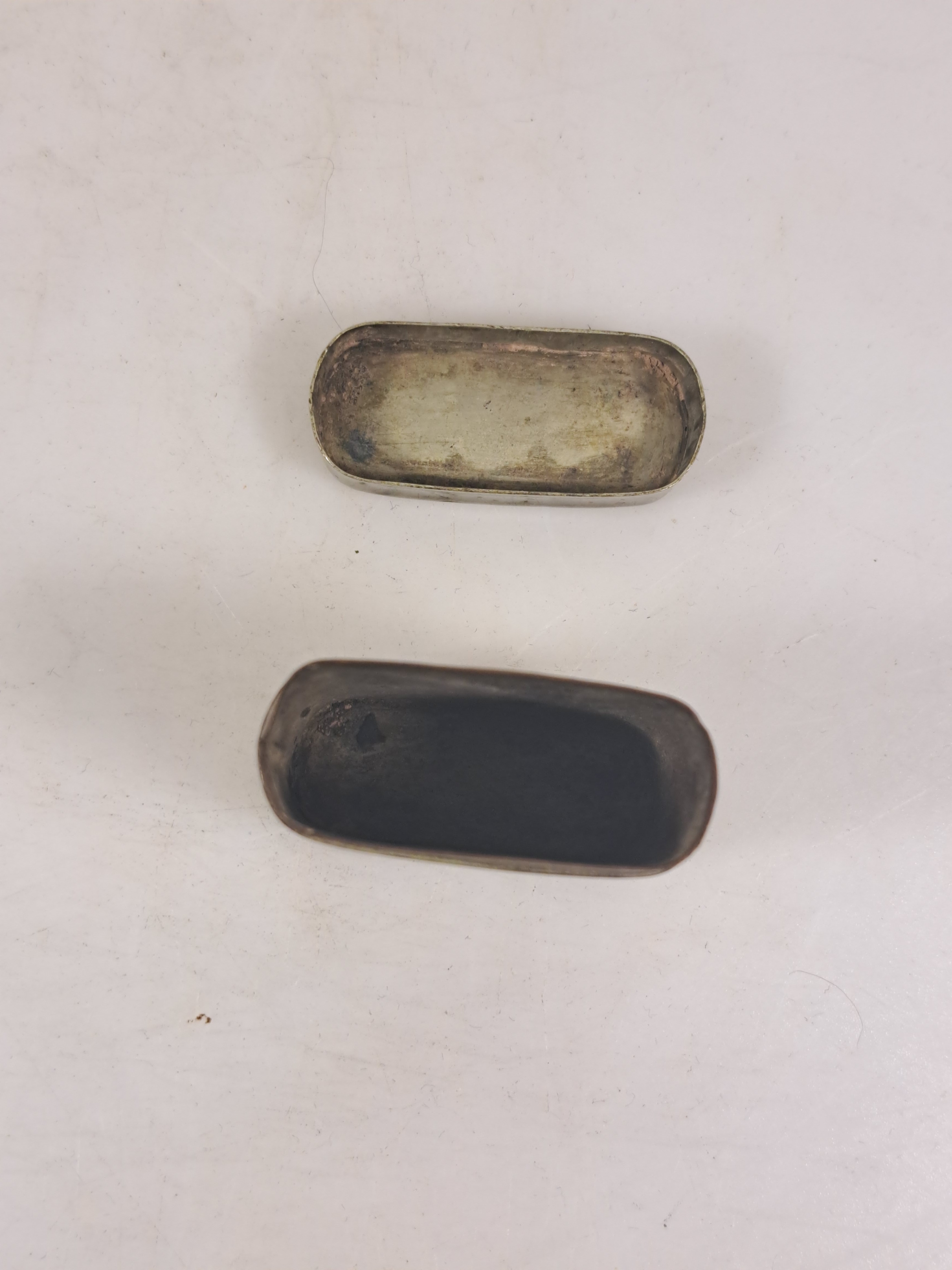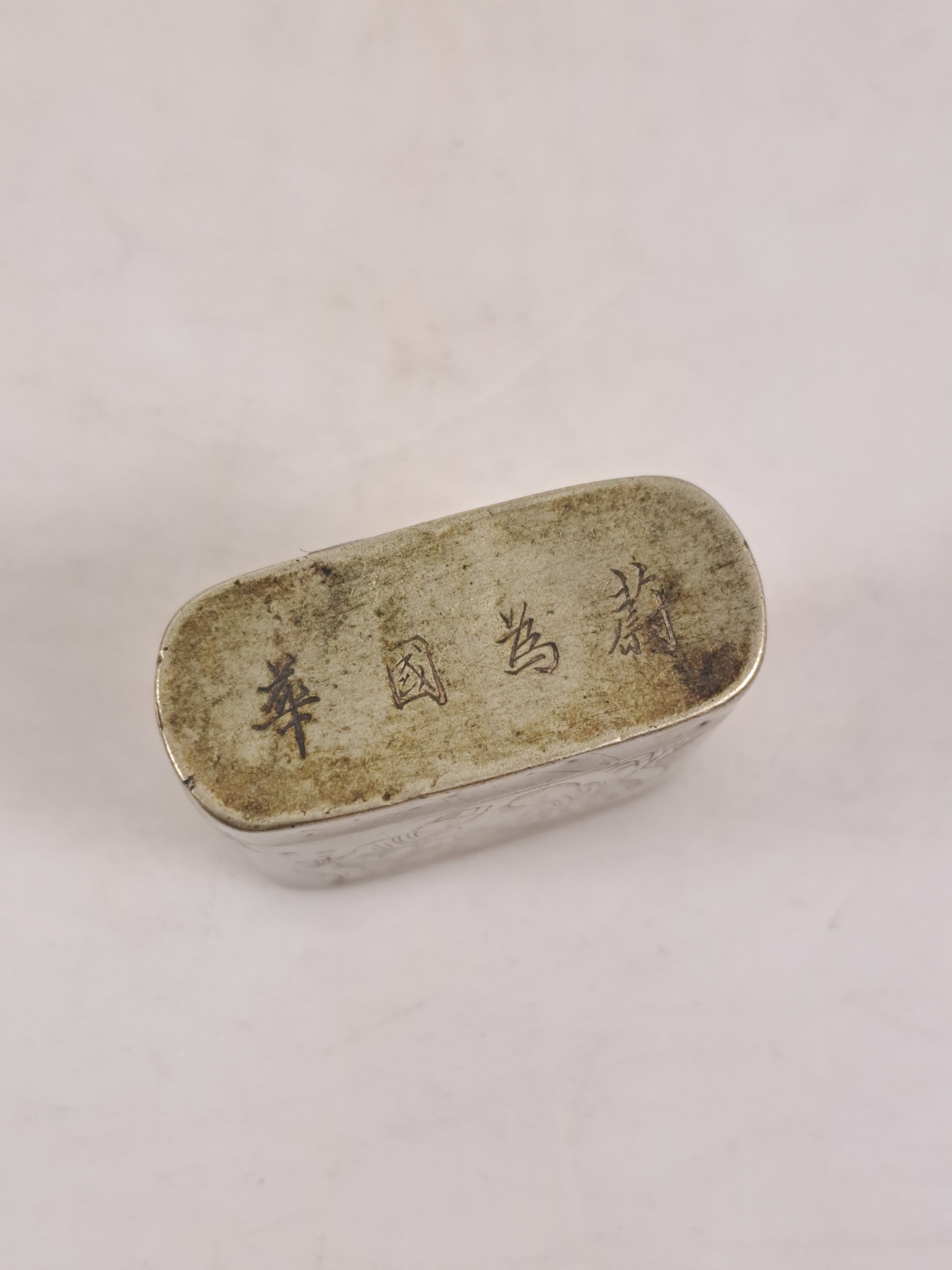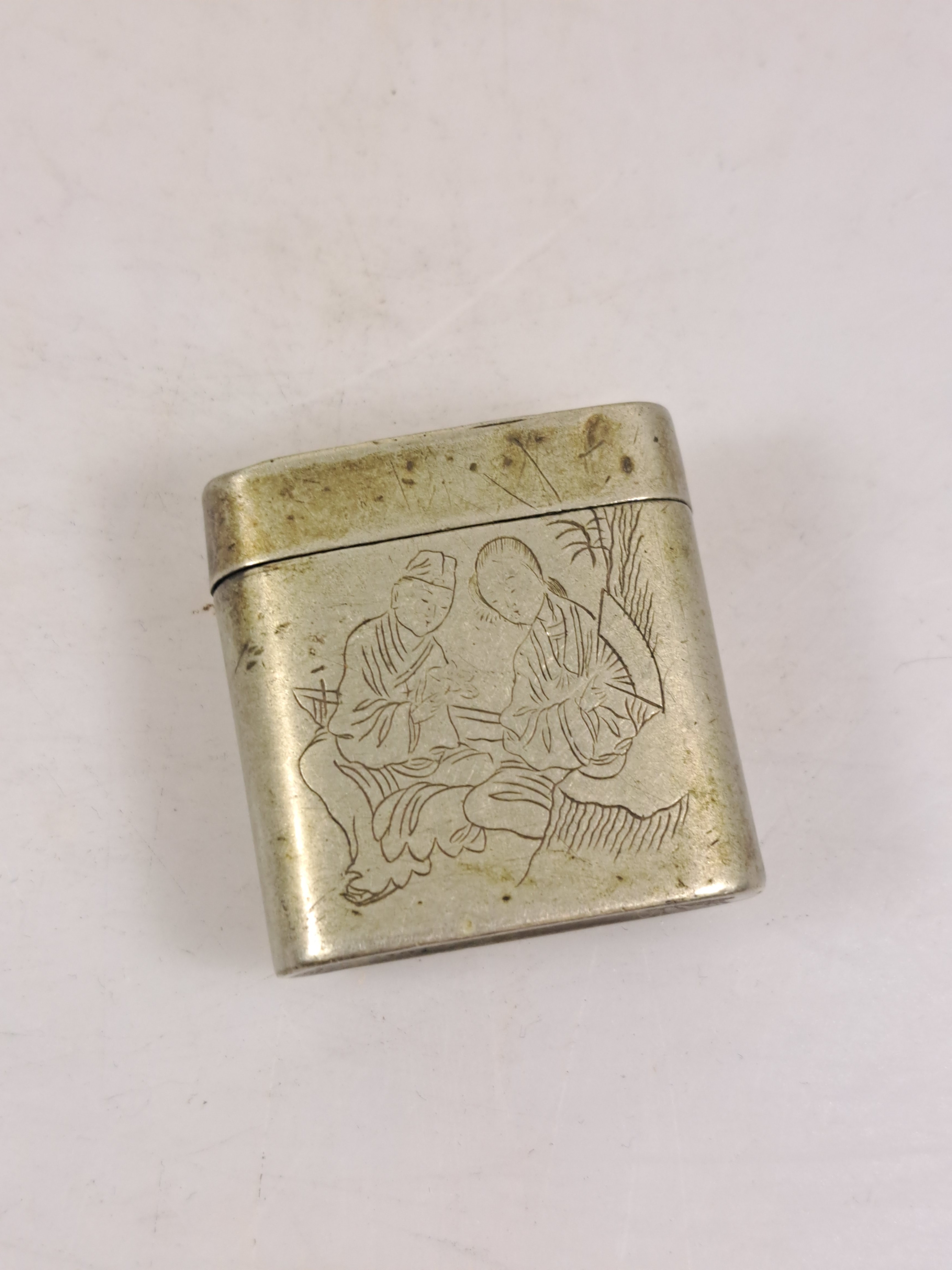 Opiumdose mit graviertem Paar dekoriert, H. ca. 4 cm; Tintendose wohl Kupfer versilbert,