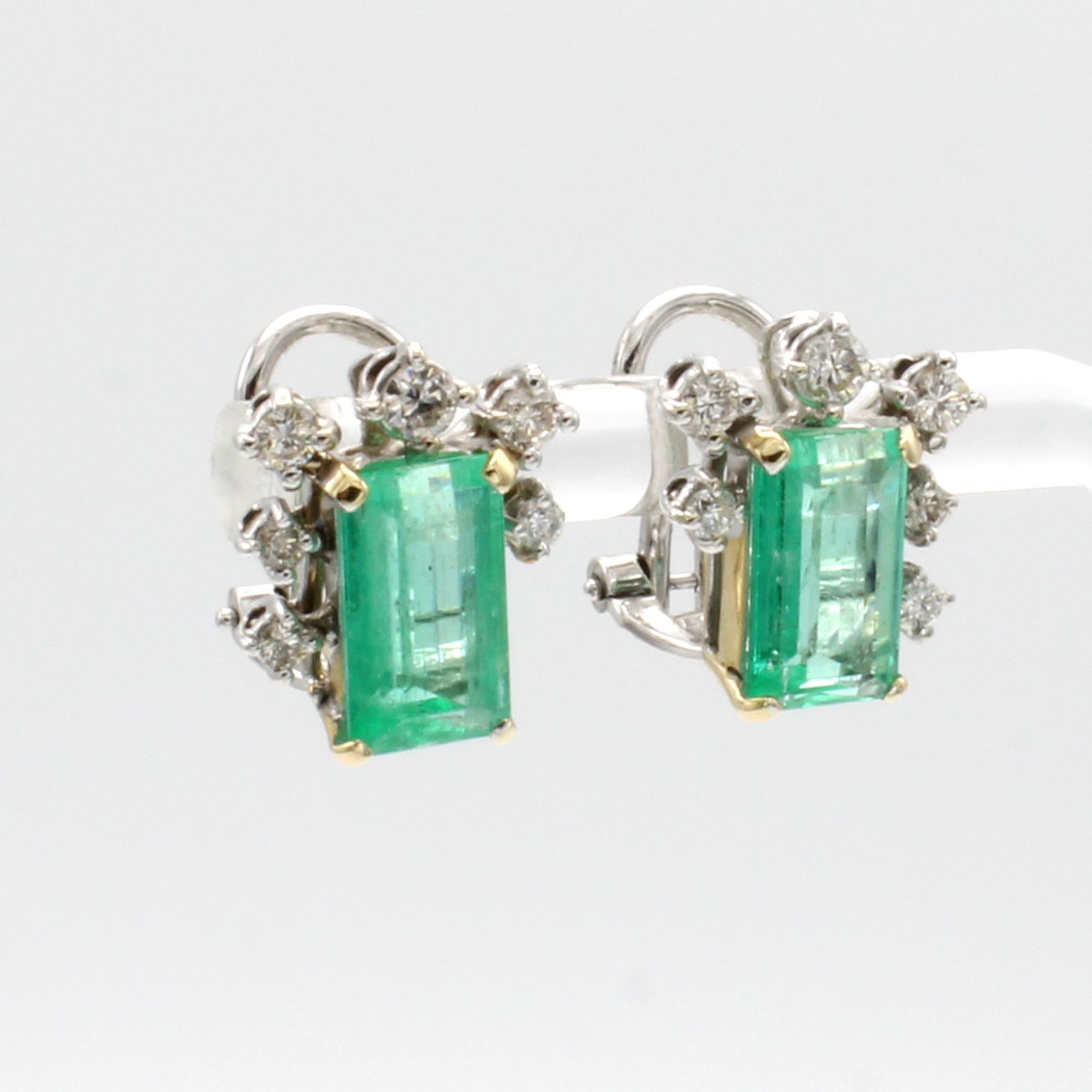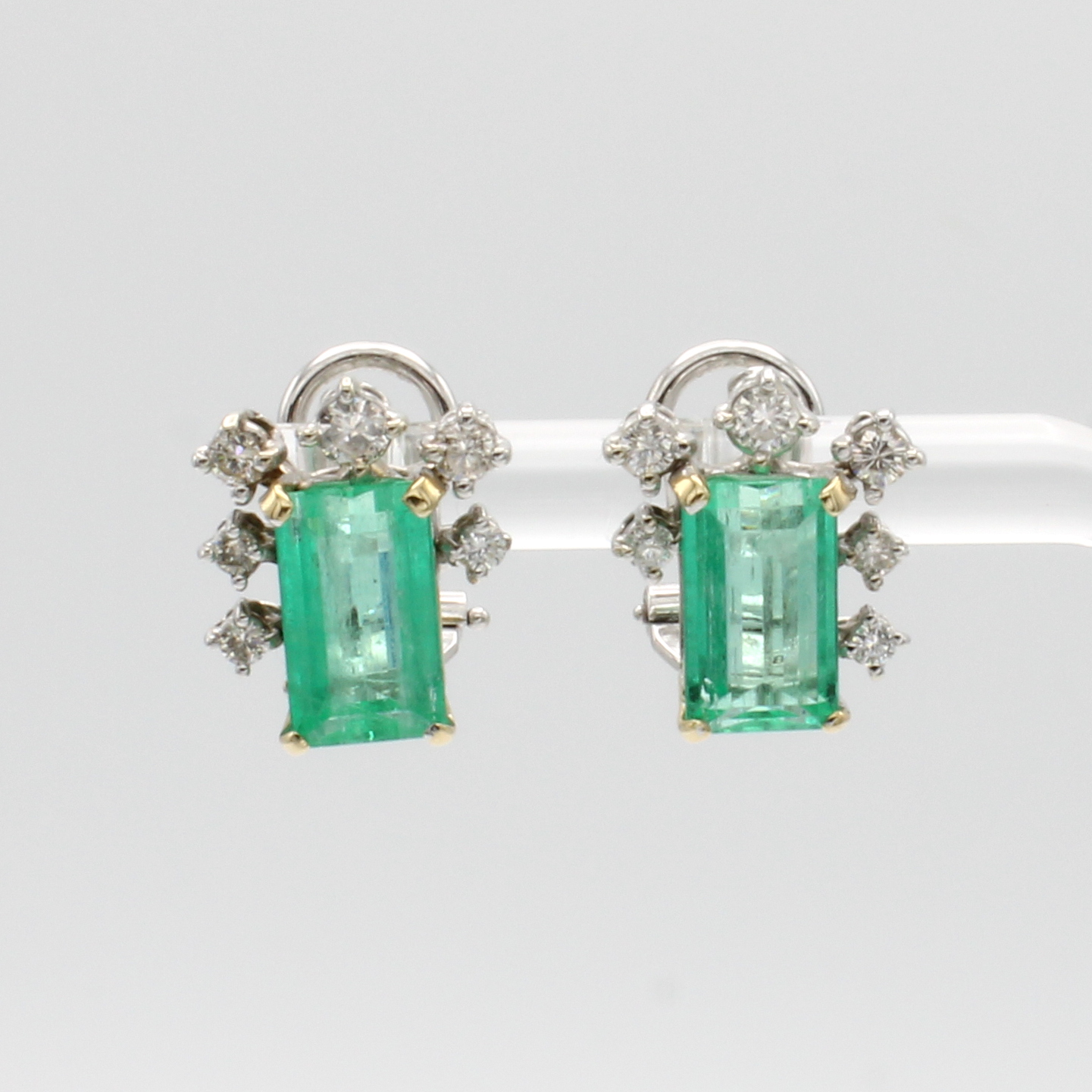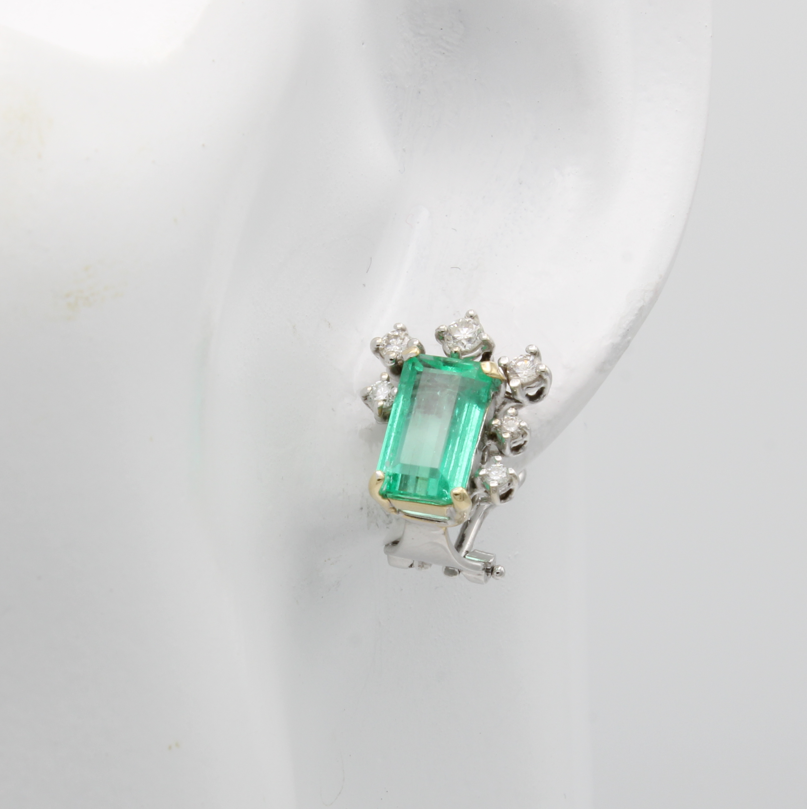 Paar Ohrstecker mit Smaragden und Brillanten, WG 585/000, 2 achteck. Smaragde zus. ca. 4.01 ct, Brill. zus. ca. 0.50 ct Weiß/si, m. Clipbrisur Schätzpreis: 7500, - EUR