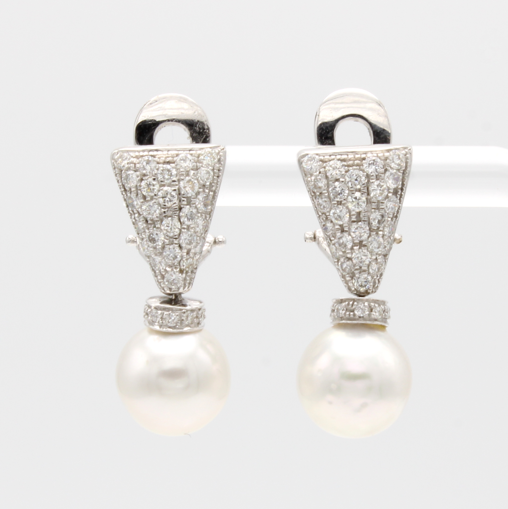 Paar Ohrstecker mit Südseeperle und Brillanten, WG 750/000, 2 weiße-graue Perlen als Abhängungen ca. 9.5 mm, Brill. z.T. in dreieck. Elementen gef. zus. ca. 0.95 ct Weiß/si, mit Clipbrisur Schätzpreis: 4680, - EUR