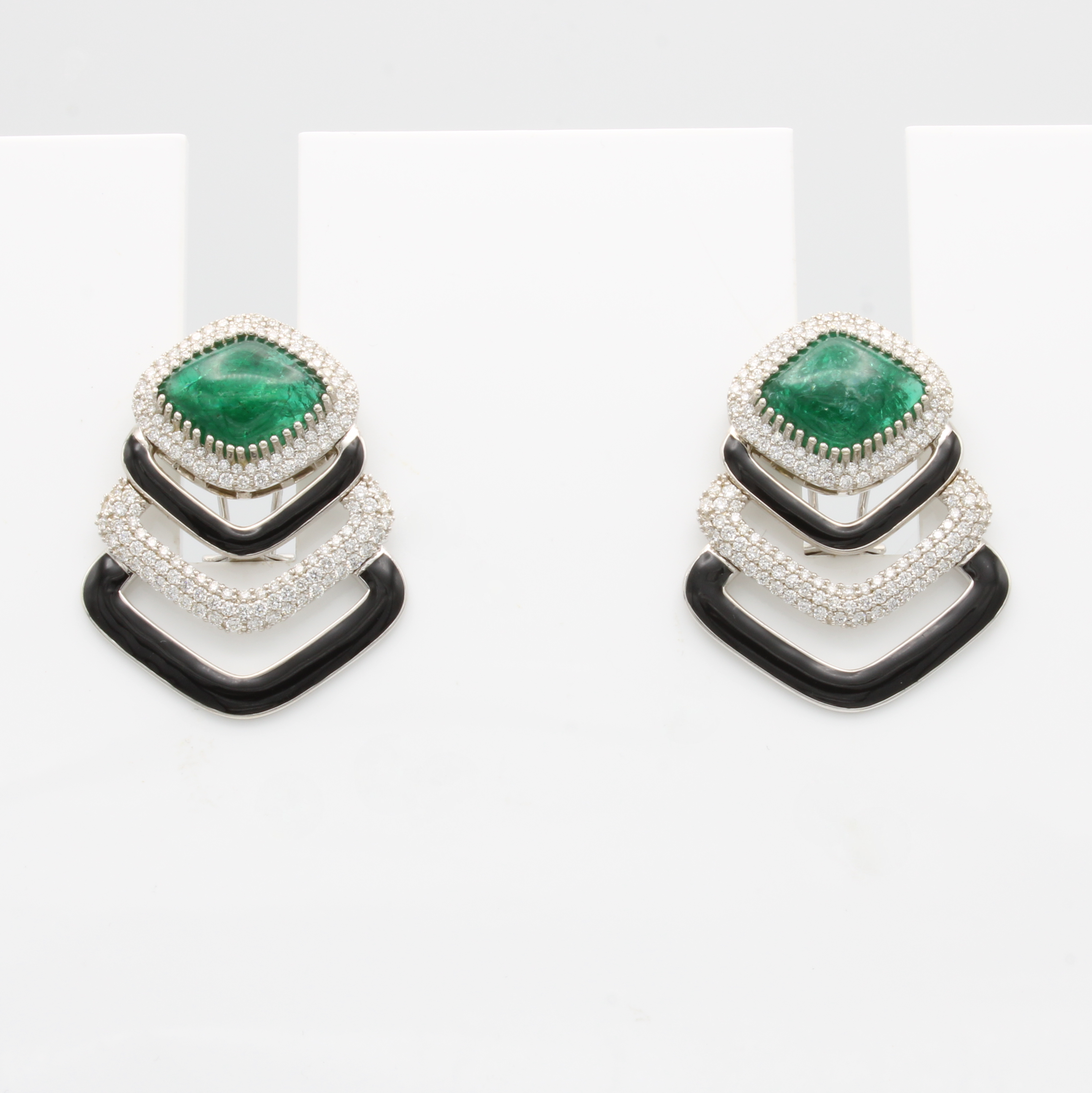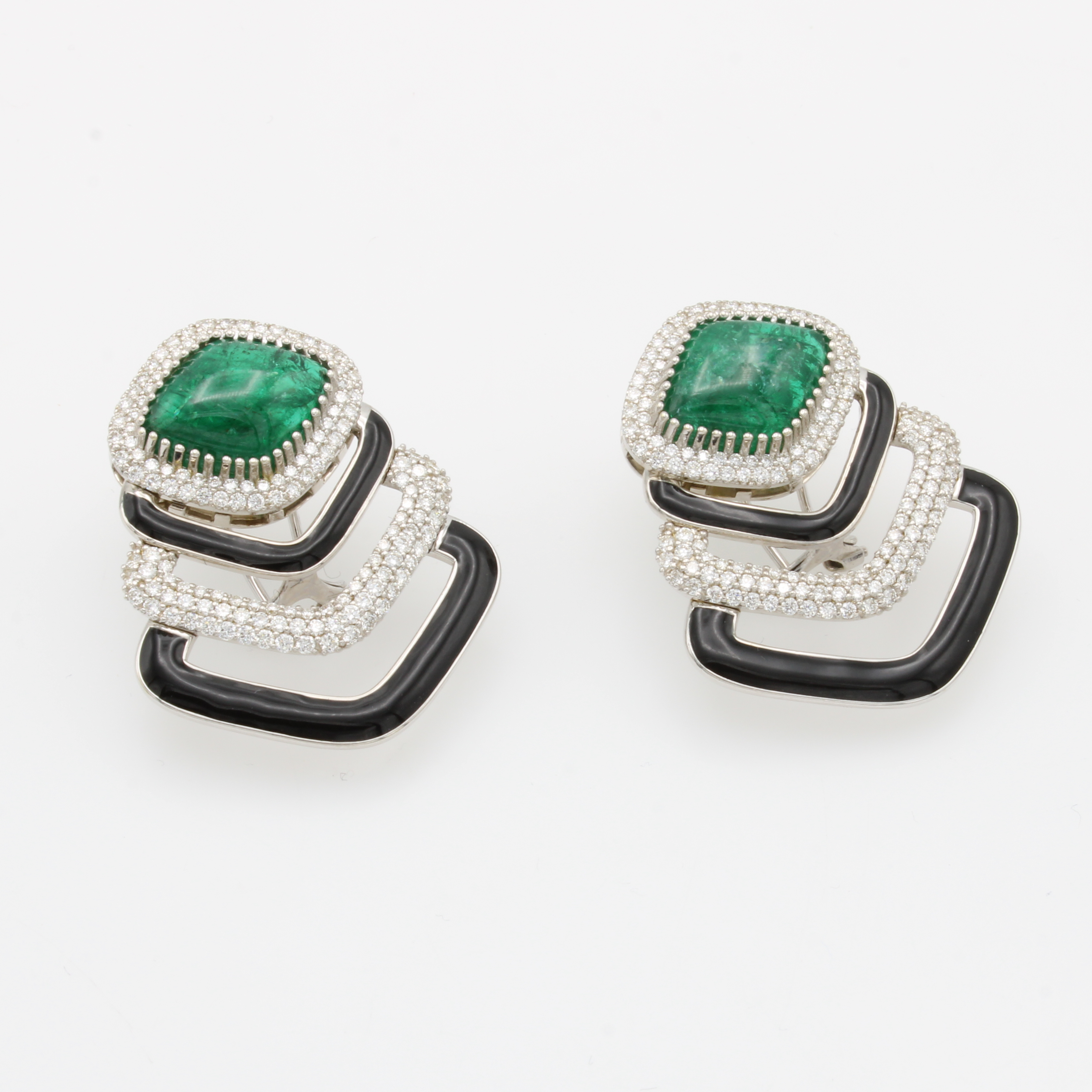 Arbeit, 2 rautenförm. Smaragdcabochons zus. ca. 12.36 ct, Brill. zus. ca. 2.32 ct