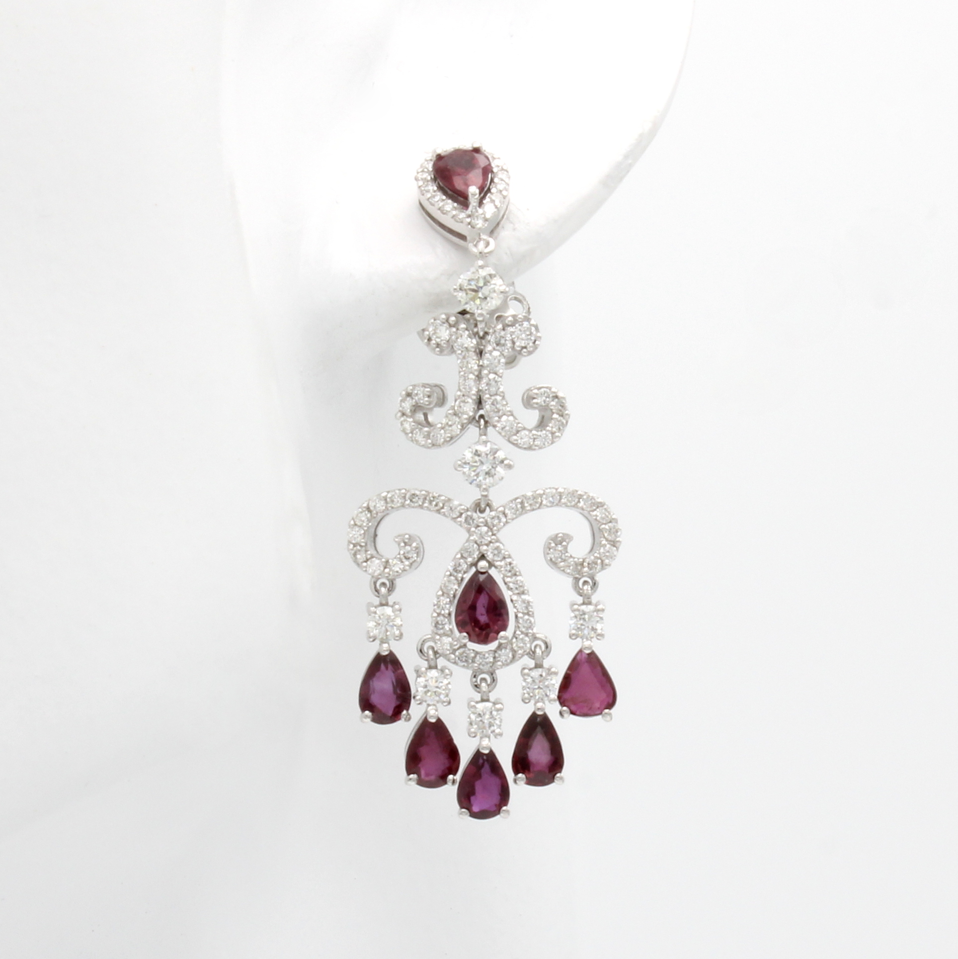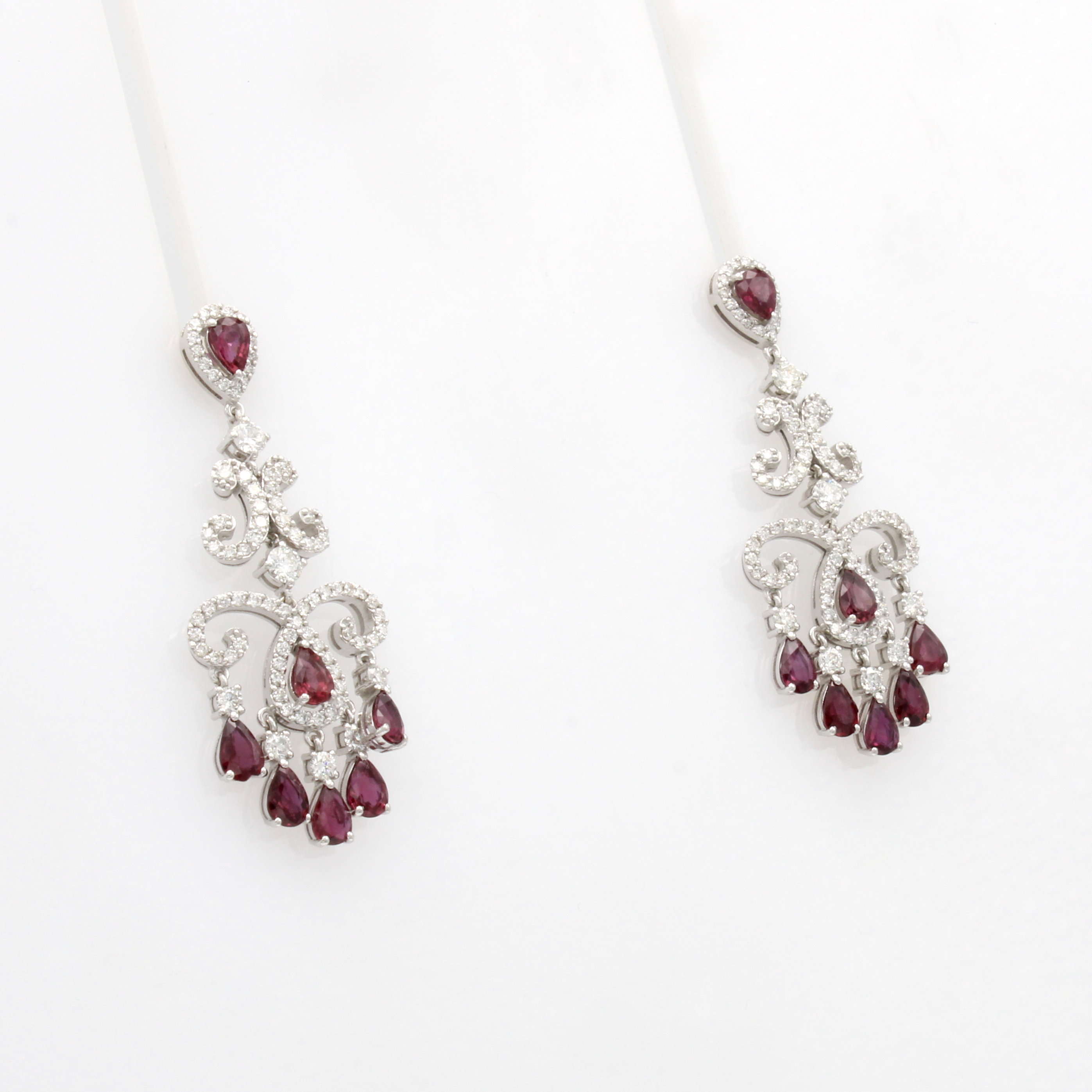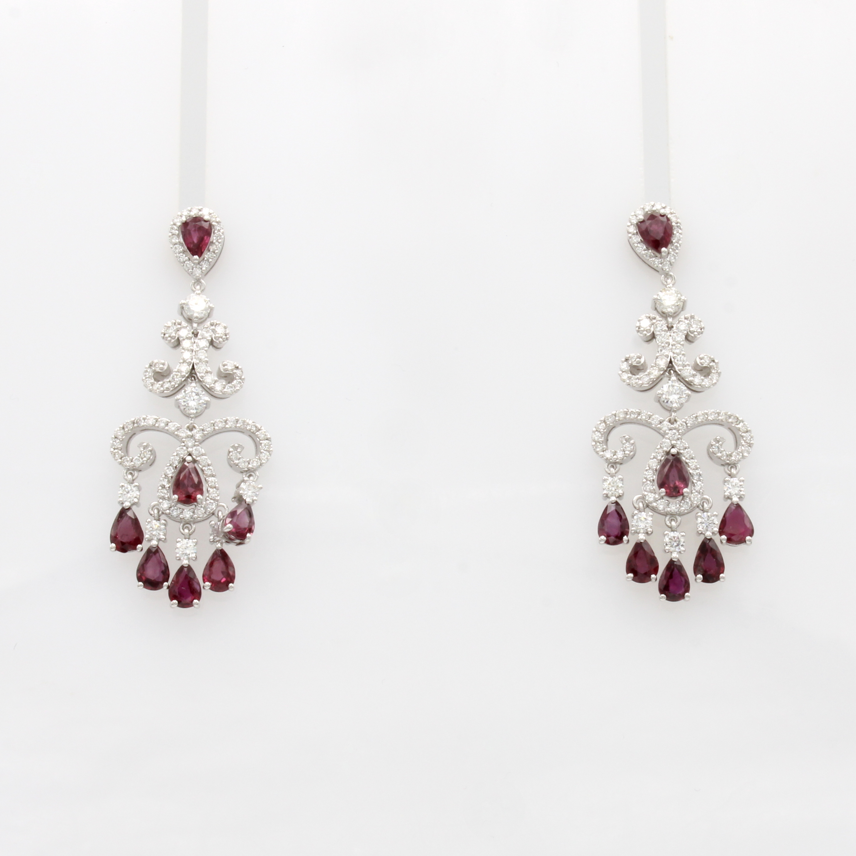 Paar Ohrgehänge mit Rubinen und Brillanten, WG 750/000, verspieltes, ornamentreiches Design, Rubintropfen zus. ca. 4.30 ct, Brill. zus. ca. 1.95 ct Weiß/si-p Schätzpreis: 12120, - EUR